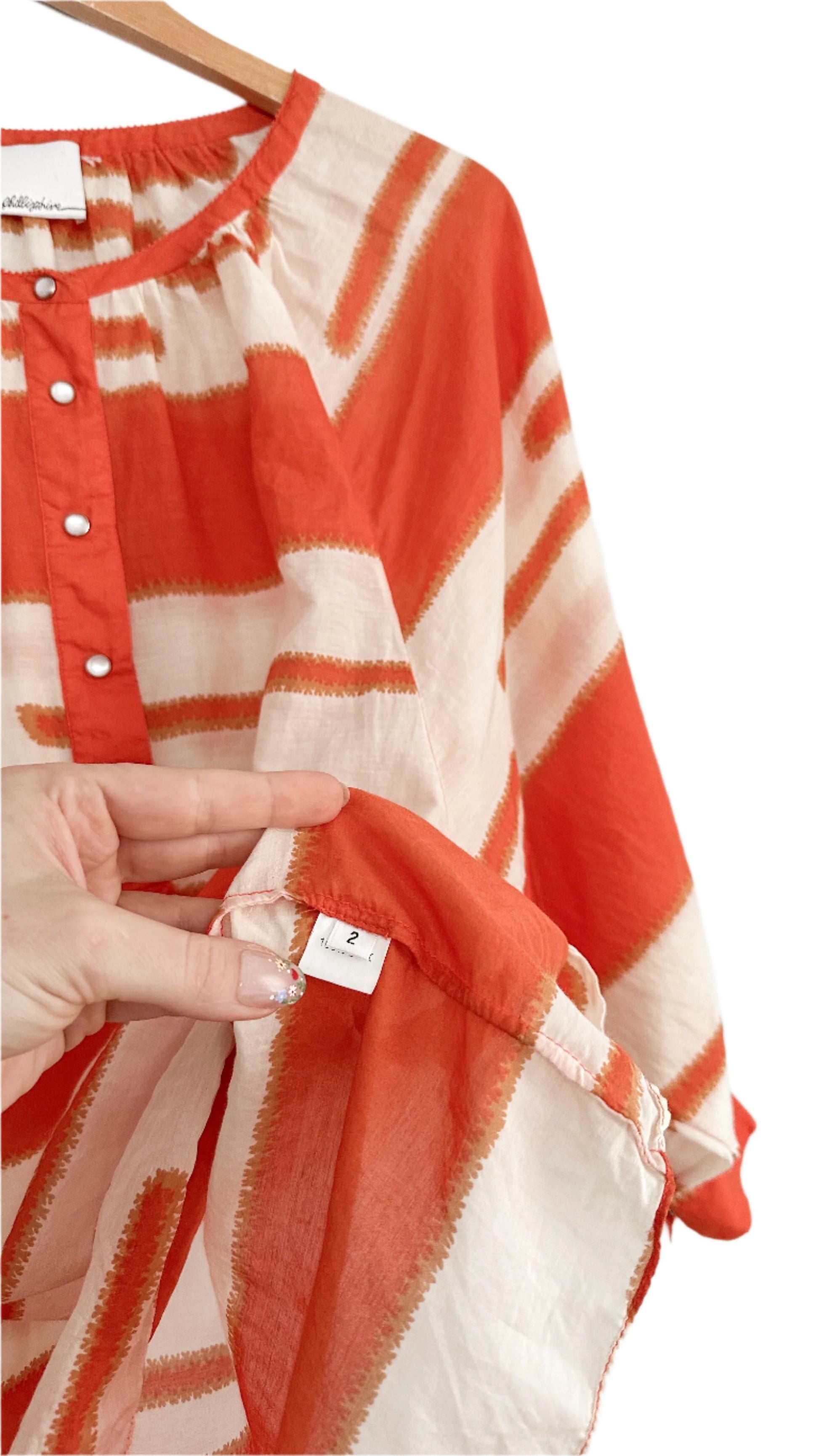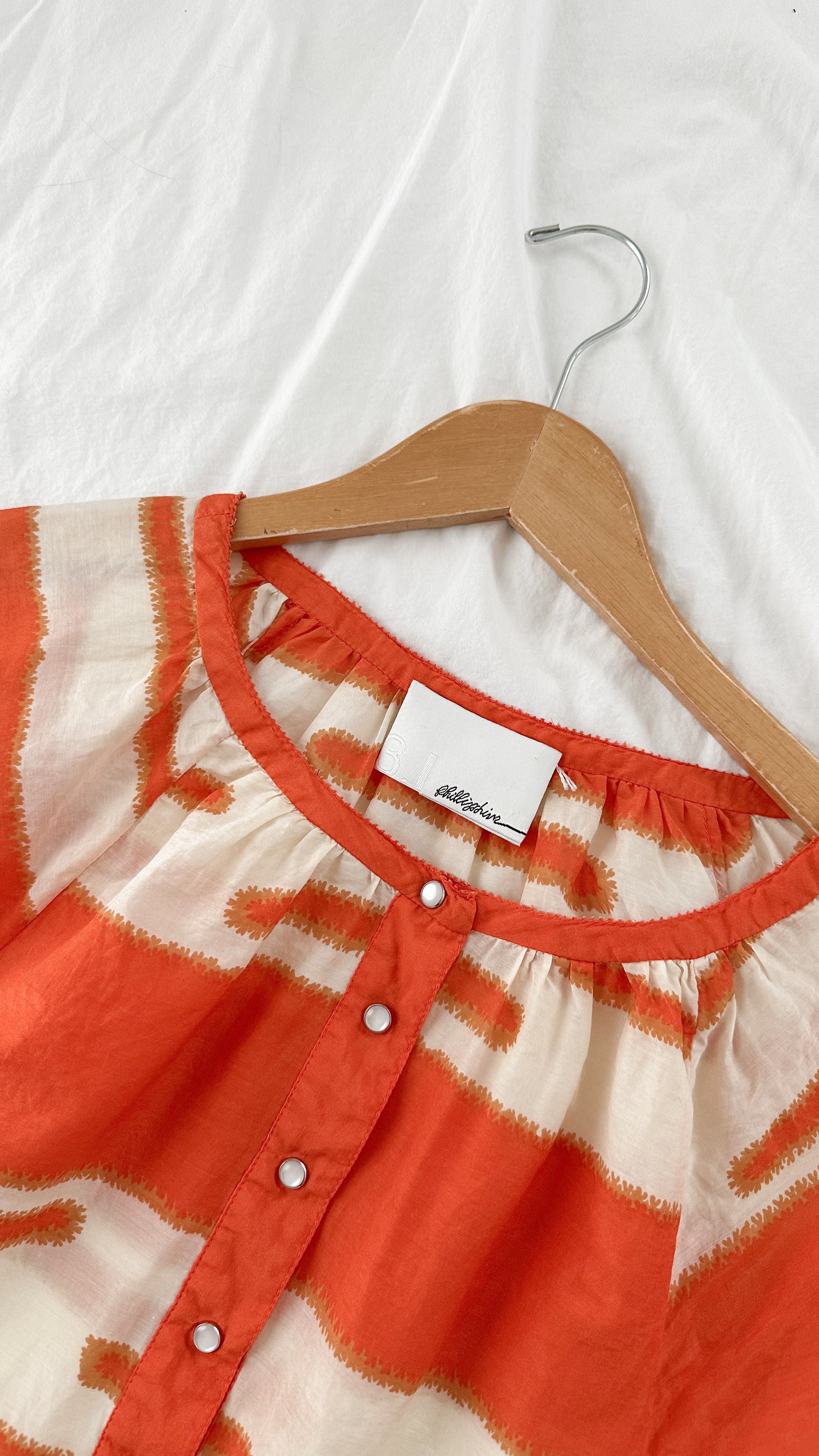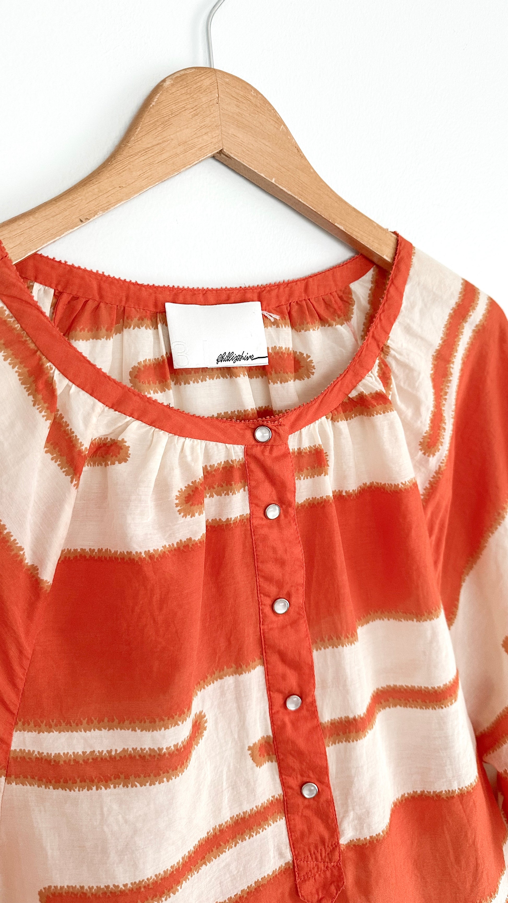 HOW TO STYLE/DETAILS: beautiful silk top by Phillip Lim featuring an orange and cream print, pearlescent snap buttons down the front and on the 3/4 sleeves at the cuffs. Sleeves are billowy creating a peasant/boho style silhouette.