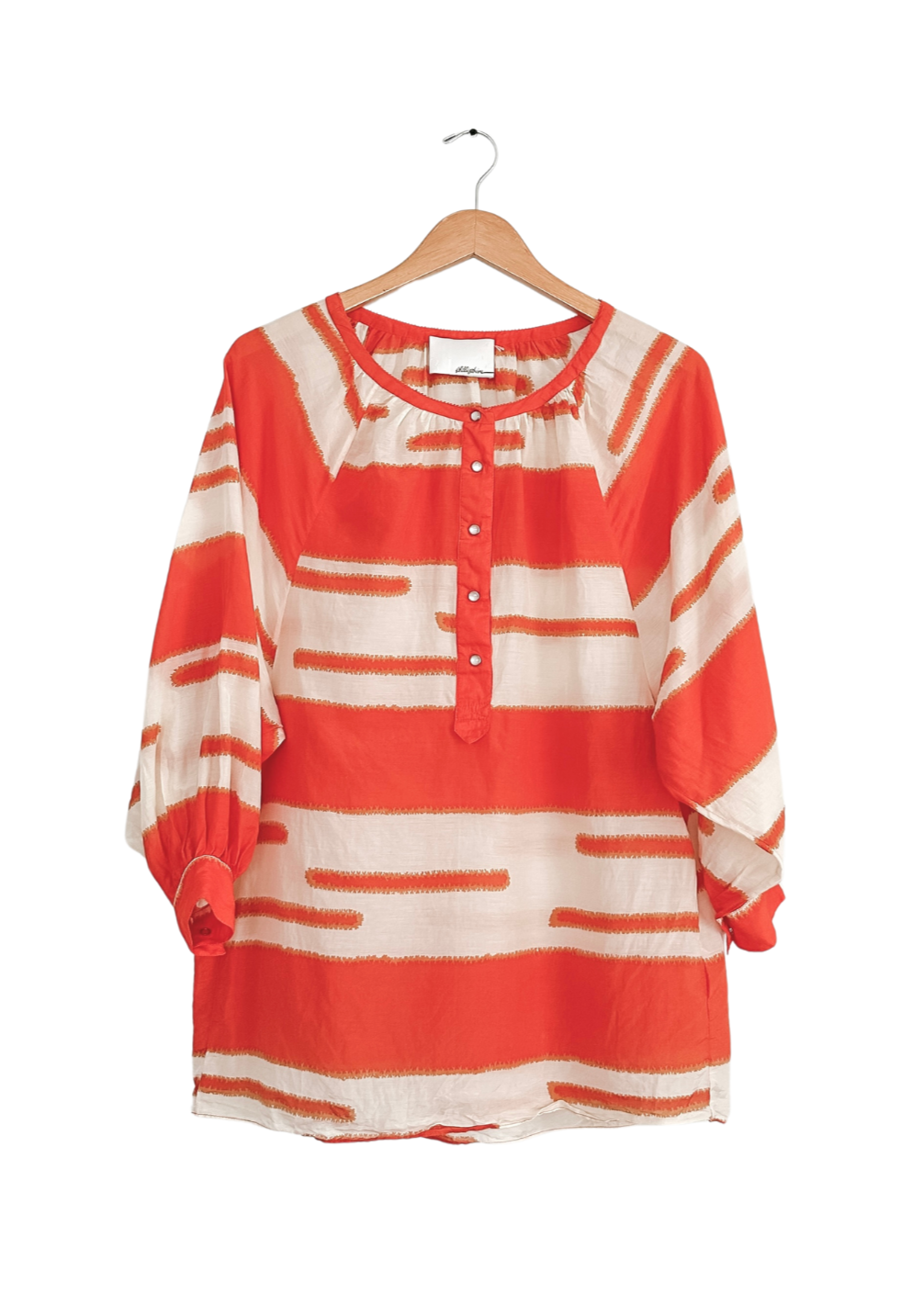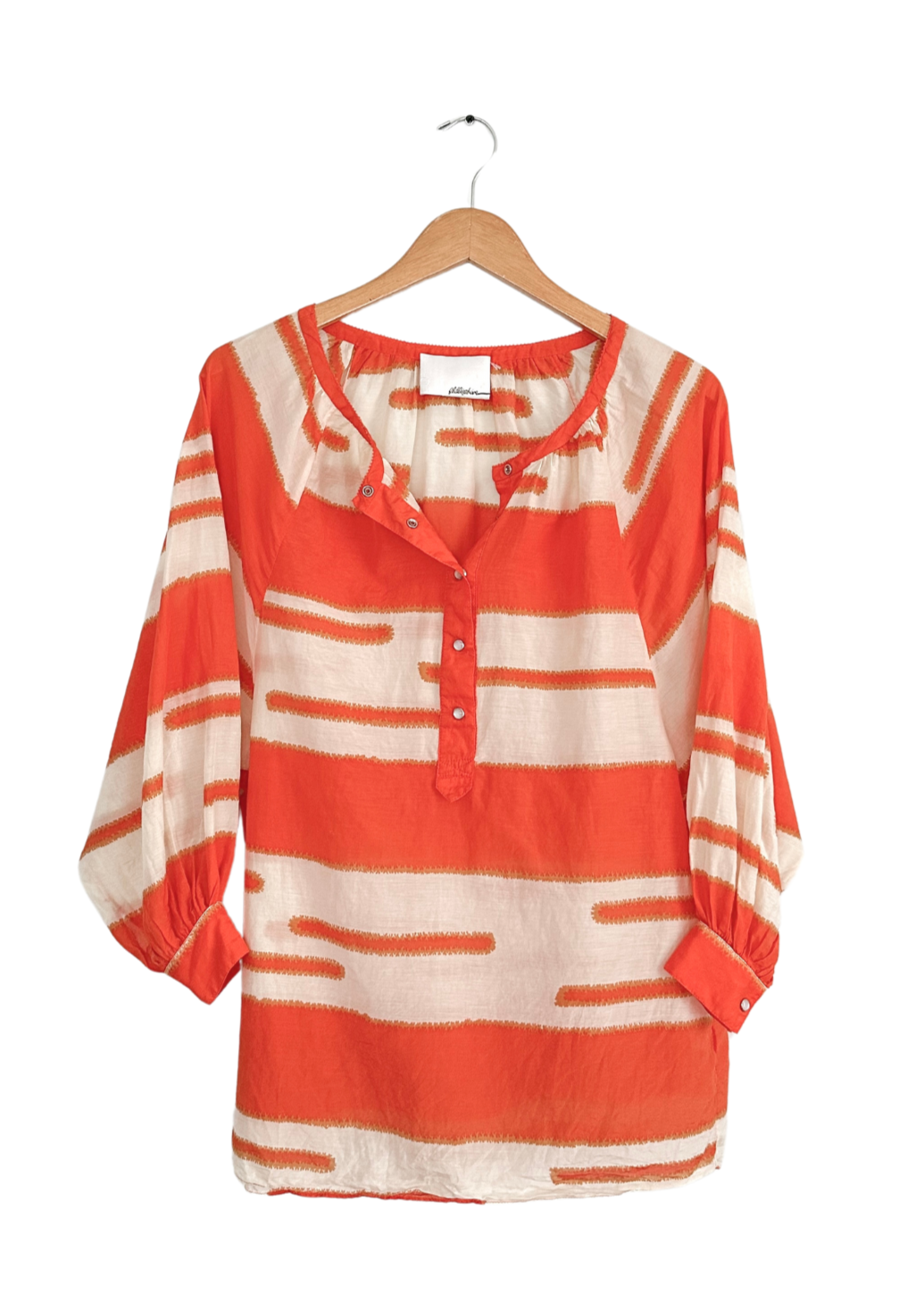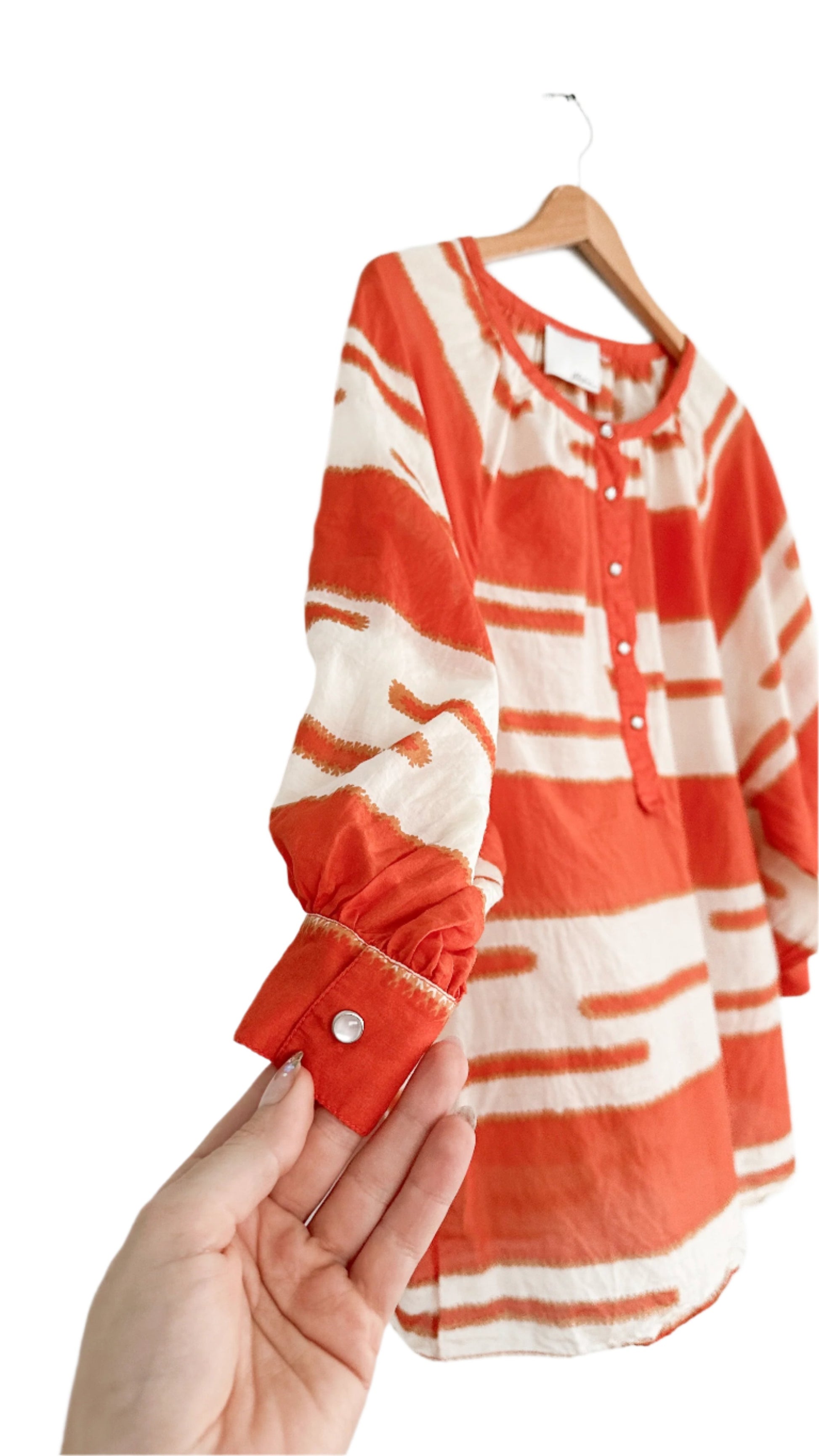 HOW TO STYLE/DETAILS: beautiful silk top by Phillip Lim featuring an orange and cream print, pearlescent snap buttons down the front and on the 3/4 sleeves at the cuffs. Sleeves are billowy creating a peasant/boho style silhouette.