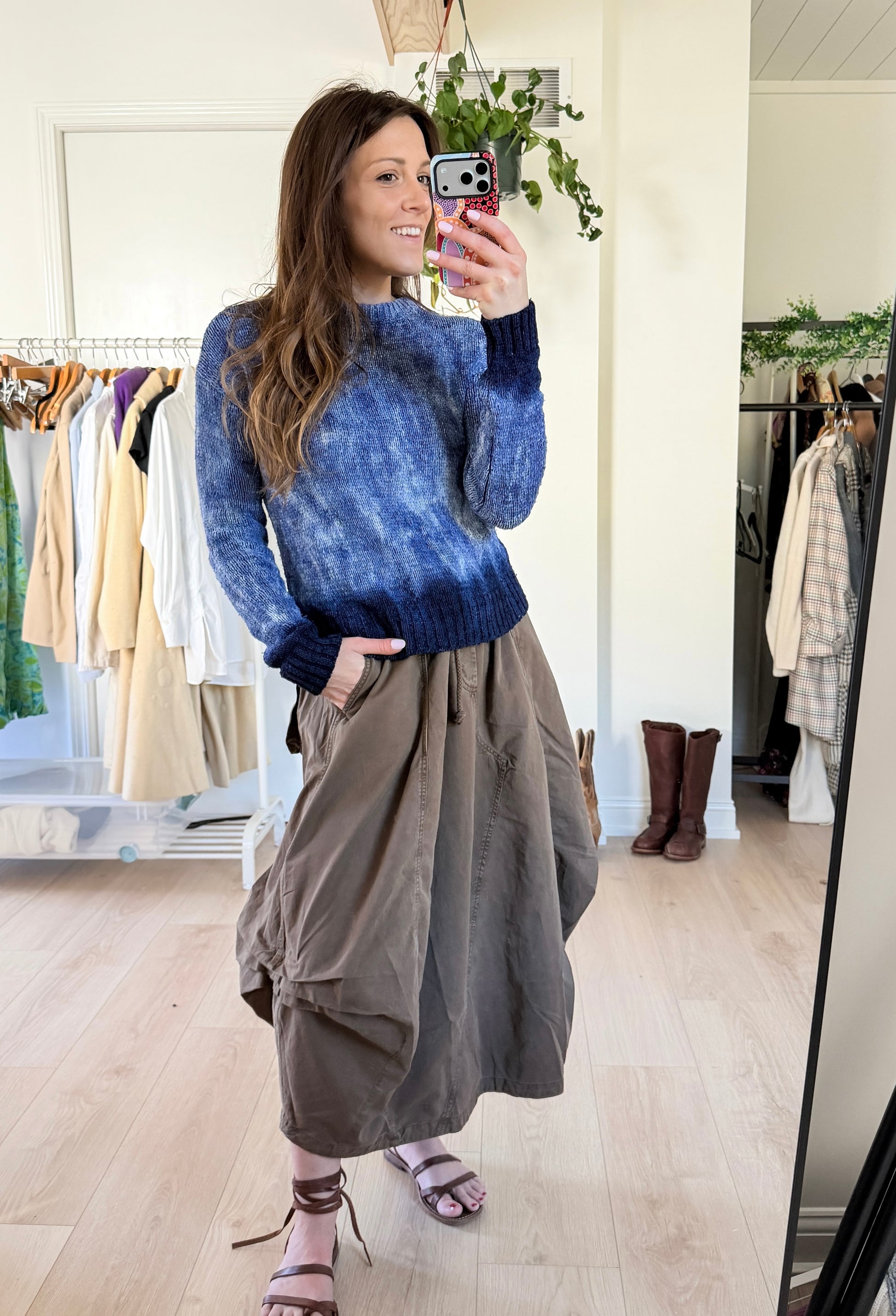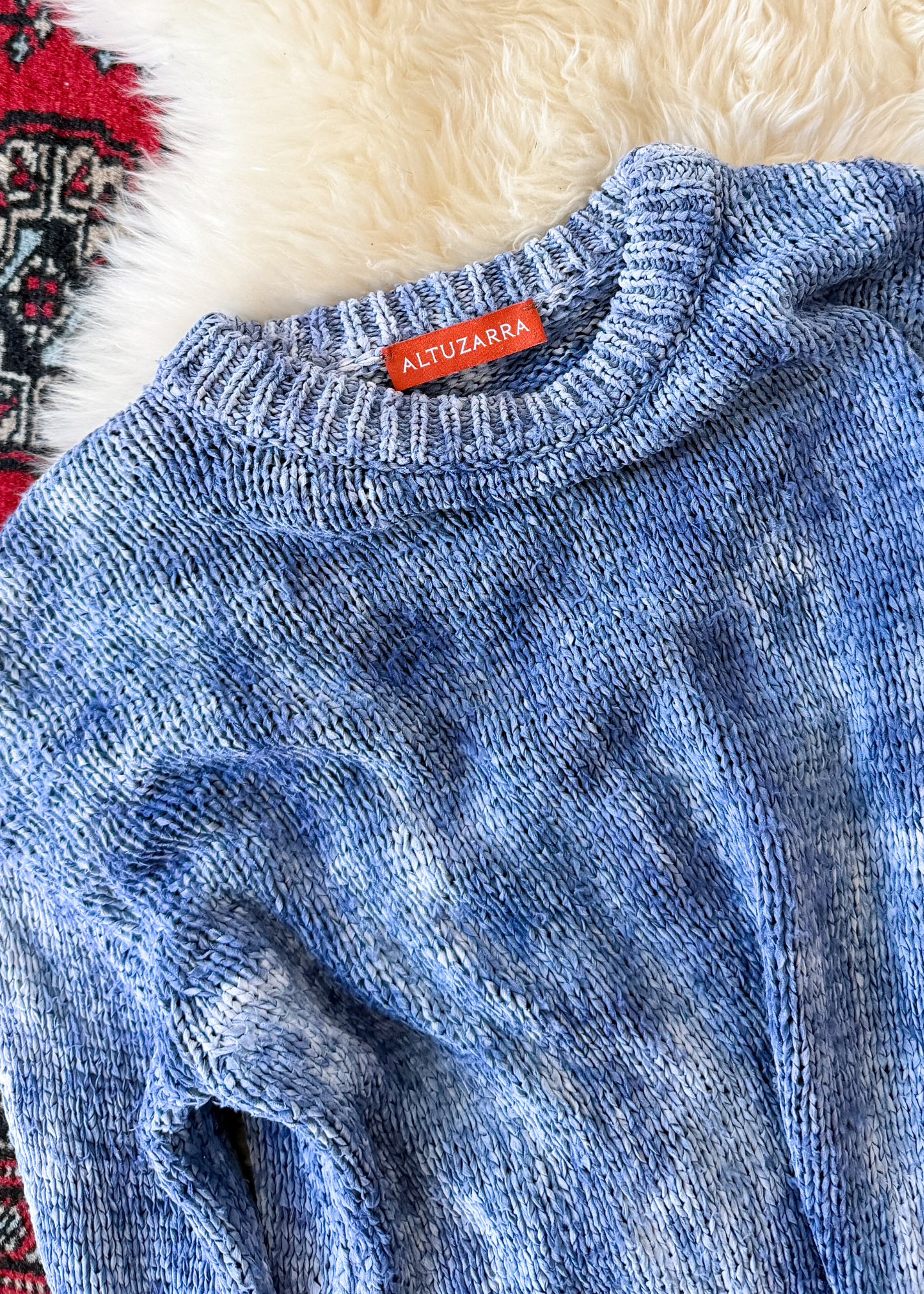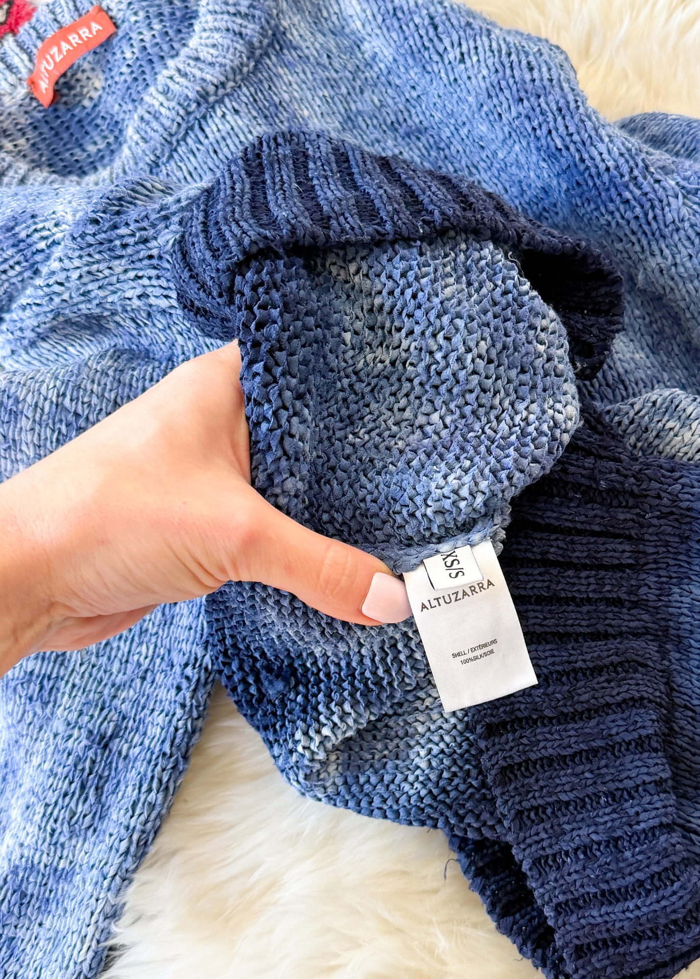 DETAILS: stunning silk knit from luxury designer Altuzarra that is hand-dyed in an all over white/blue fading in to navy blue design. Retailed for almost $1000!
