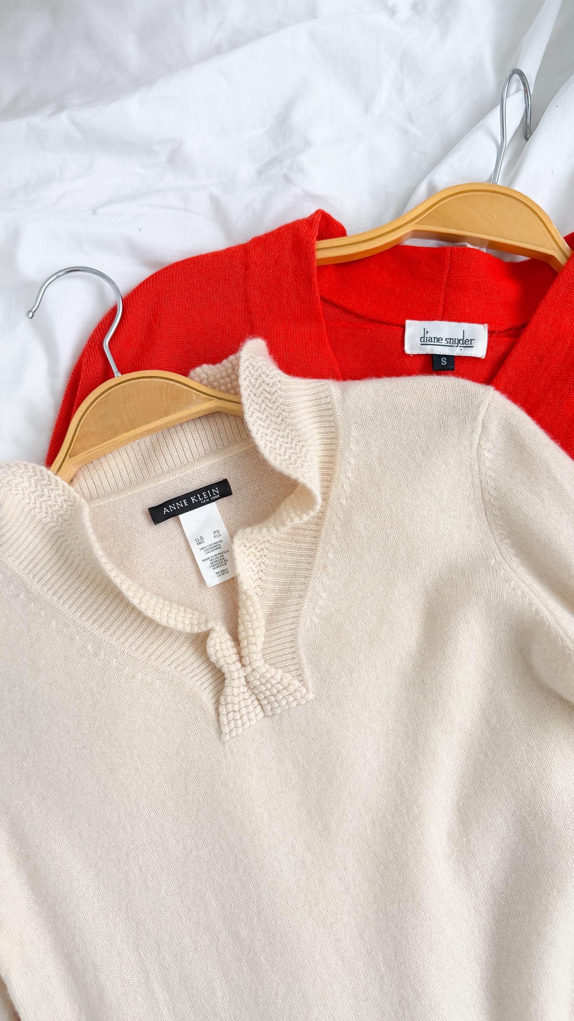 DETAILS: beautiful cream cashmere knit top features a unique textured rolled collar, bracelet length sleeves and ribbed contrasting along the hem and cuffs.