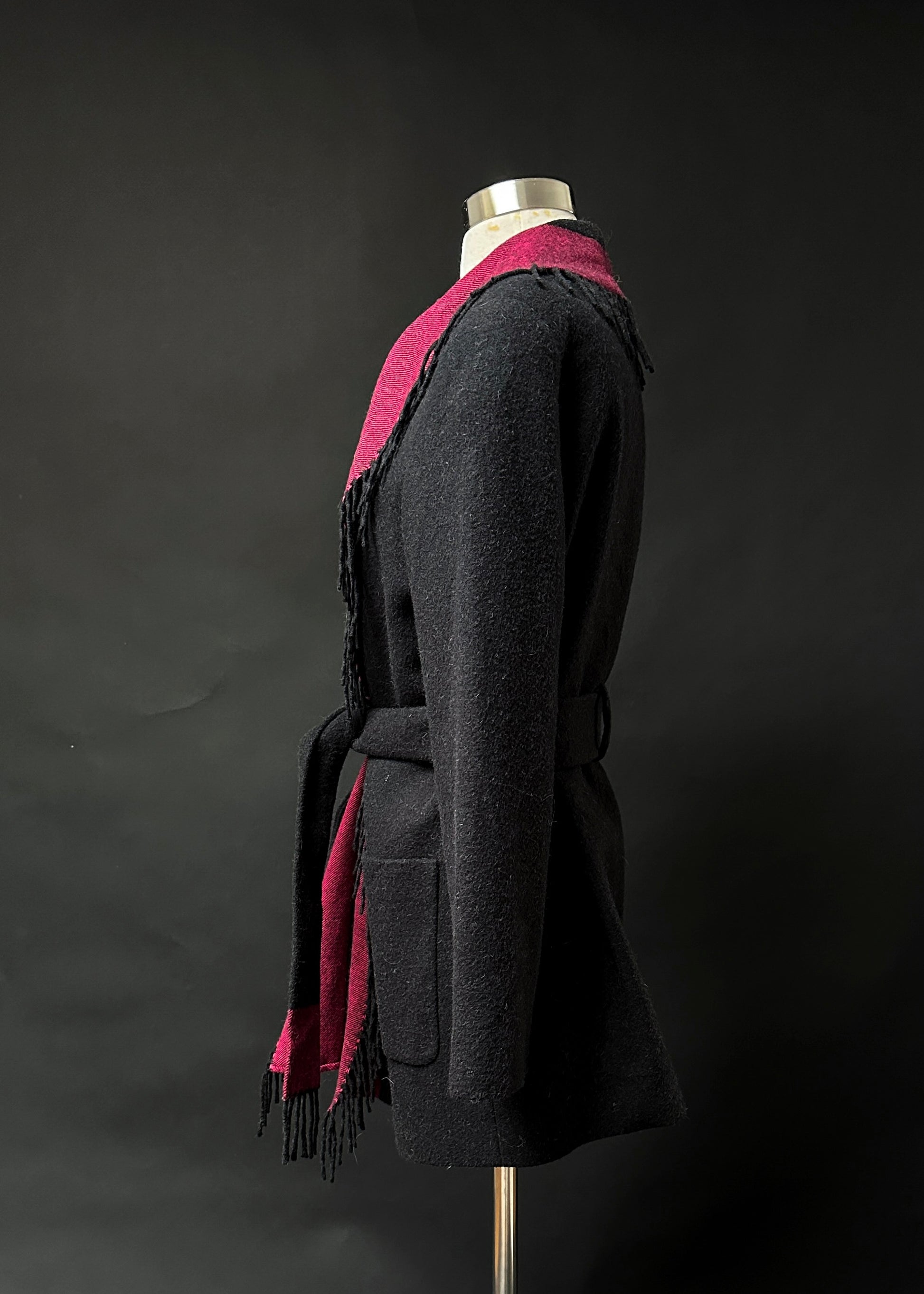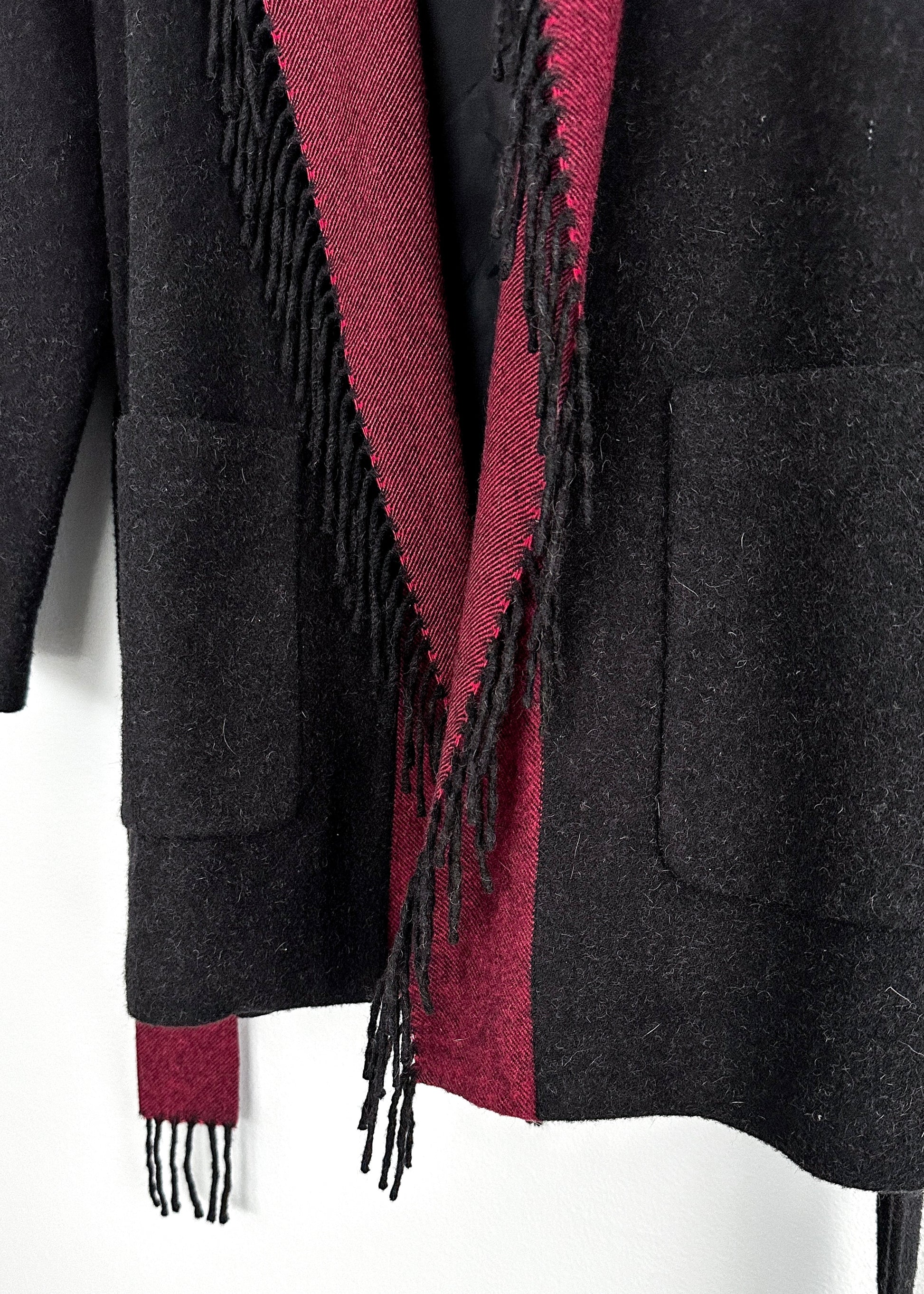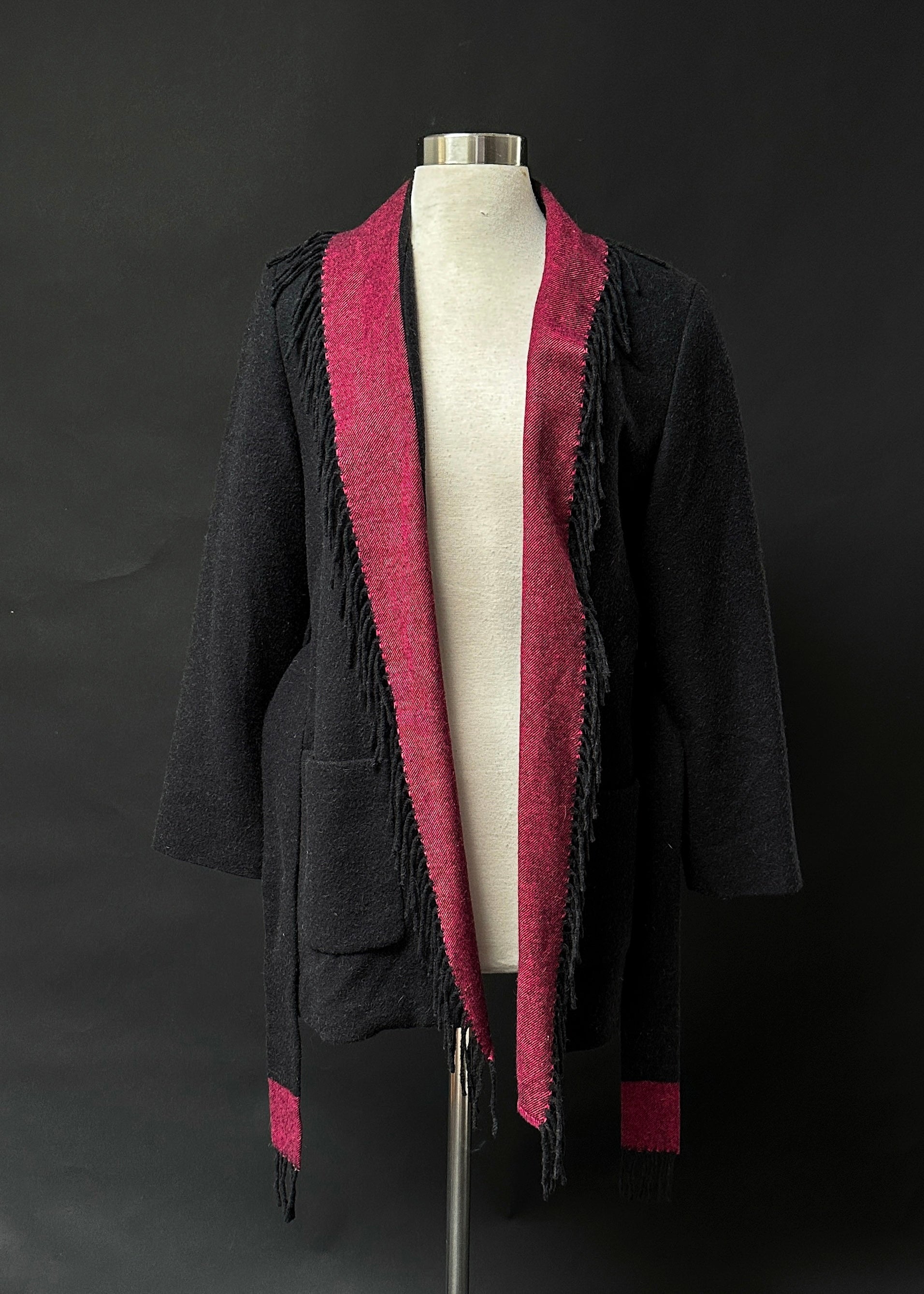 HOW TO STYLE/DETAILS: beautiful camel hair cardigan jacket features fringe around the trim, pockets at the sides and a sash belt.