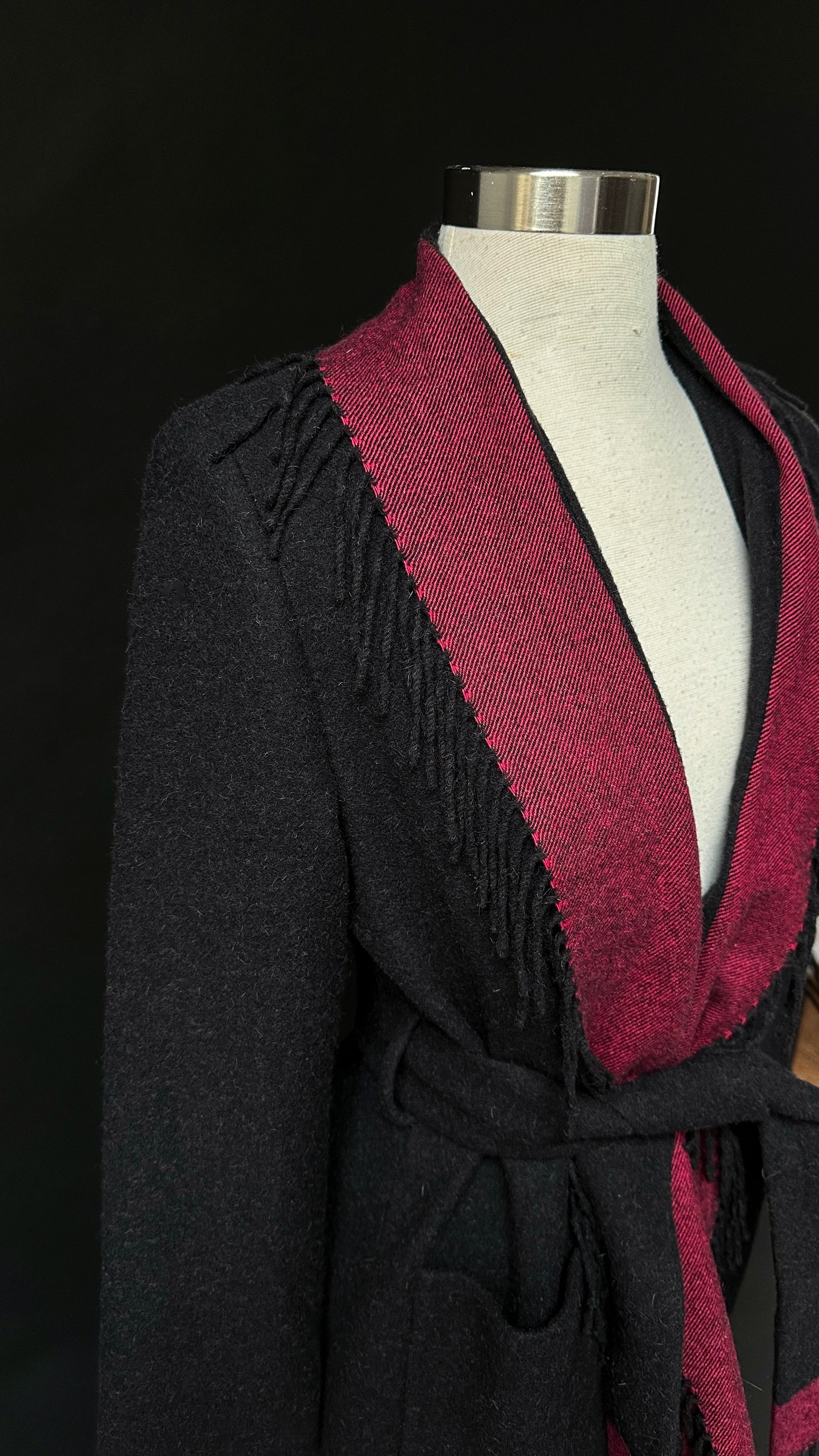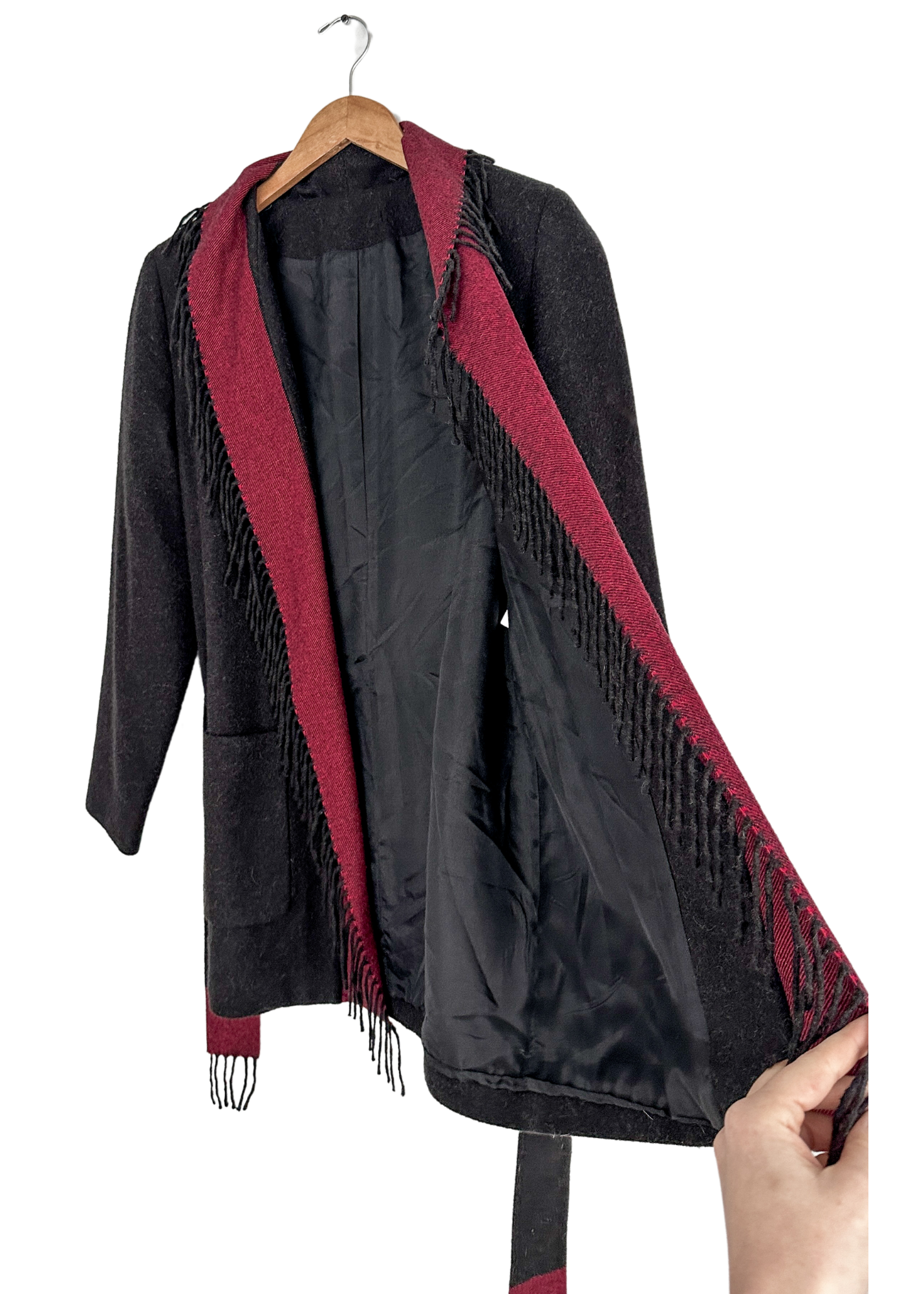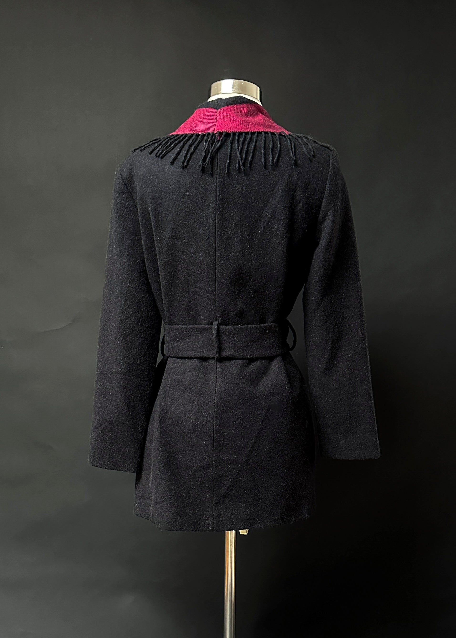 HOW TO STYLE/DETAILS: beautiful camel hair cardigan jacket features fringe around the trim, pockets at the sides and a sash belt.