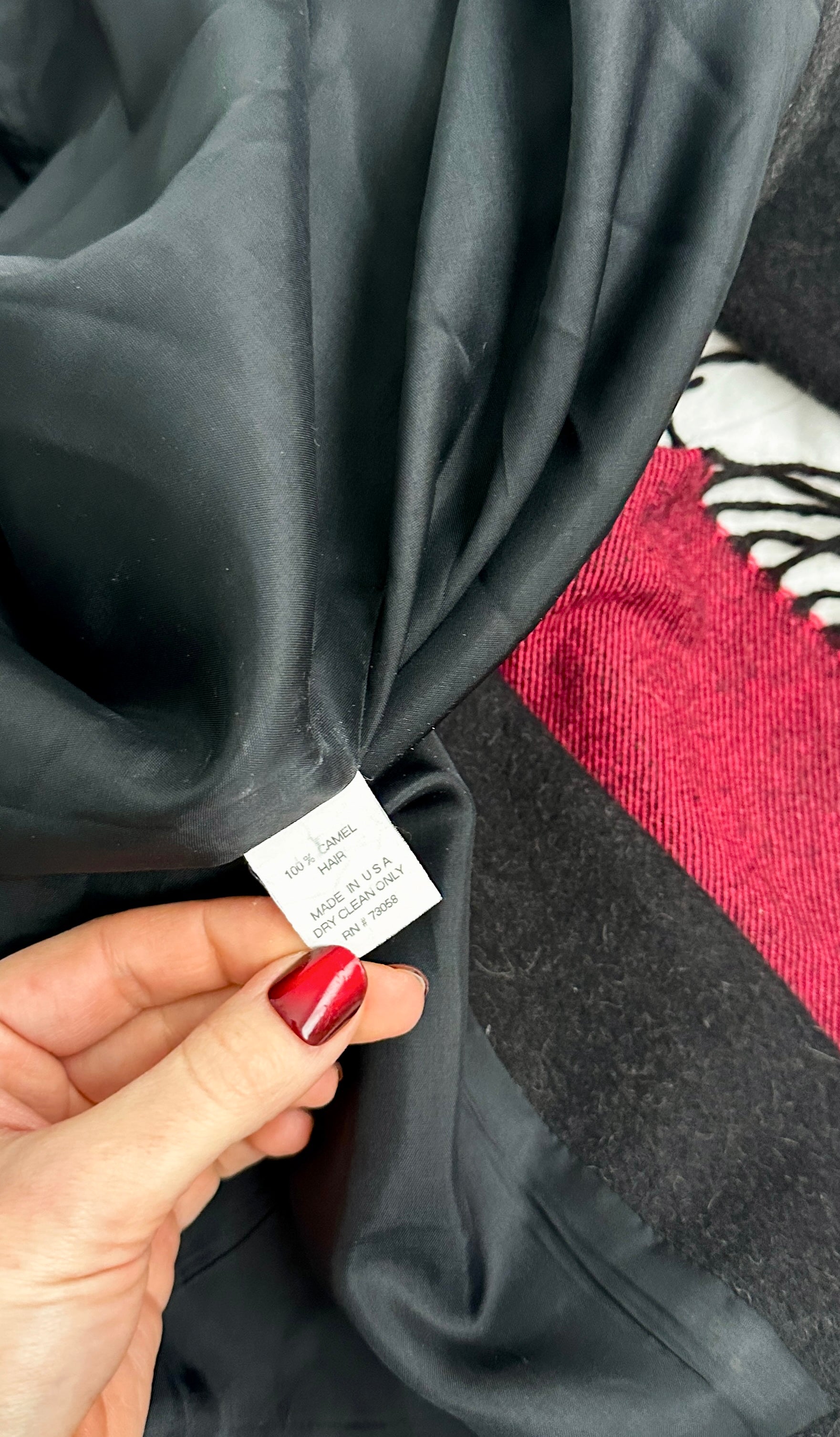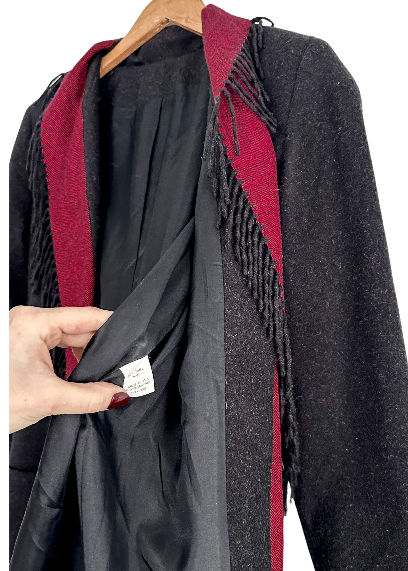 Material: 100% camel hair. fully lined. Made in the USA.