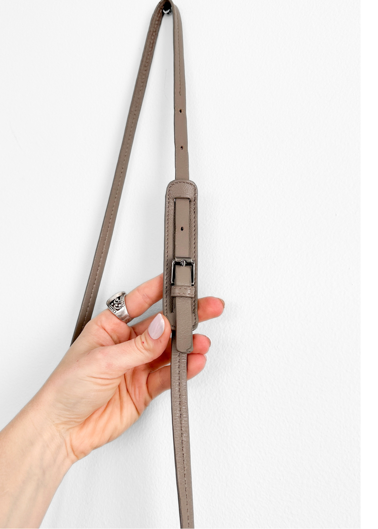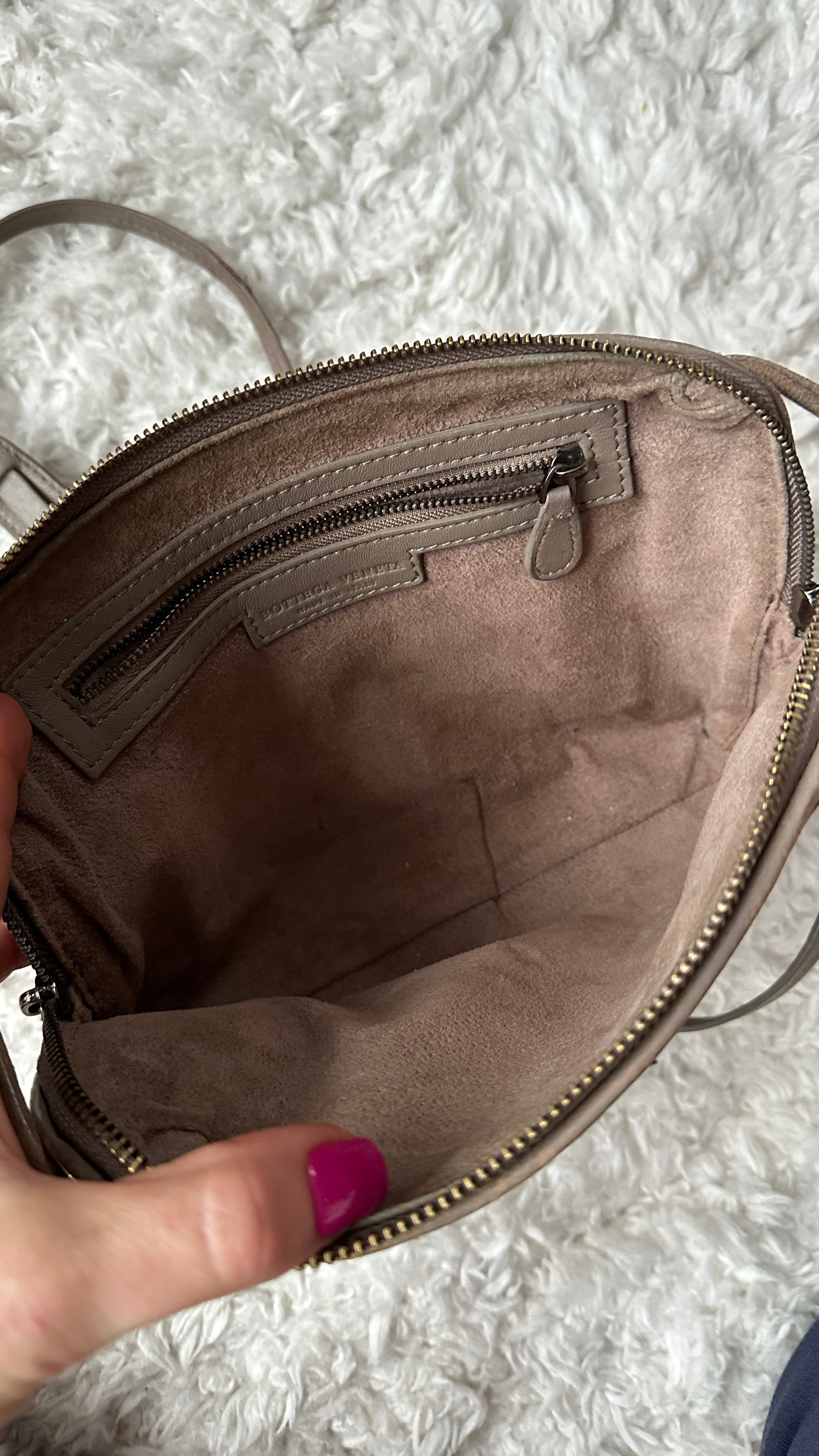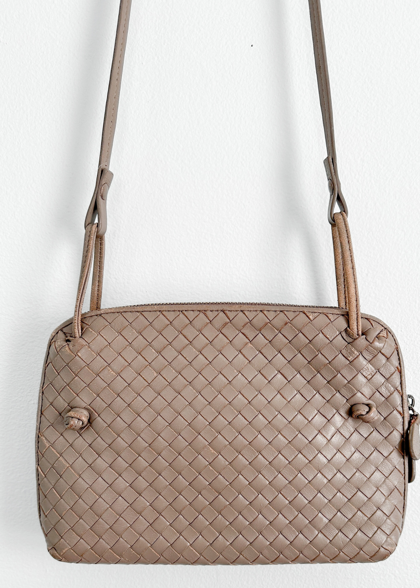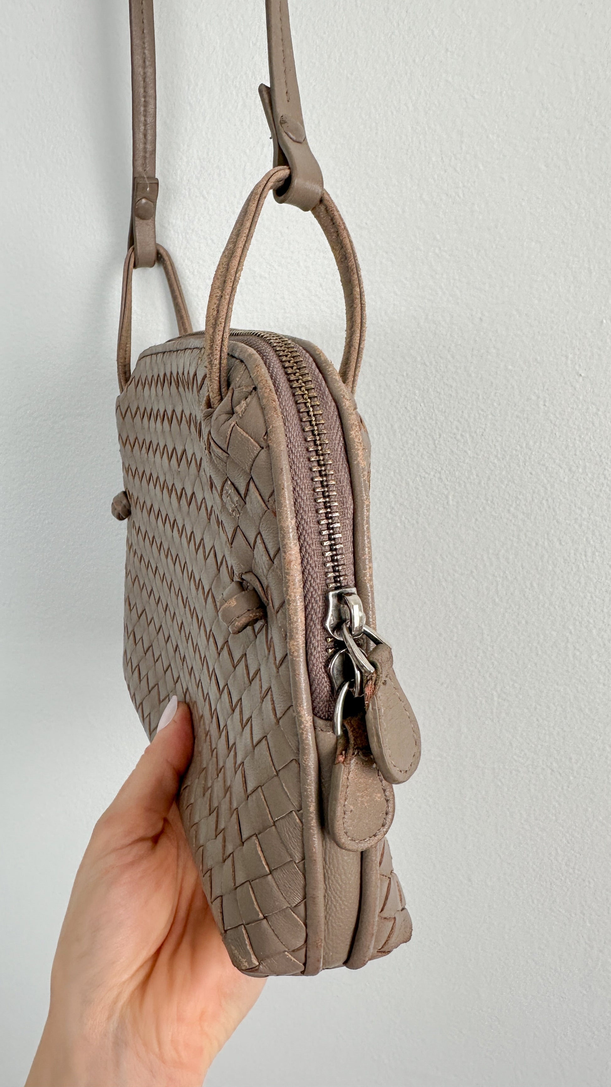 beautiful nappa leather purse from Bottega Veneta in their classic woven style with a double zipper closure, inside pocket and adjustable crossbody strap. Color is a gray shade of brown.