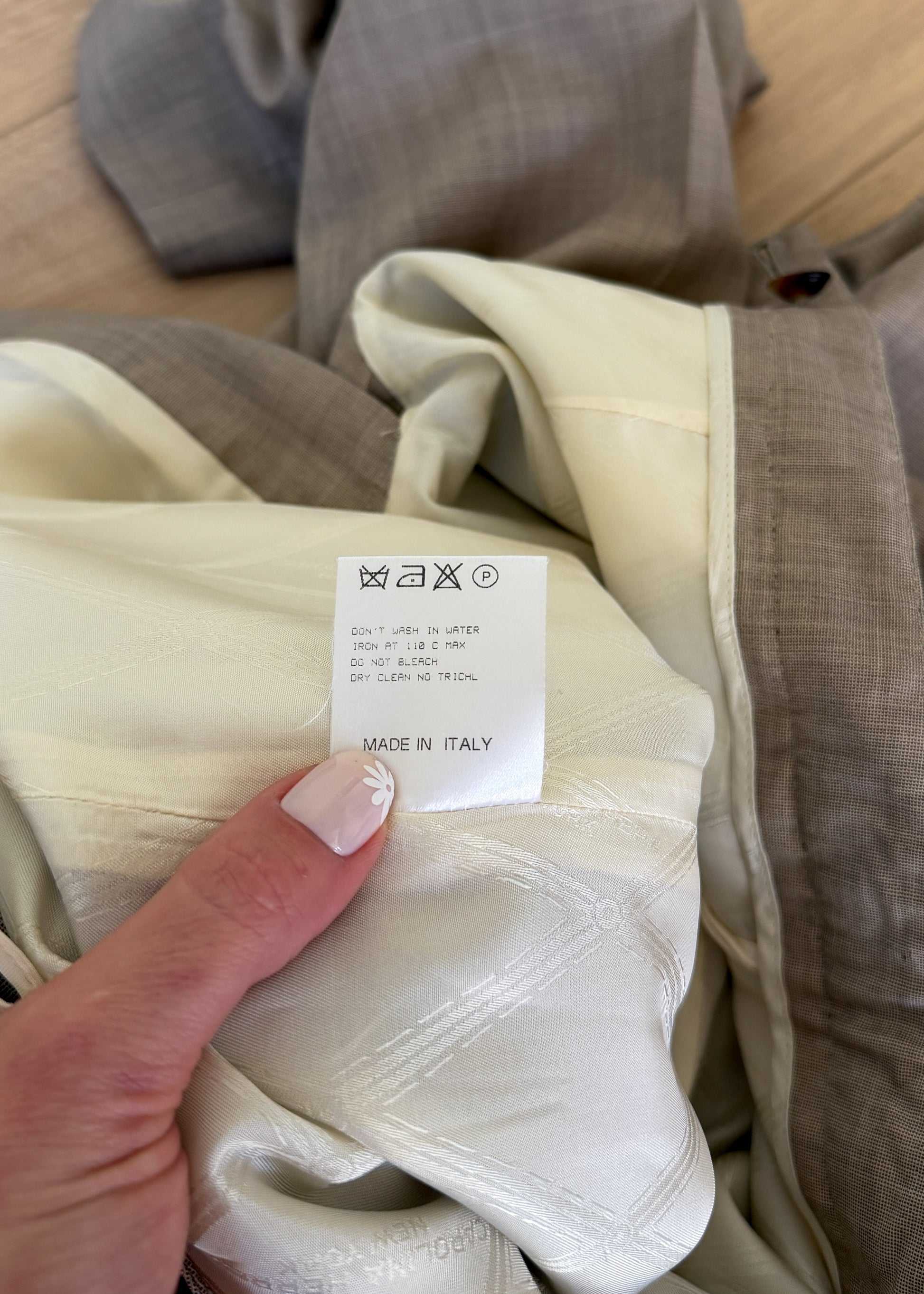 DETAILS: beautiful dress pants from luxury designer Carolina Herrera! Wool/silk woven material is soft (not scratchy!) in a brown/gray color. Button/fly front with two pockets at the sides and contrasting stitching.