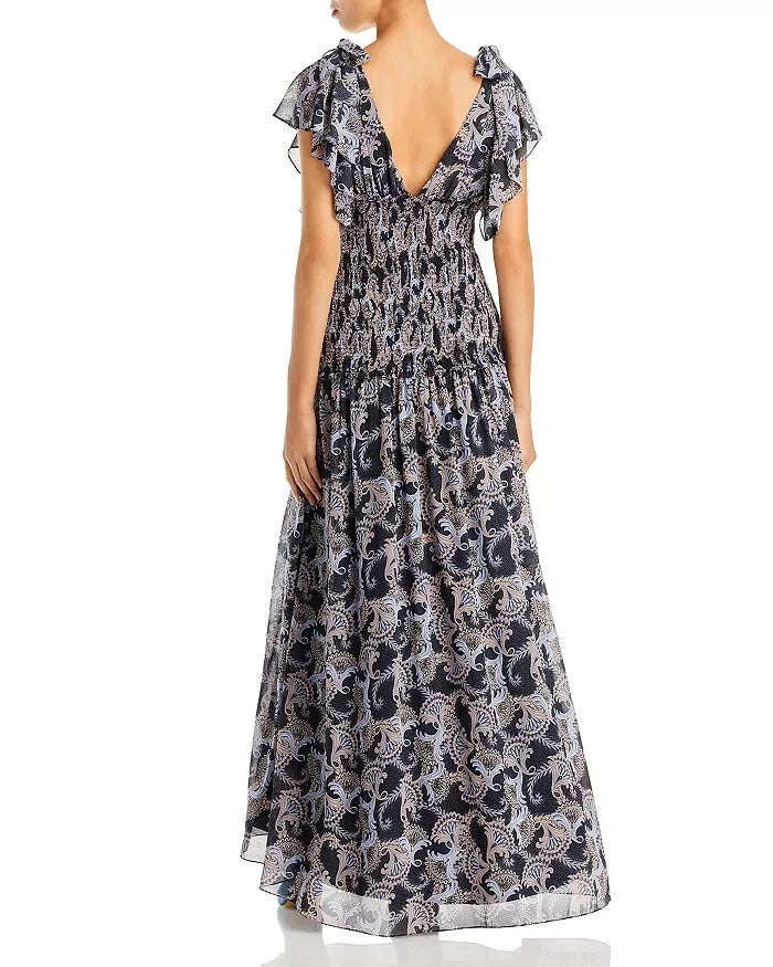 Cinq à Sept Kris Chiffon Dress in Raven Paisley Navy Blue Chiffon Smocked Maxi