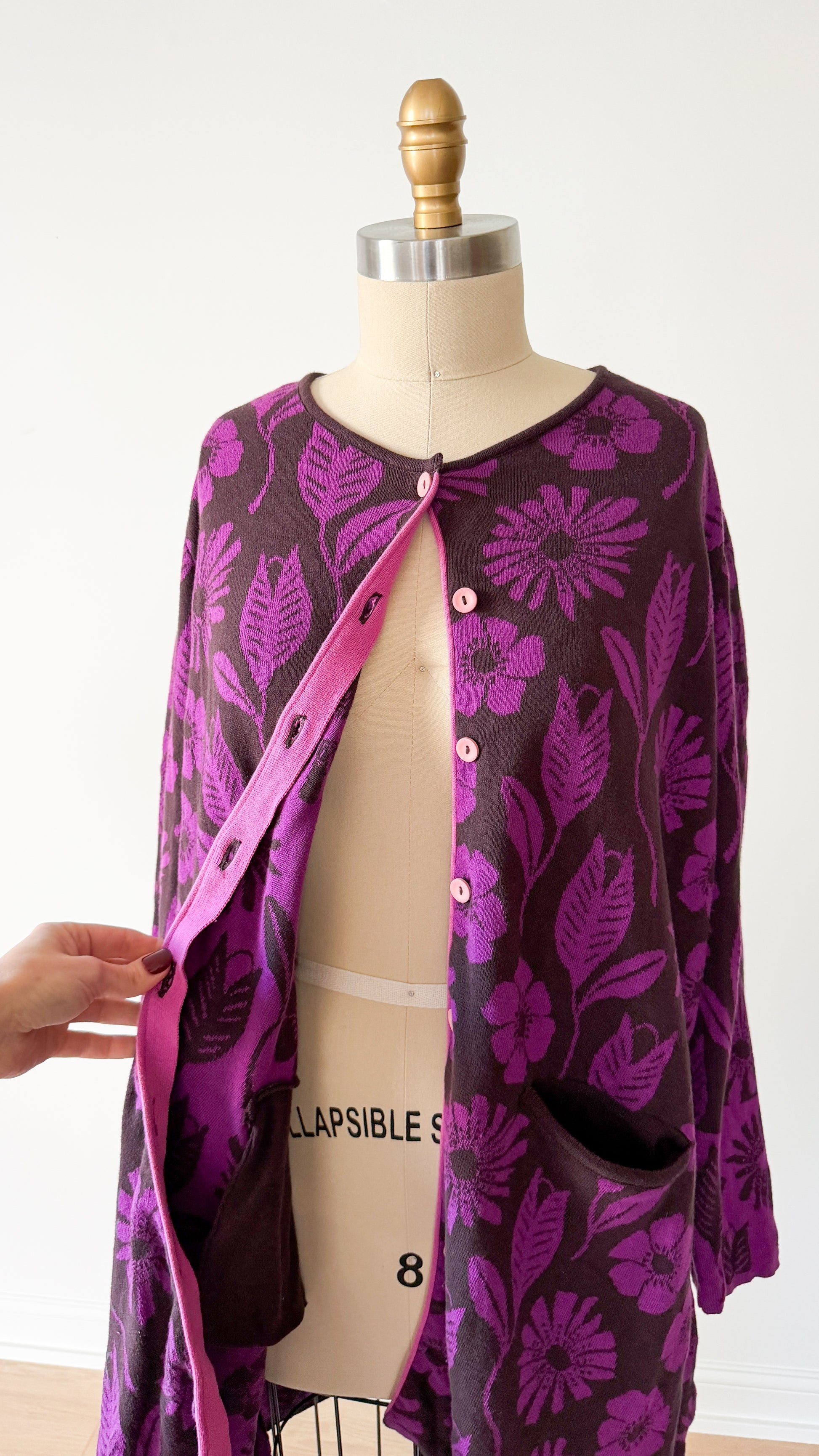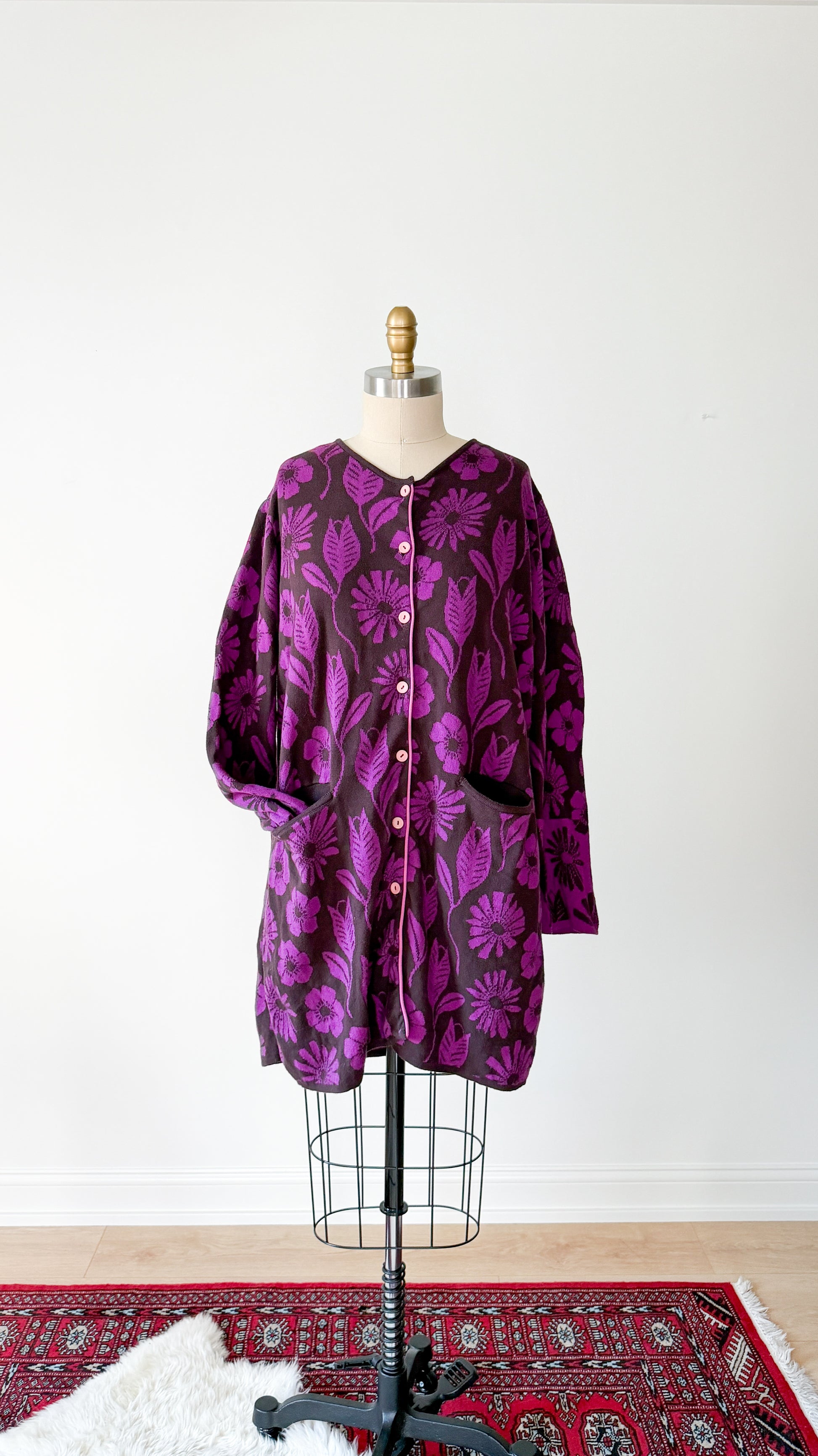DETAILS: adorable, super soft heavy woven cotton cardigan jacket from Gudrun Sjödén in a "grape" purple and chocolate brown floral pattern. Features pink buttons down the front and two front pockets. Comes with additional/spare button.