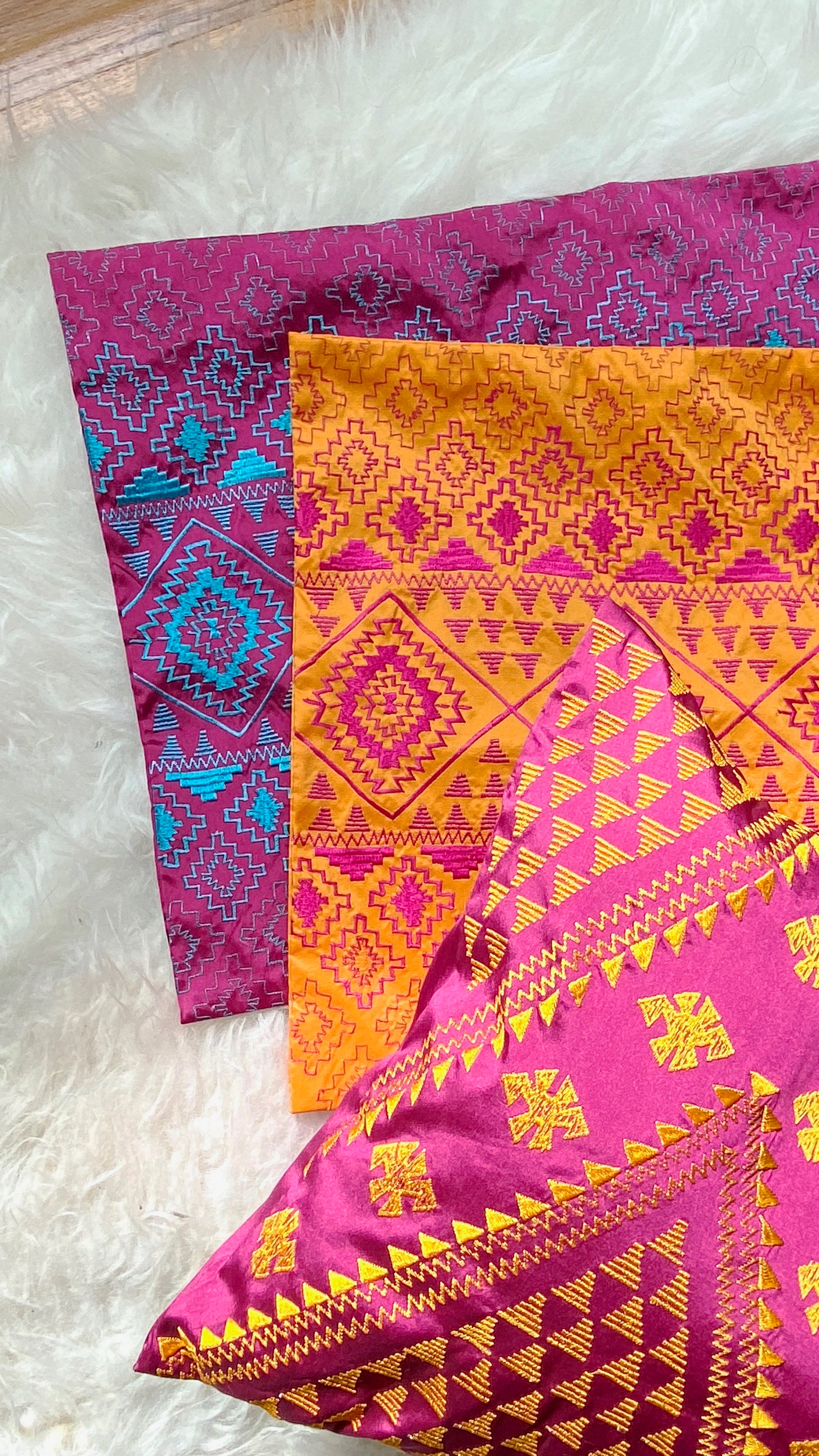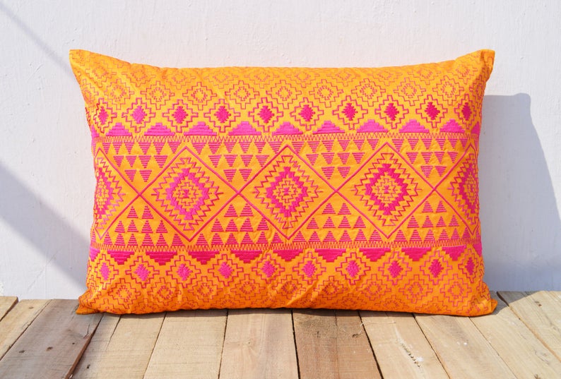 The pillow is inspired by classic Kilim patterns. The bright orange polytafetta is intricately embroidered in bright pink color.