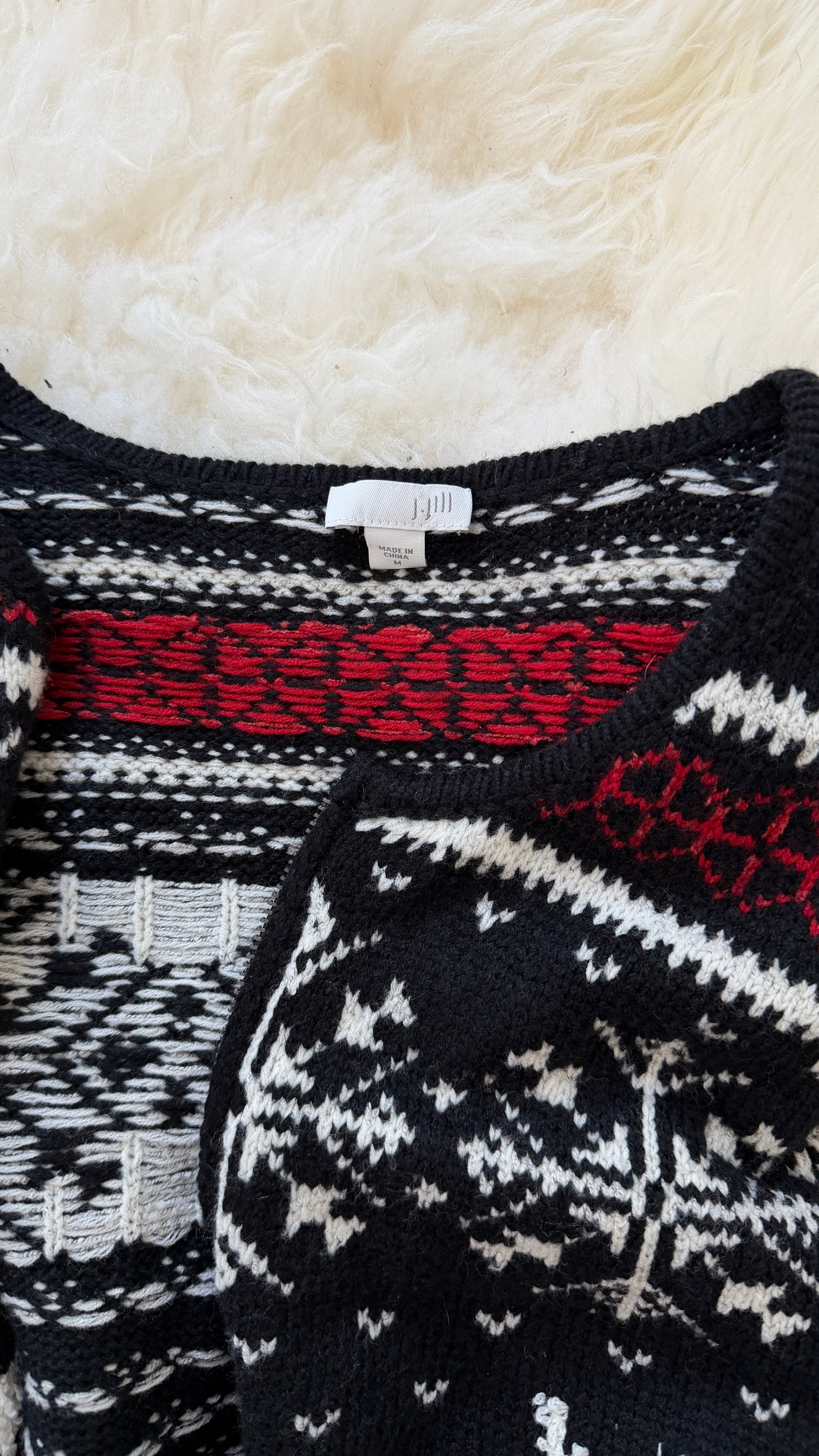 DETAILS: beautiful and super soft Holiday sweater from J.Jill! Features a zipper down the front, plush reindeer on the front and snowflakes across the front and back. Colors are black, red and white.