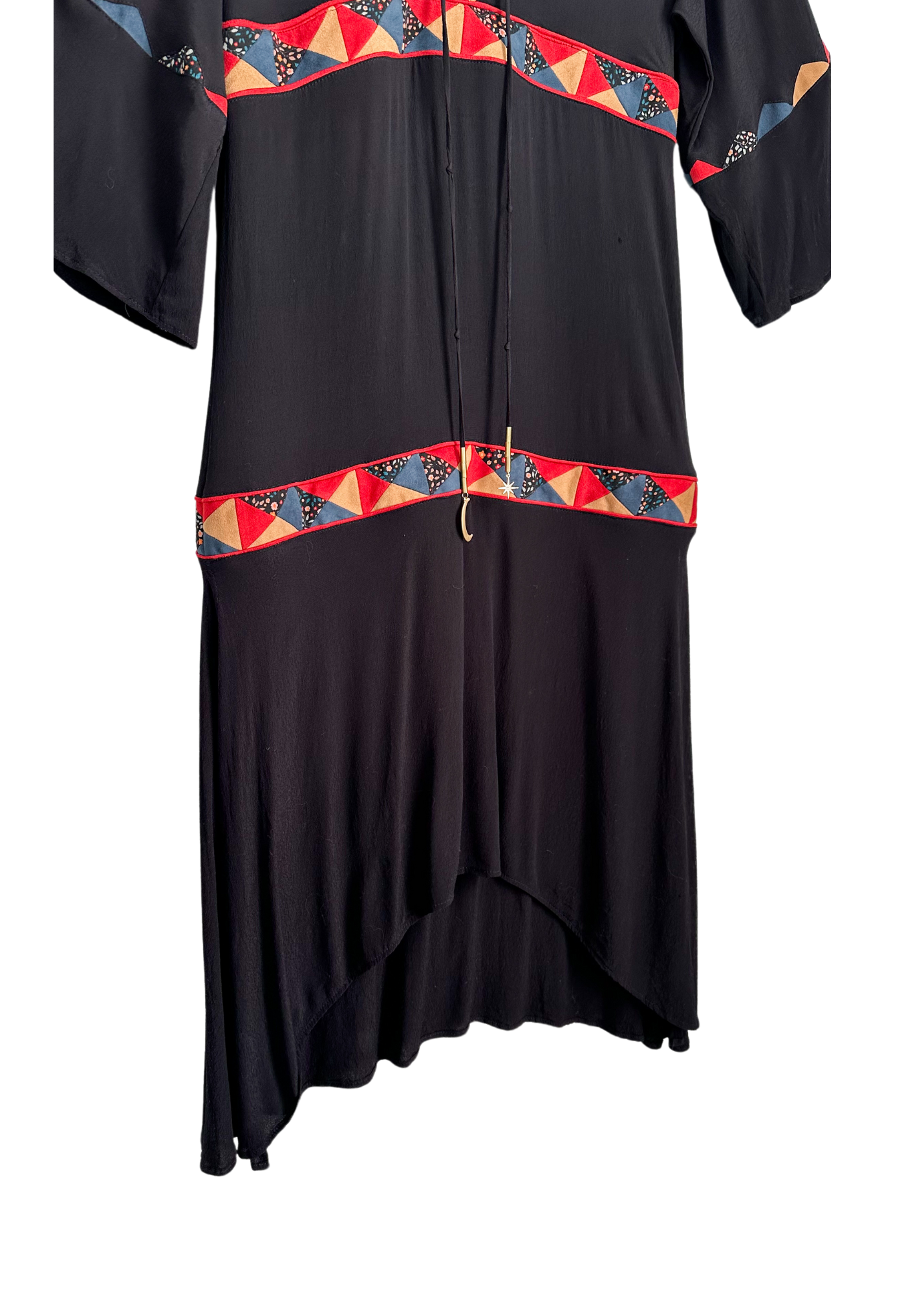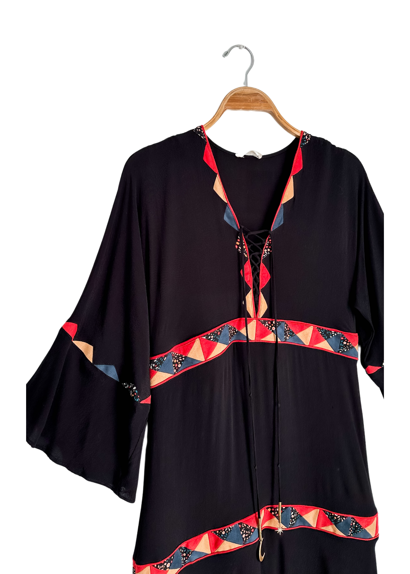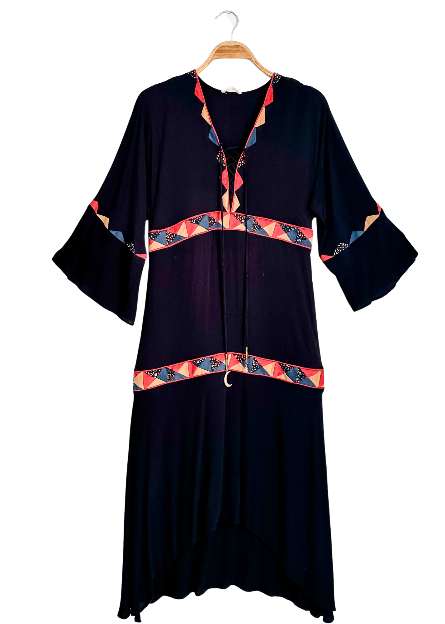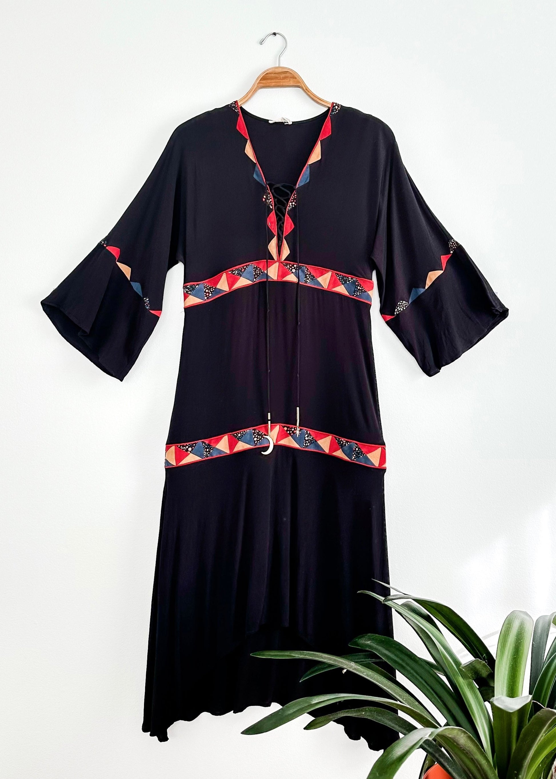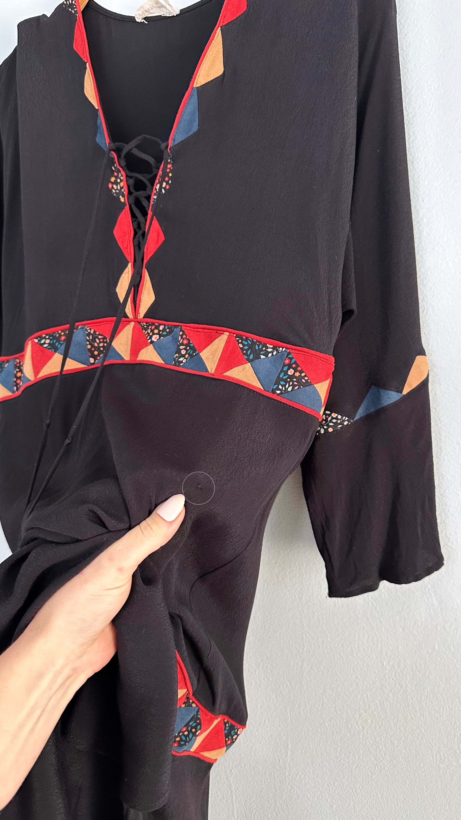 HOW TO STYLE/DETAILS: vintage Inspired dress by Liberty Garden! Features a red, tan and blue faux suede patch trim, v-neck with lace up front that has long, knotted strings which are embellished with a moon charm and star charm. Elbow length sleeves that flare out, slight rounded hem that is slightly shorter in the front and slits on the sides. Pull-on style. *see images wit circled spot that has been mended. not super noticeable!