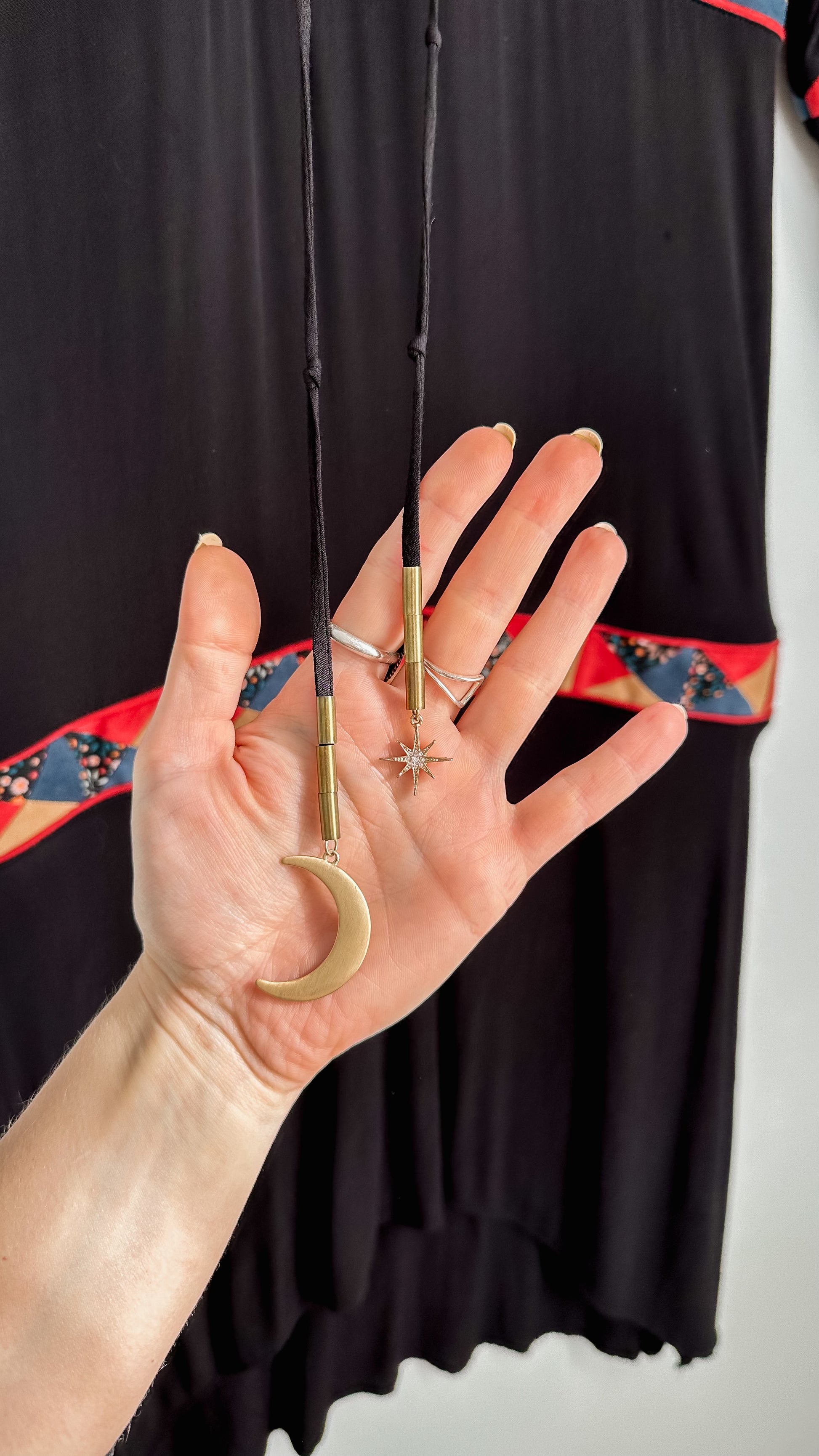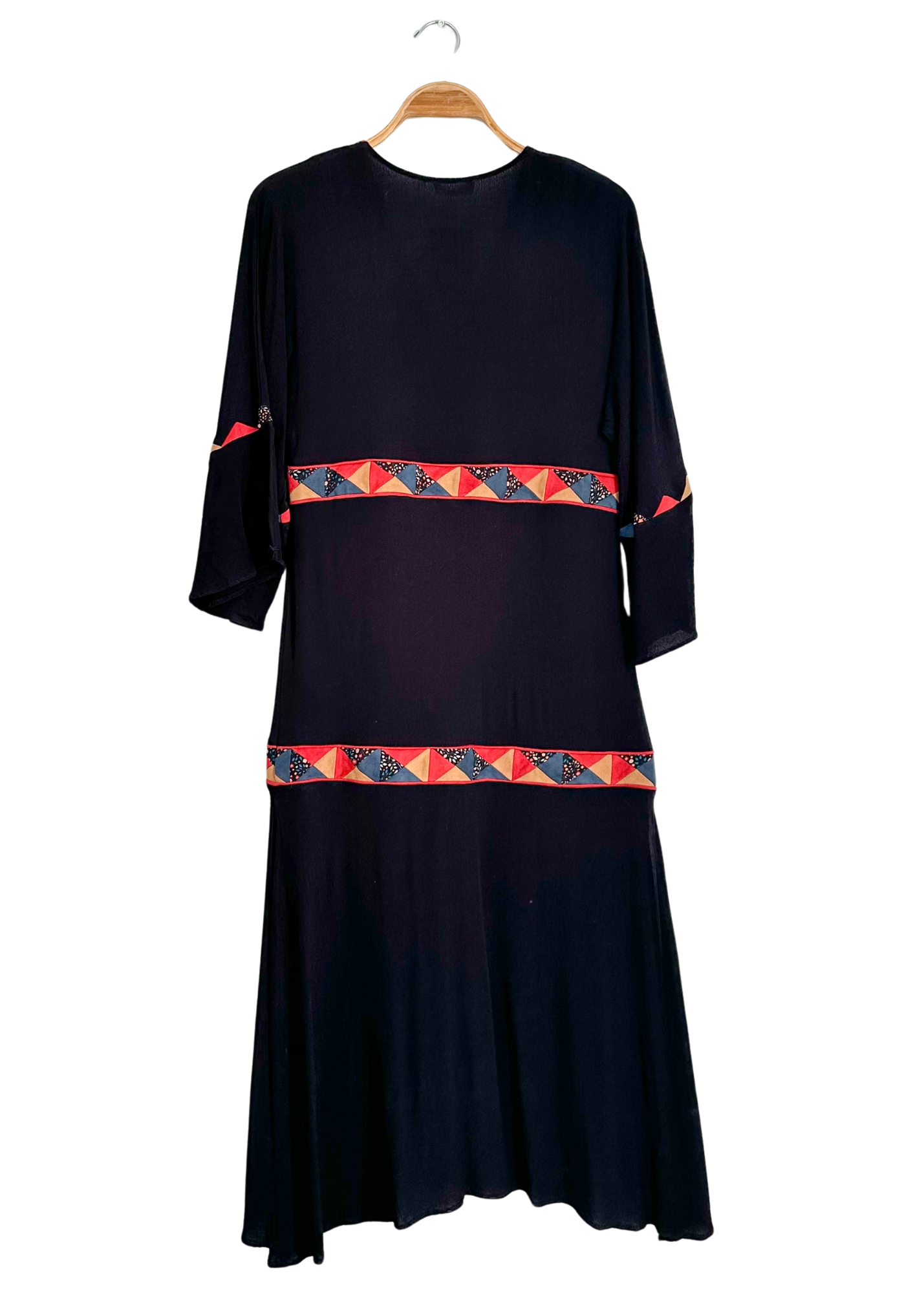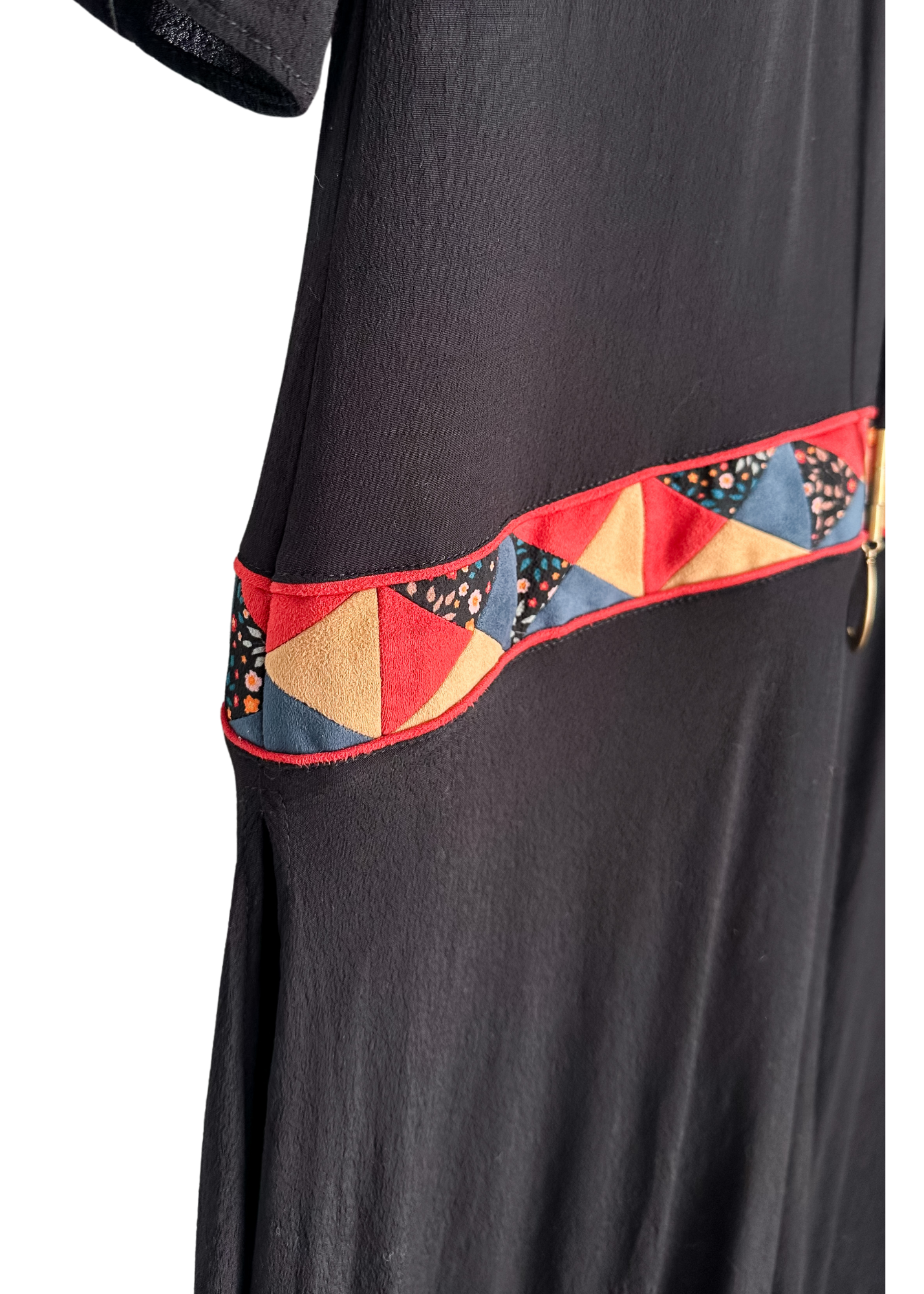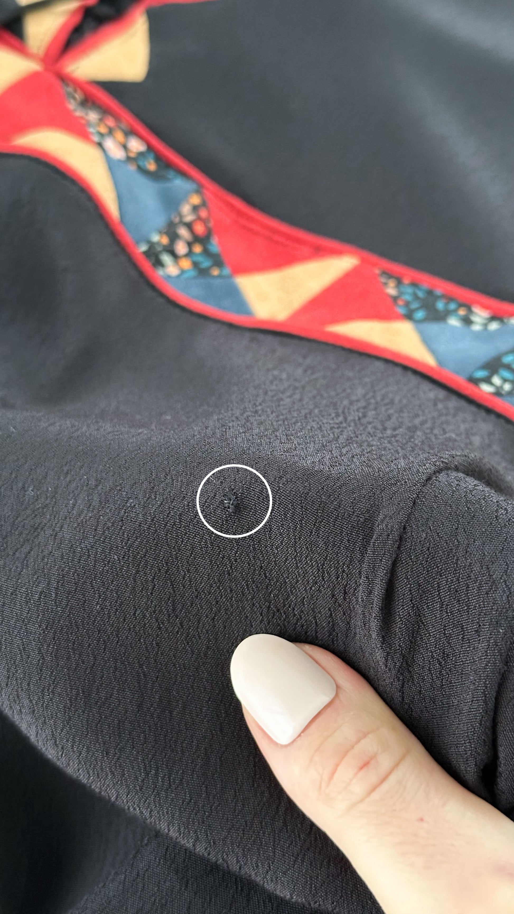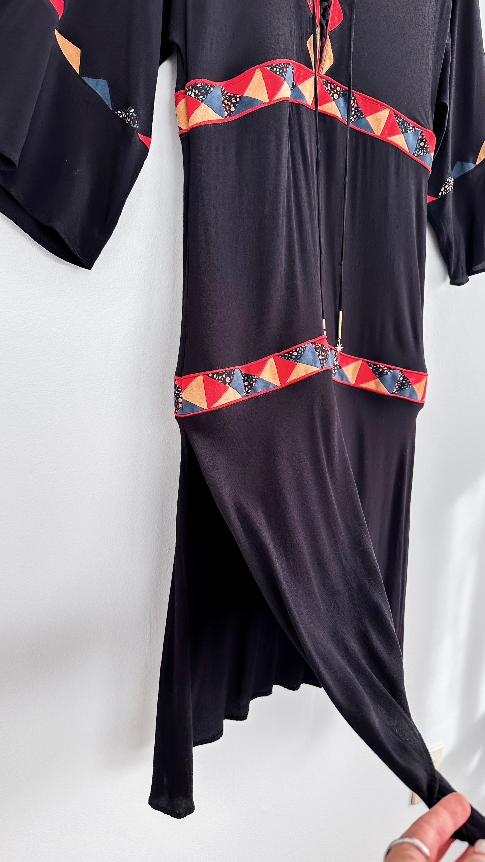 HOW TO STYLE/DETAILS: vintage Inspired dress by Liberty Garden! Features a red, tan and blue faux suede patch trim, v-neck with lace up front that has long, knotted strings which are embellished with a moon charm and star charm. Elbow length sleeves that flare out, slight rounded hem that is slightly shorter in the front and slits on the sides. Pull-on style. *see images wit circled spot that has been mended. not super noticeable!