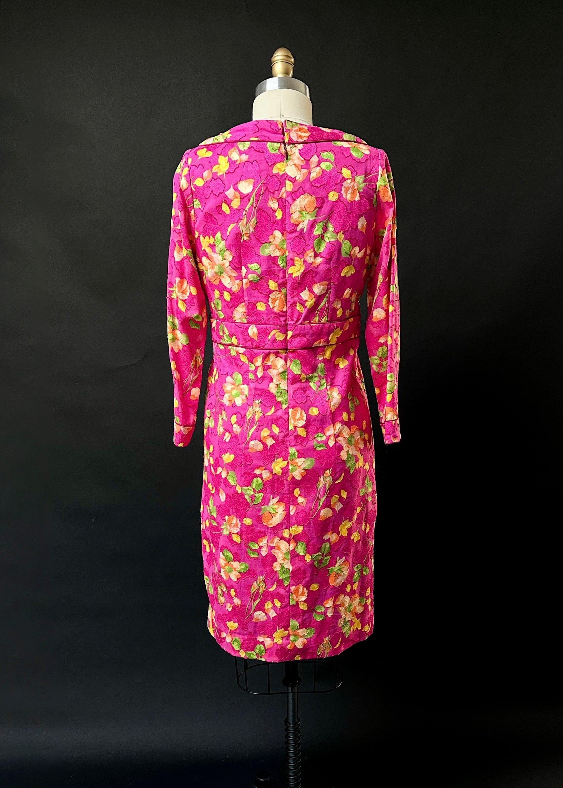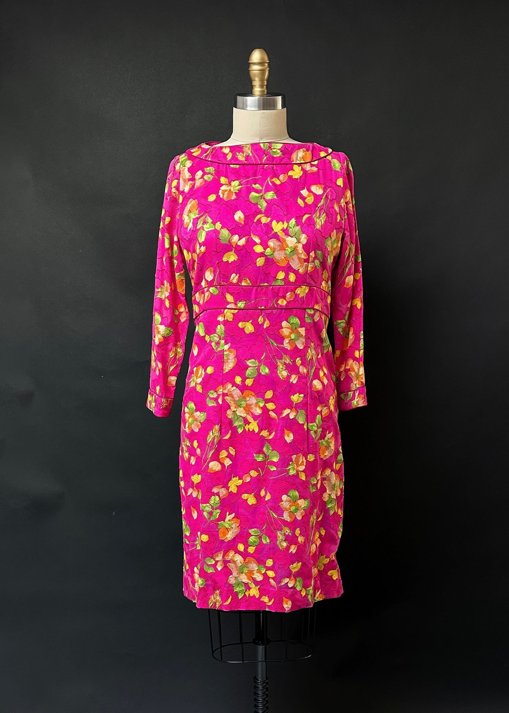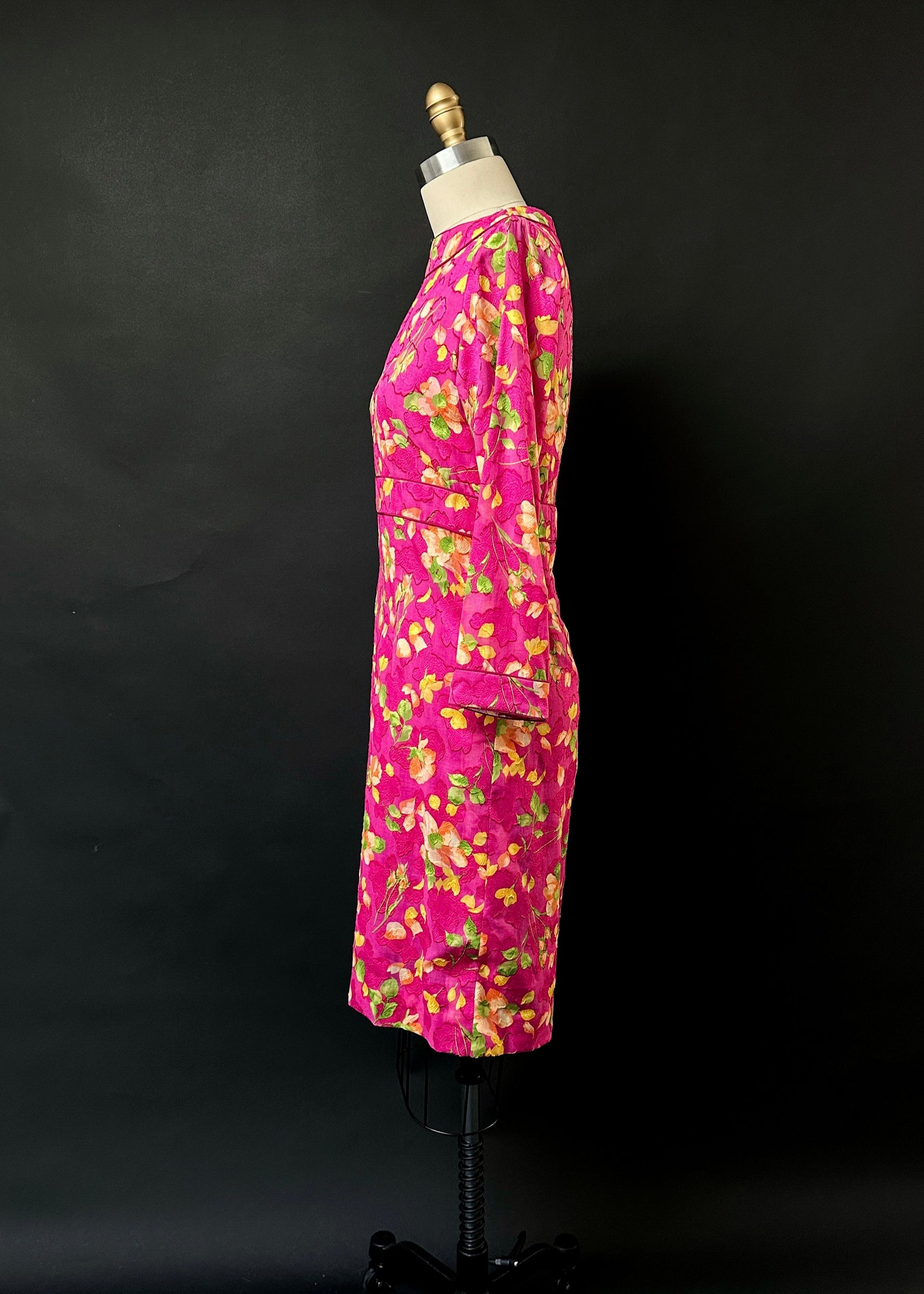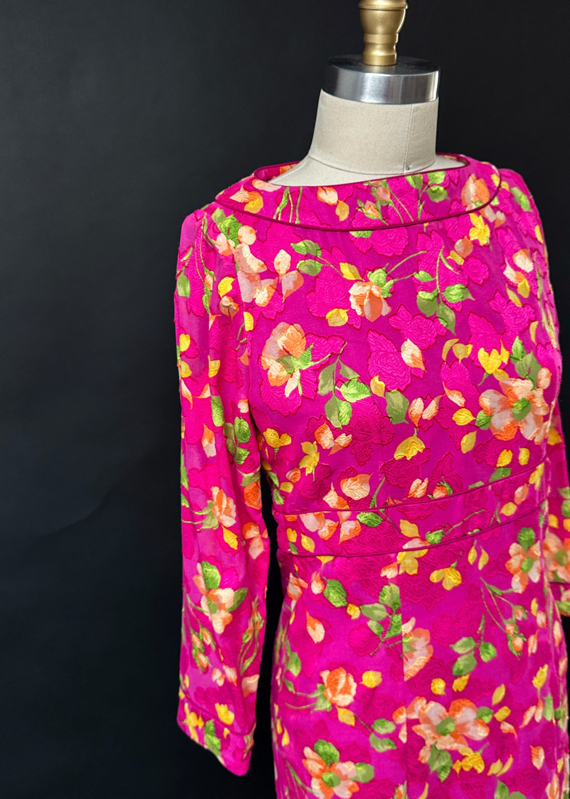 DETAILS: stunning pink dress with yellow, orange and green floral design throughout. Fully lined with fuschia silk and dark pink piping around the collar, waist and cuffs. This is a shift cut with a defined waist and 3/4 length sleeves. Neckline is a boatneck with a long zipper down the back and two covered snap buttons behind the neck.
