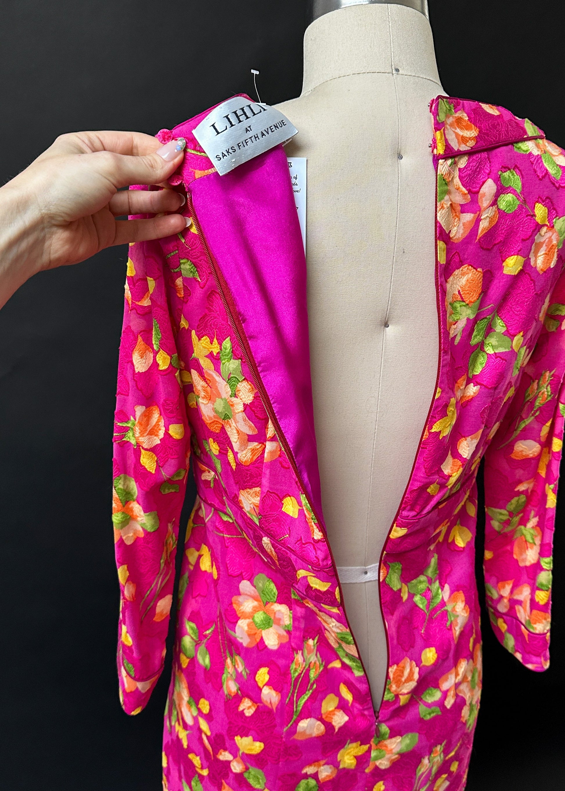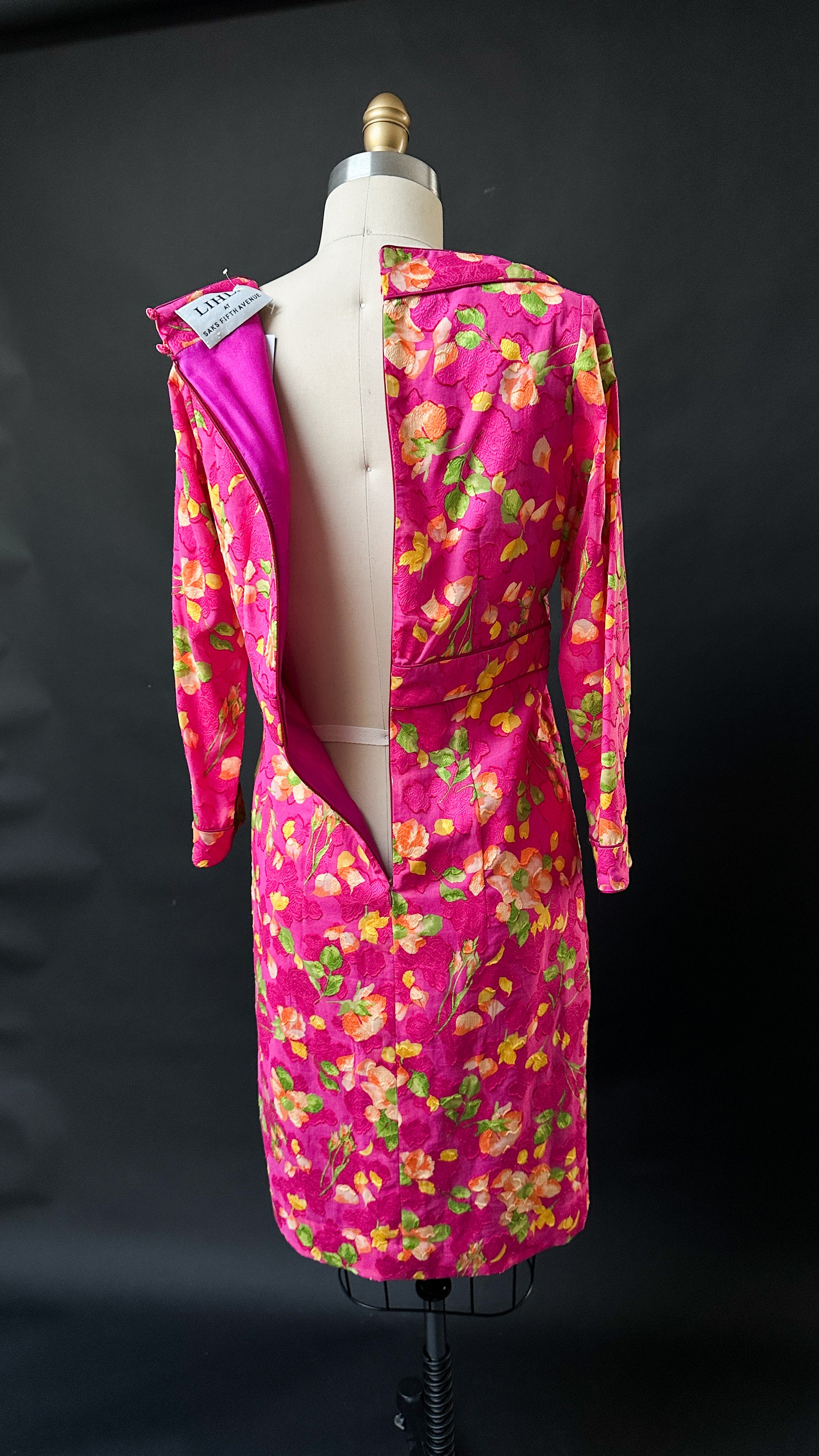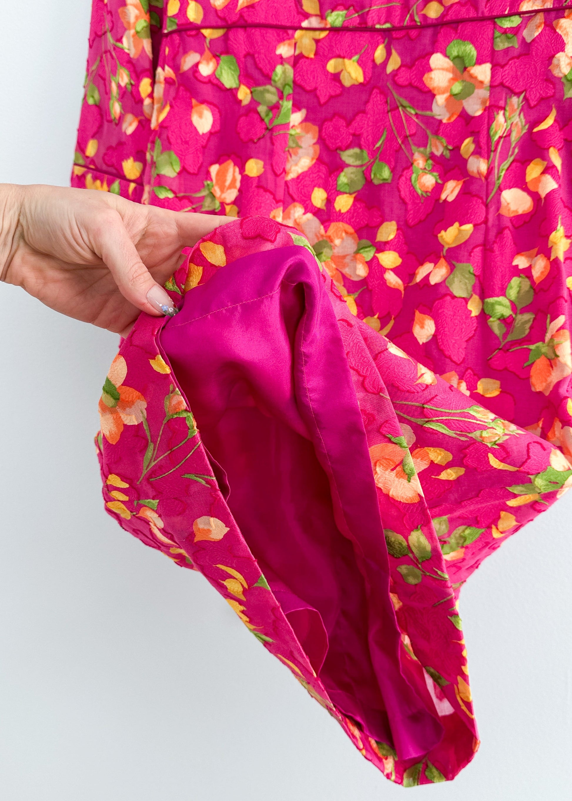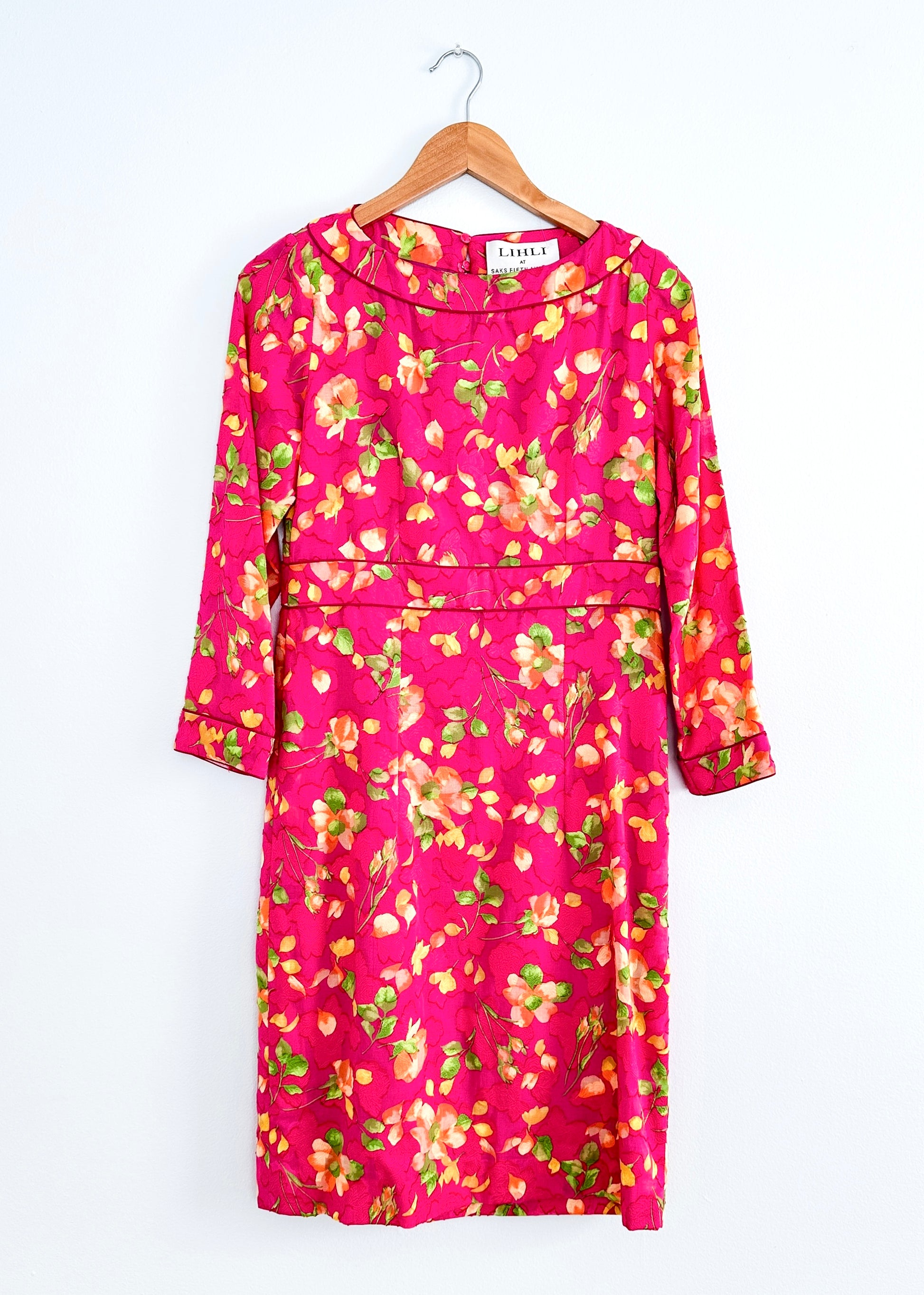 DETAILS: stunning pink dress with yellow, orange and green floral design throughout. Fully lined with fuschia silk and dark pink piping around the collar, waist and cuffs. This is a shift cut with a defined waist and 3/4 length sleeves. Neckline is a boatneck with a long zipper down the back and two covered snap buttons behind the neck.