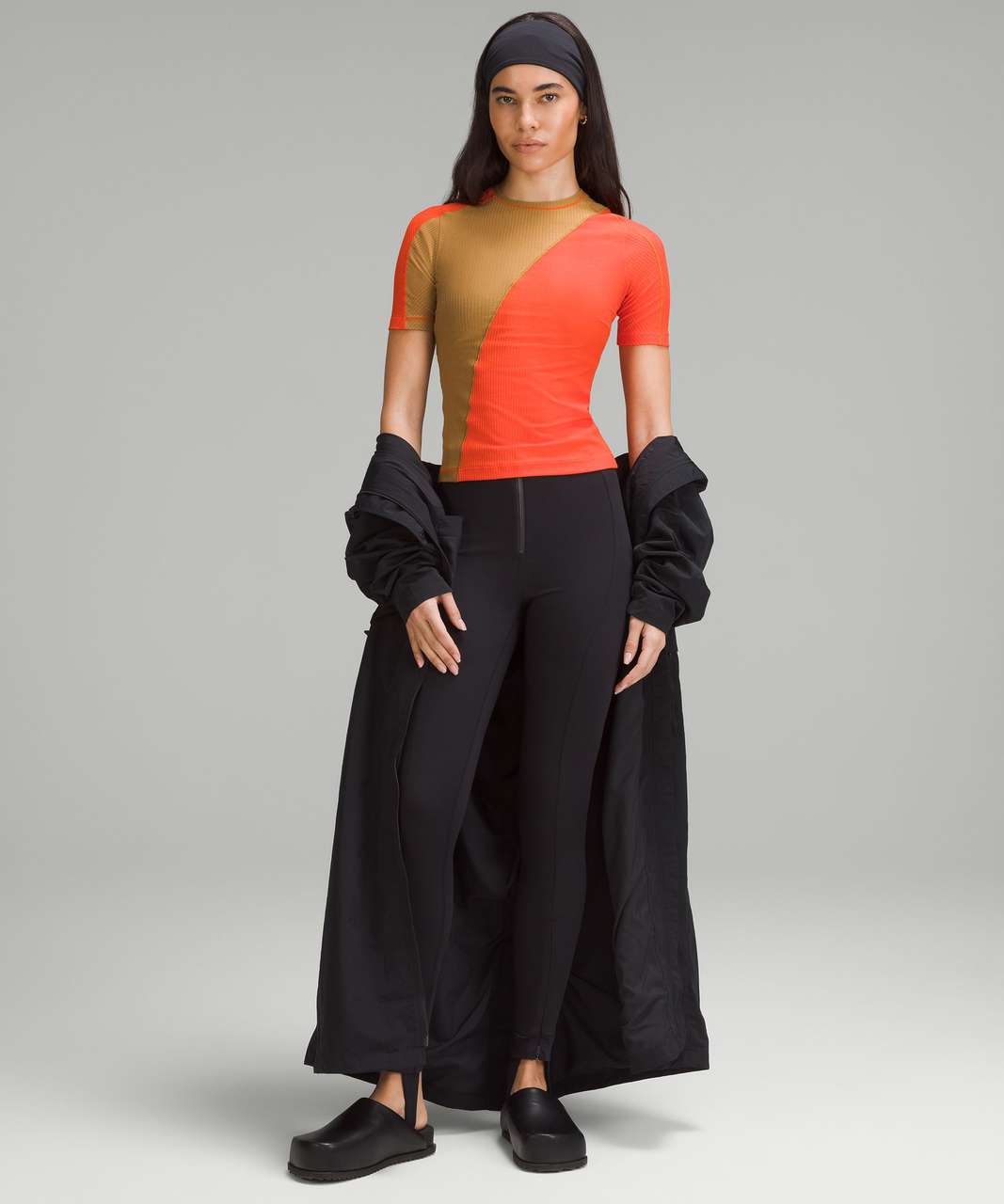 Lululemon Asymmetrical Ribbed Cotton T-Shirt in Solar Orange and Beige (XL)