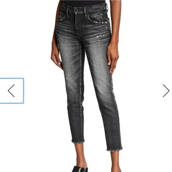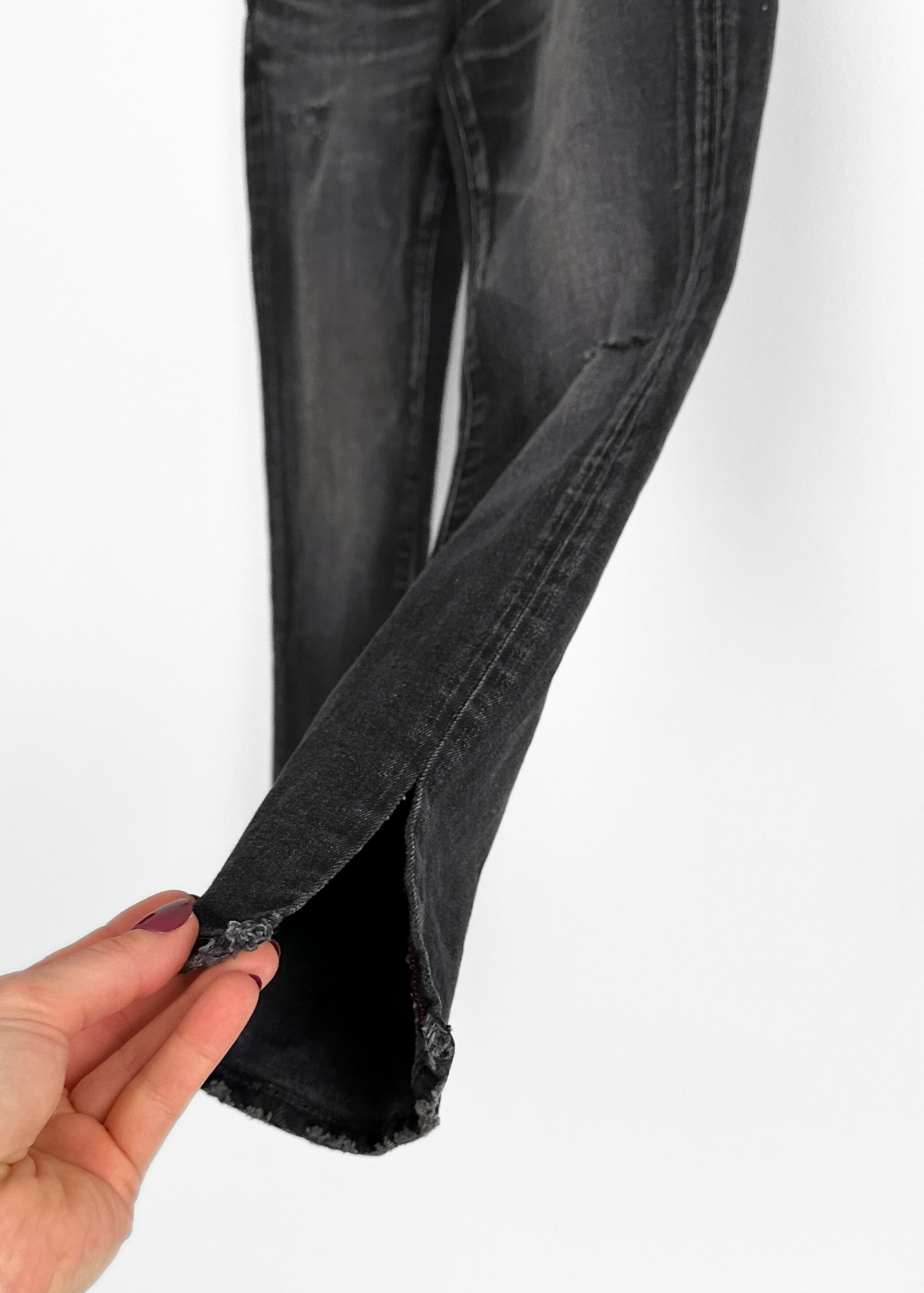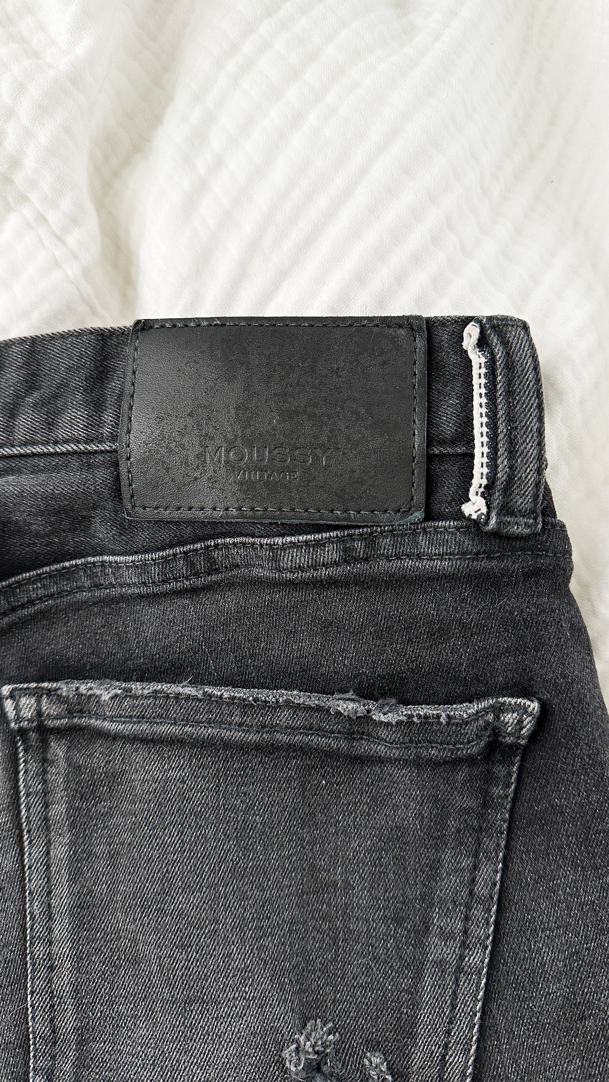 DETAILS: premium denim by designer Moussy Vintage features distressed details, 5 pocket design, a mid rise and split ankle.