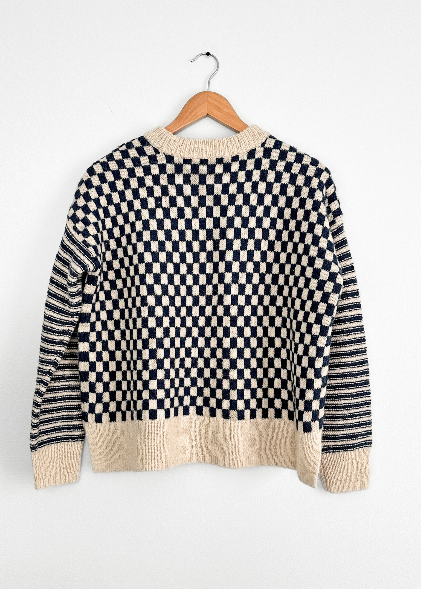 This knit has dropped shoulders, striped sleeves and contrasting ribbed trim. Throw this relaxed style on when you want to jazz up an understated look.