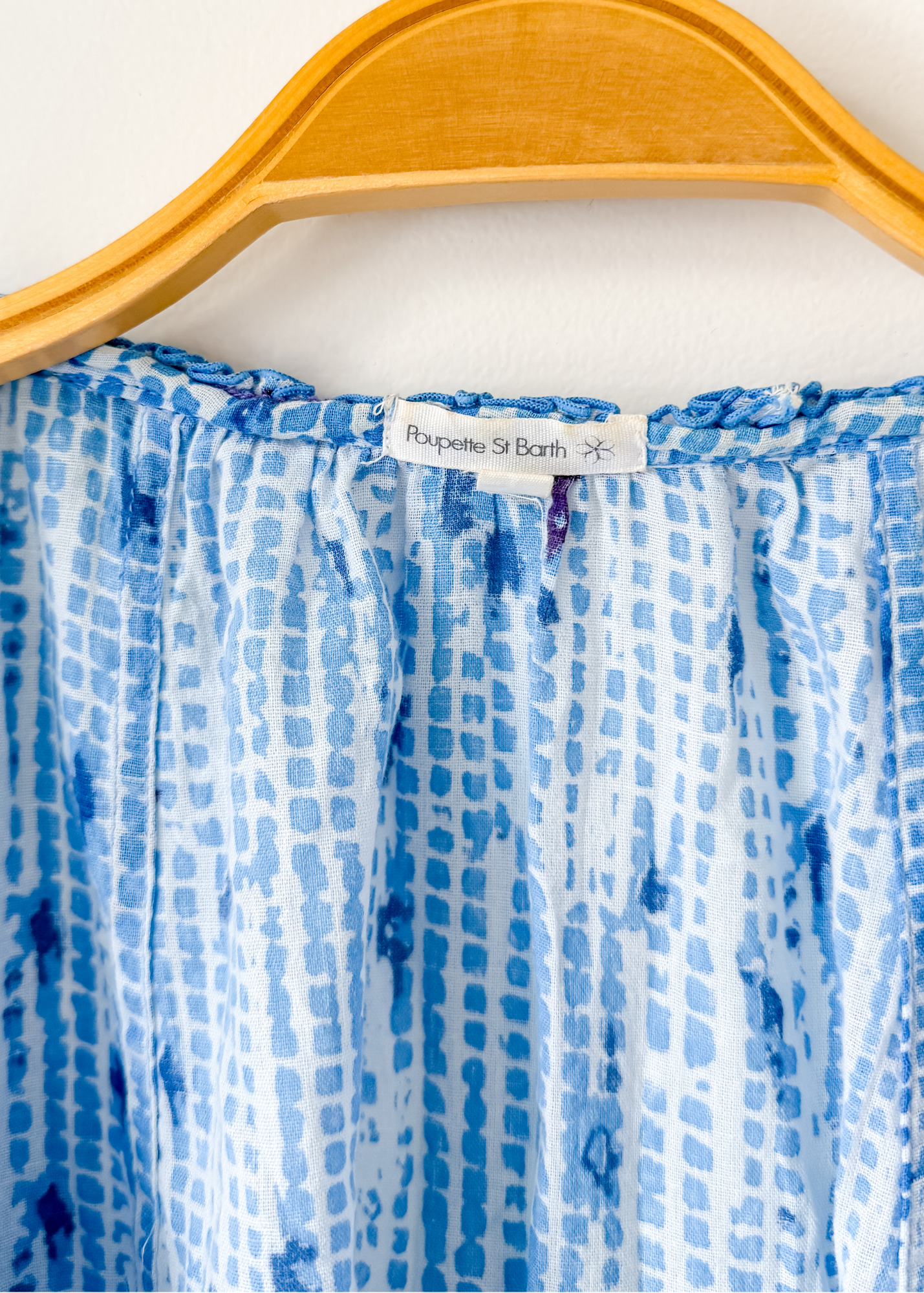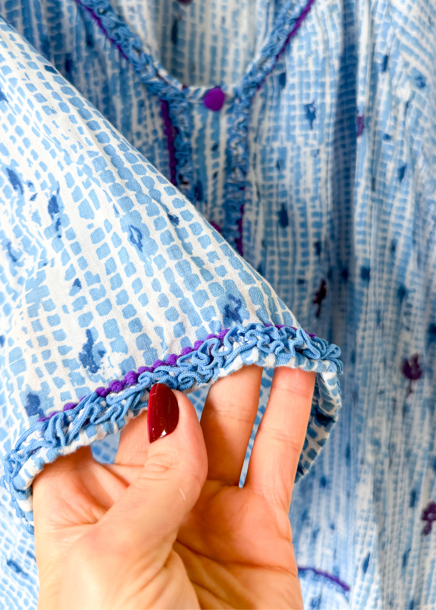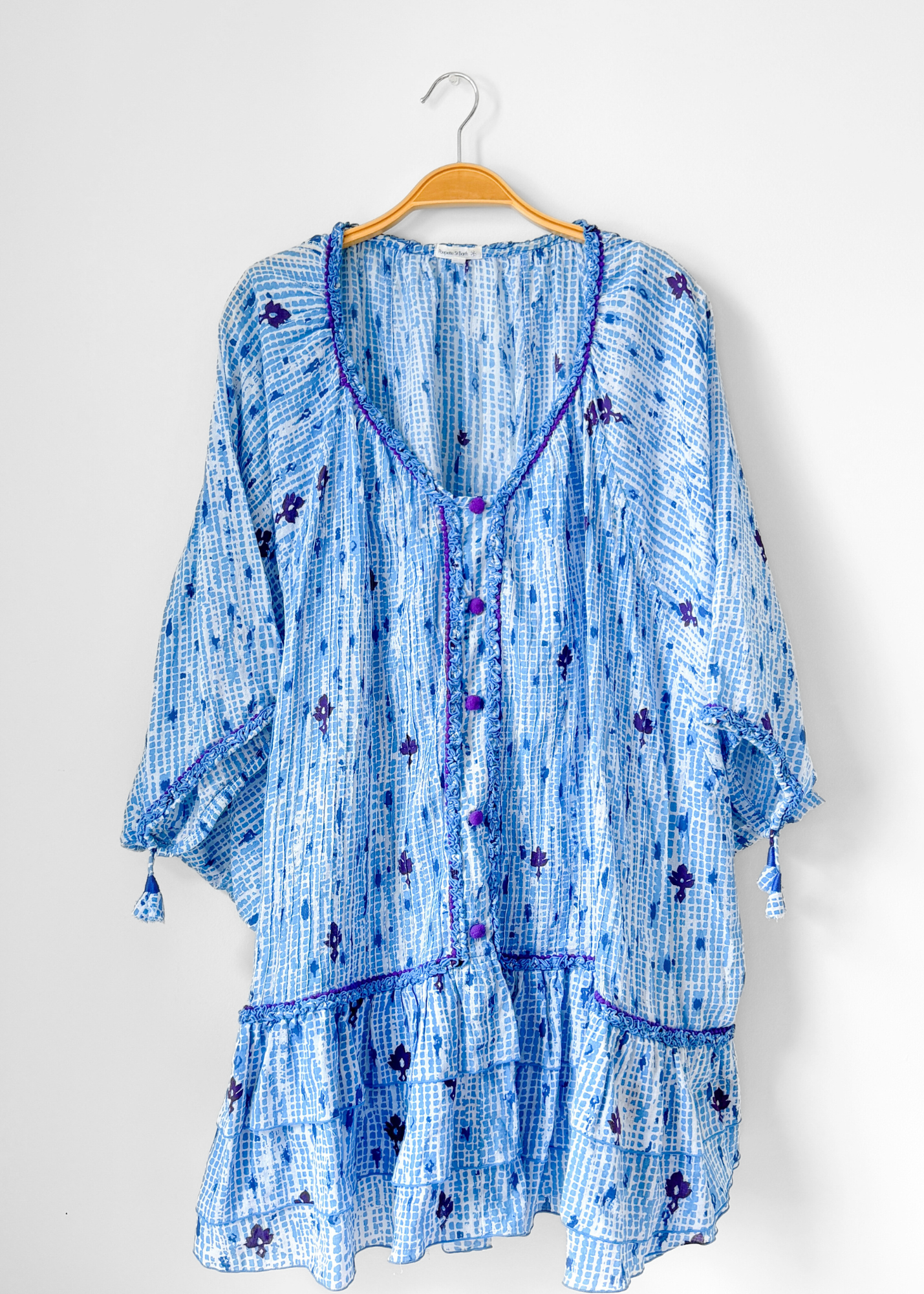 DETAILS: stunning blue, white and purple print tunic ( or mini dress!) from luxury brand Poupette St. Barth features purple pom pom details down the front, drawstrings around the sleeves and a ruffled hem.