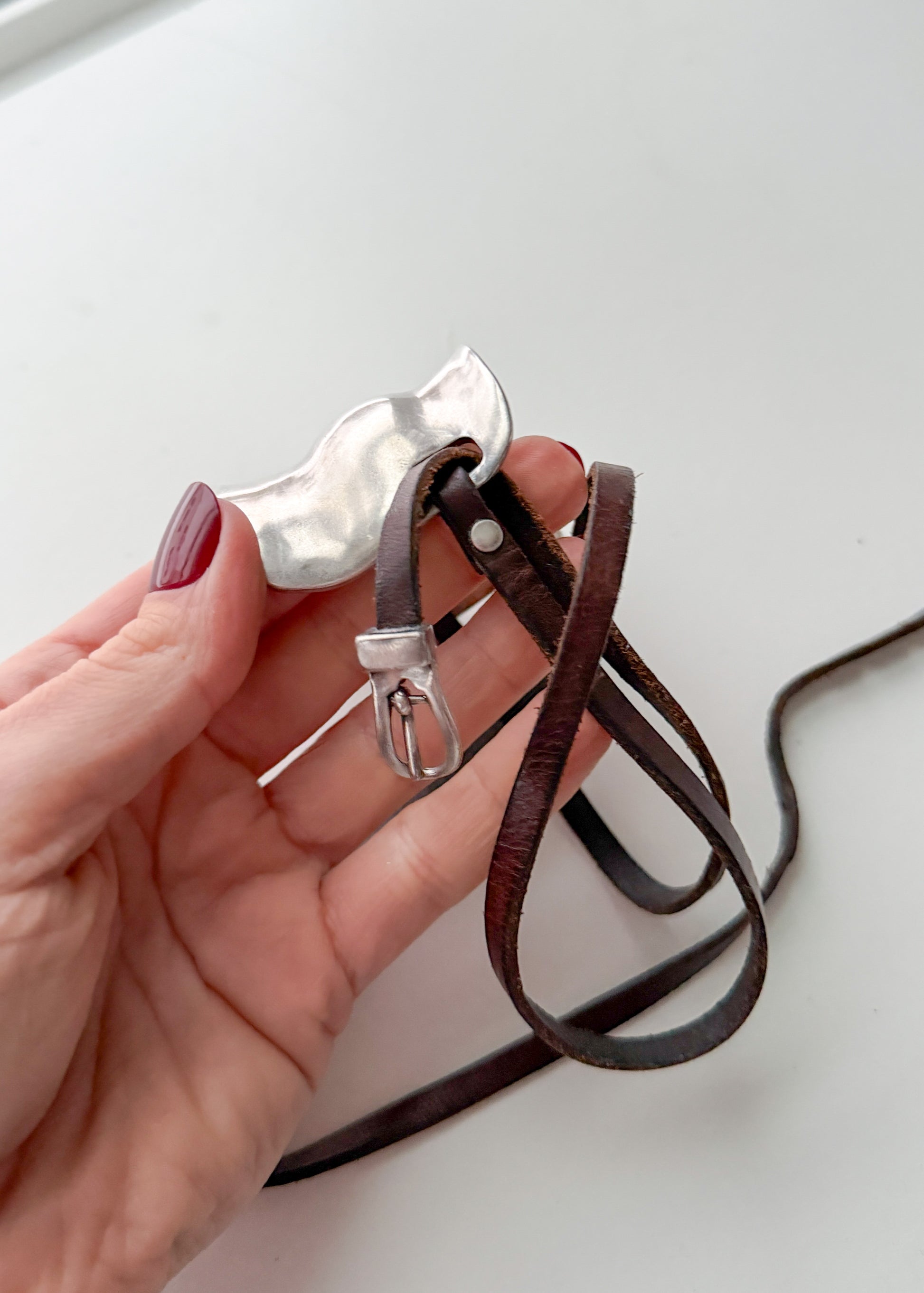 Beautiful silver plated irregular cuff has dark leather straps and a silver buckle to adjust to your wrist.