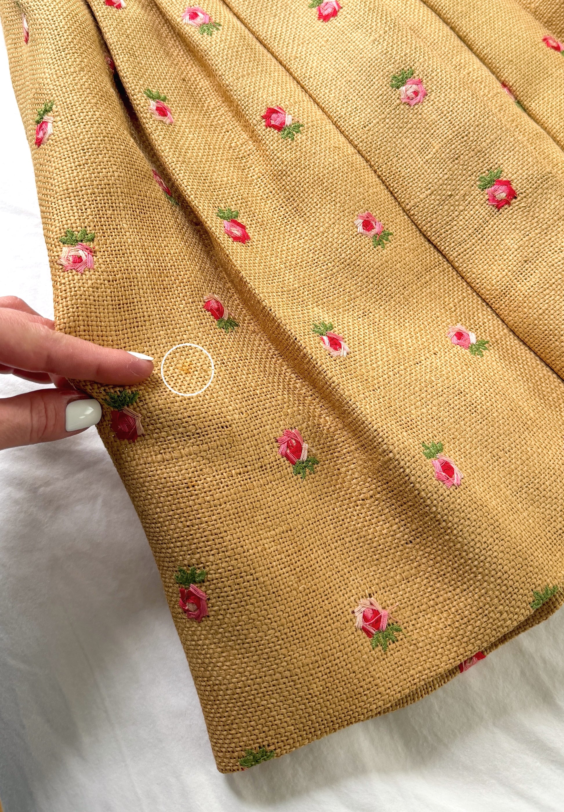 Designed in a warm straw beige textured weave fabric, this sleeveless fit-and-flare silhouette is embroidered with pink rosebuds and is finished off with a matching removable pink belt. Finished with a full pleated skirt, scoop neckline, and metal back zipper closure, this dress captures the polished elegance and whimsical spirit of true 1950s style. A rare and wearable vintage treasure!