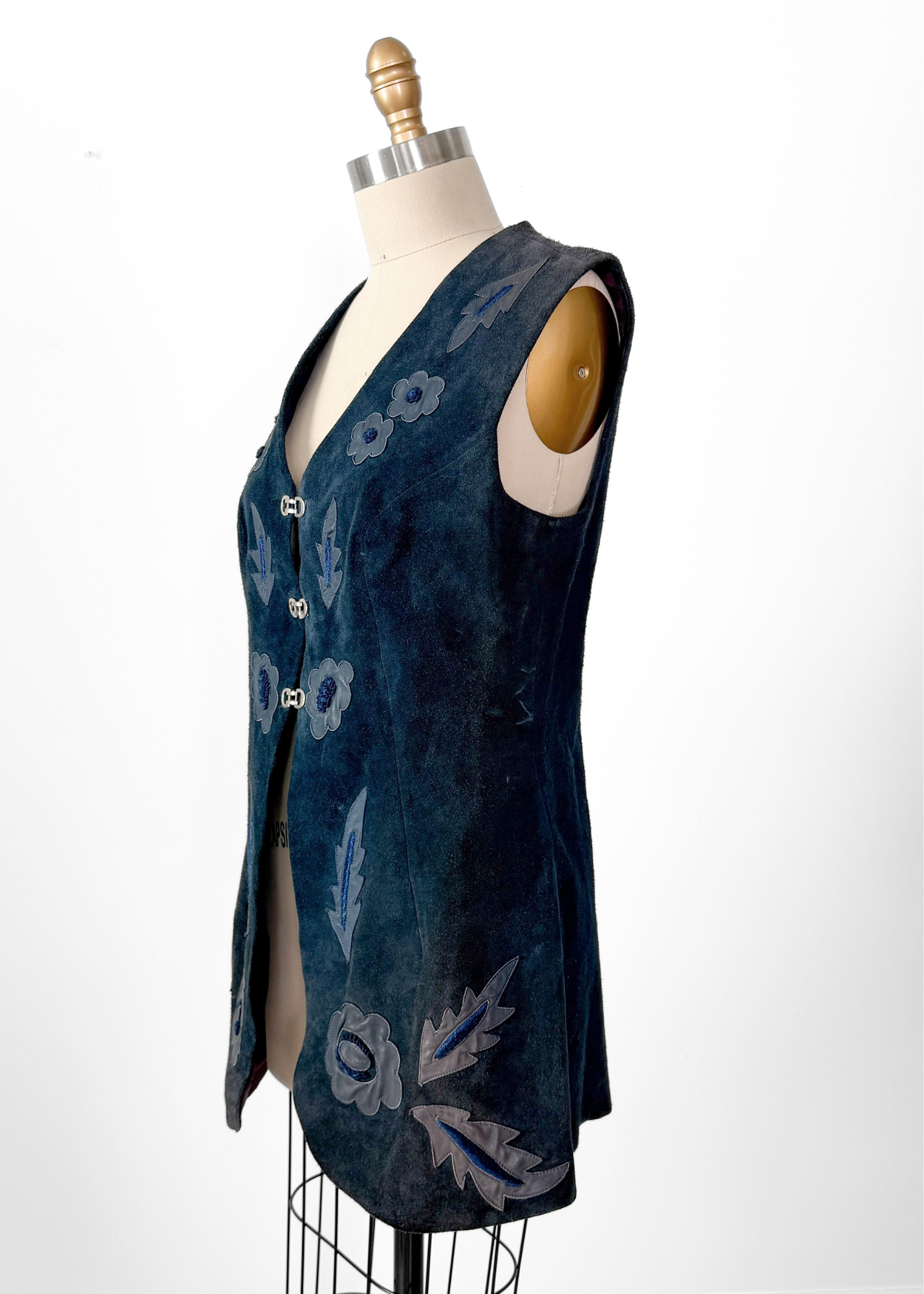 DETAILS: one of a kind navy blue suede and leather detail vest from the late 1960s or 1970s! Features leather embellishments and silver clasps on the front.