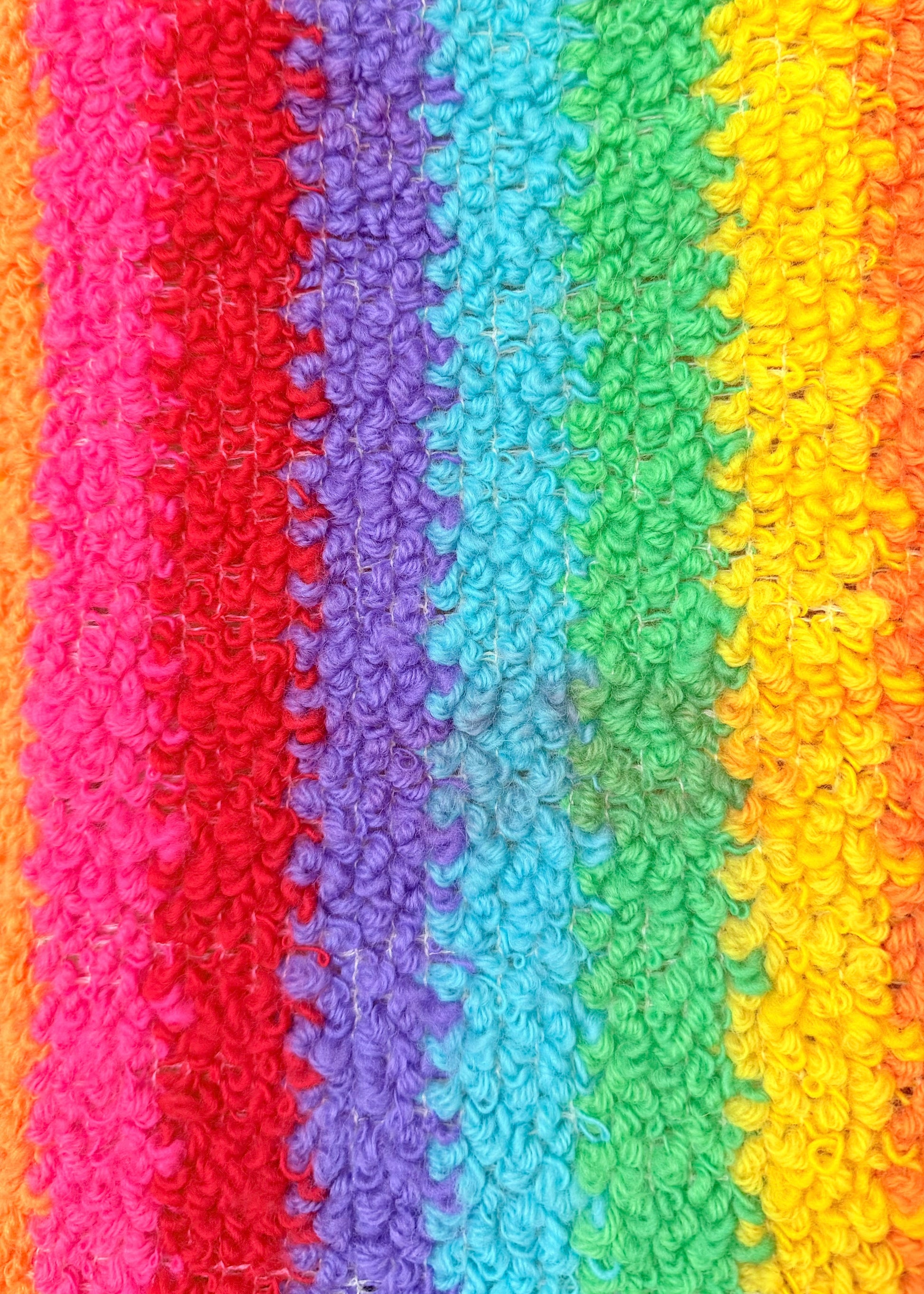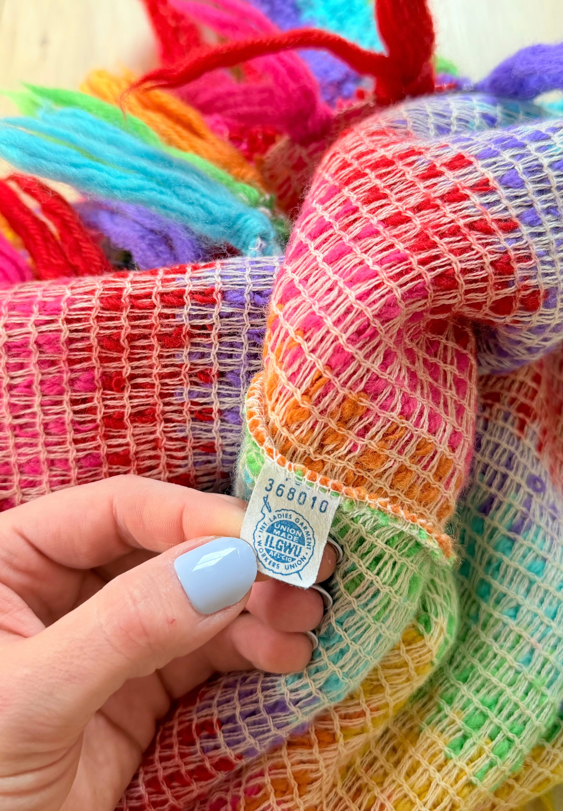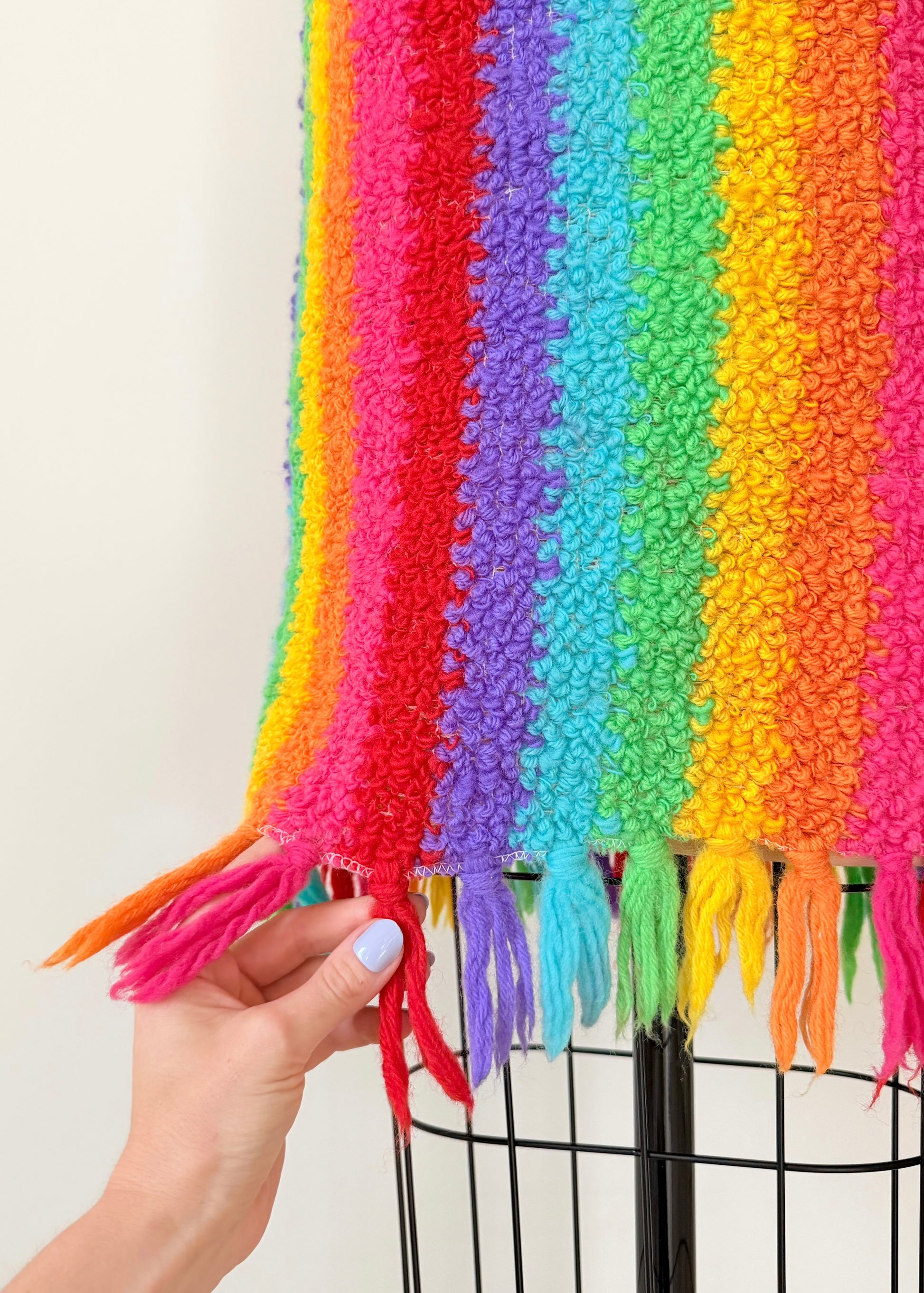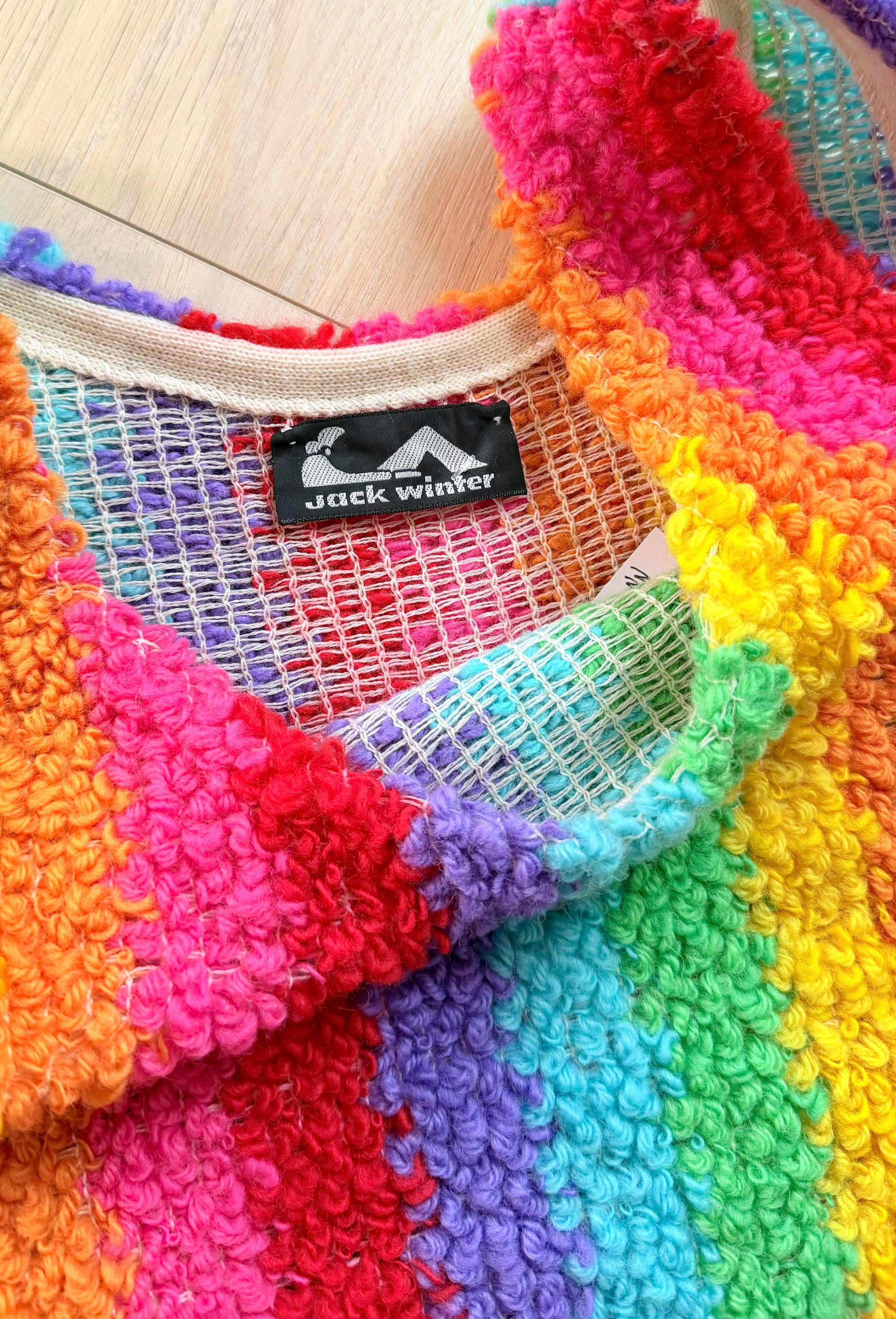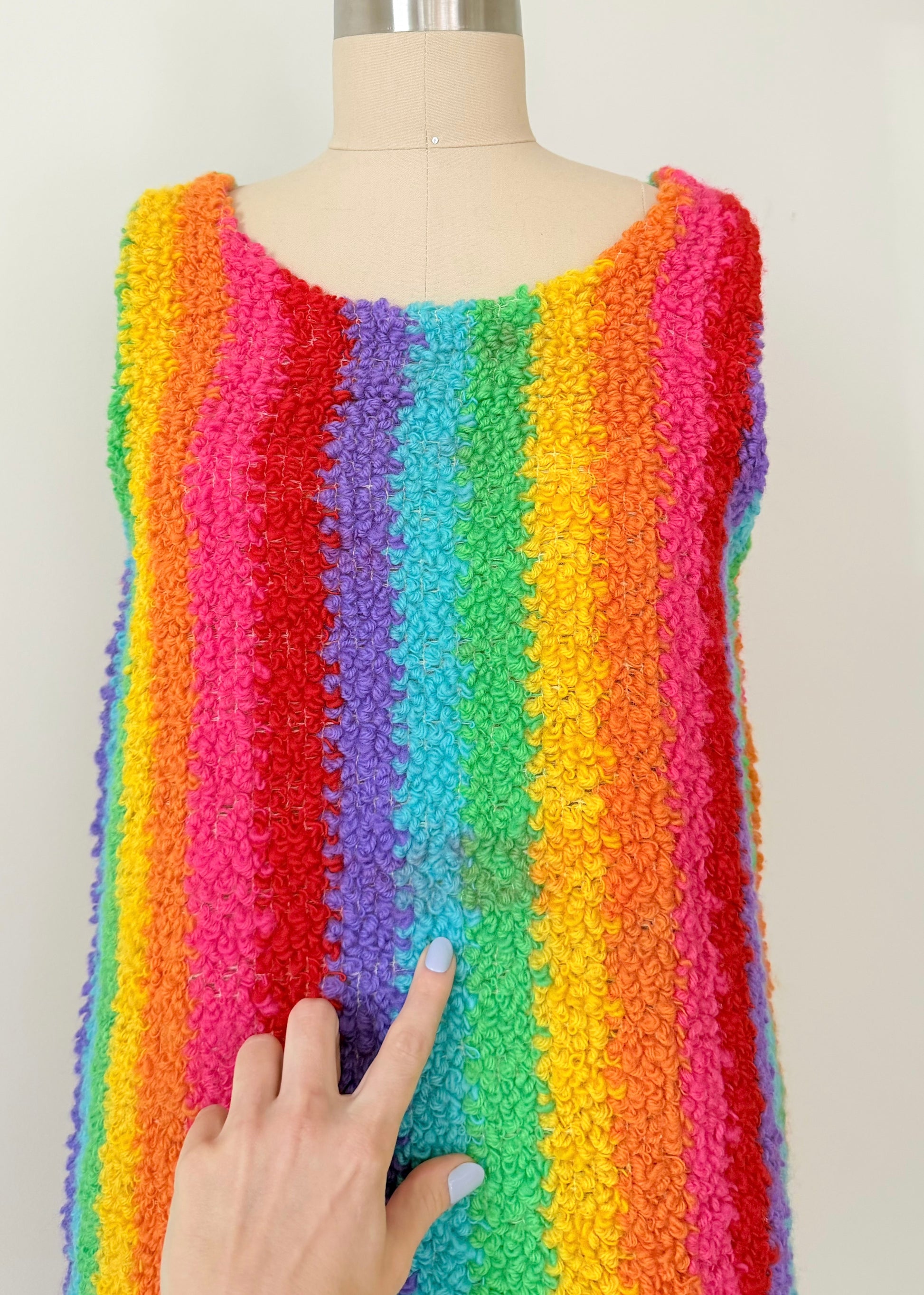 DETAILS: adorable and rare style by mid century designer, Jack Winter. Fun rainbow crochet with fringe hem shift dress.