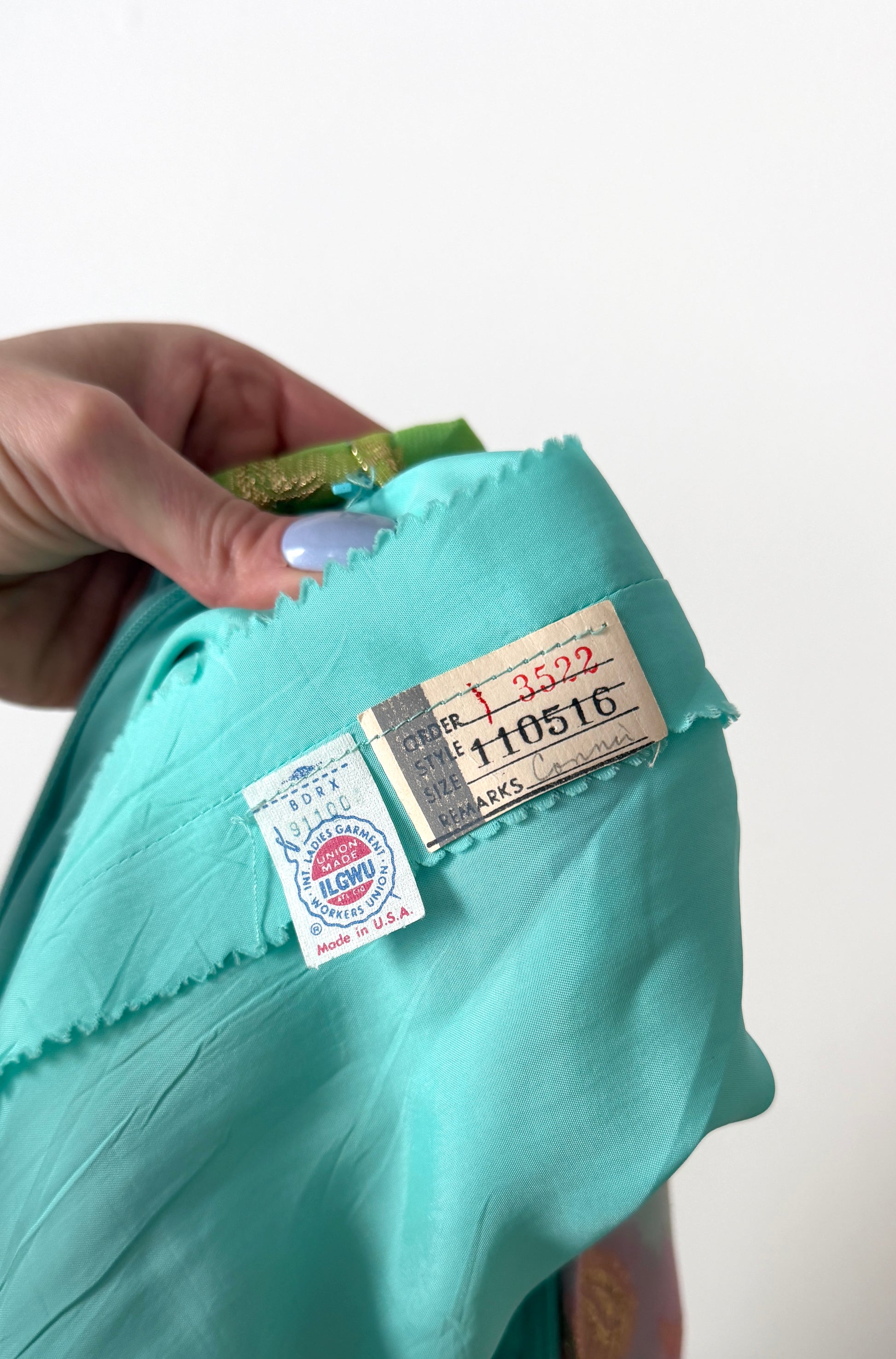 DETAILS: absolutely stunning dress from the 1960s by Nat Kaplan Couture! Features beautiful shades of aqua blue, lime green, soft pink and purple with gold designs throughout. Features bracelet length bell sleeves and it comes with a matching neck scarf you can style a number of ways.