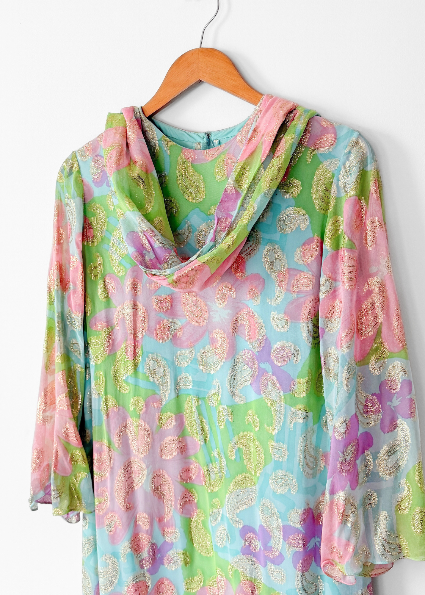 Vintage 60s Nat Kaplan Couture Green Blue Pink Floral & Metallic Thread Dress with Neck Scarf