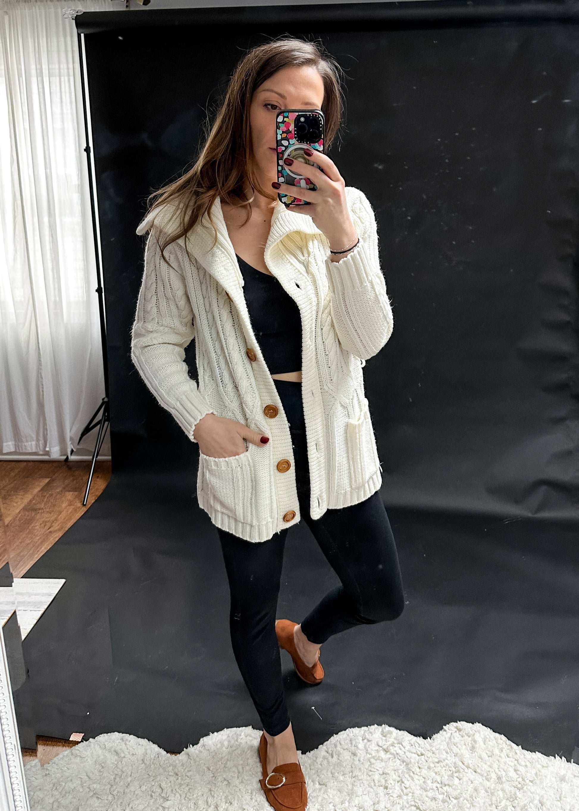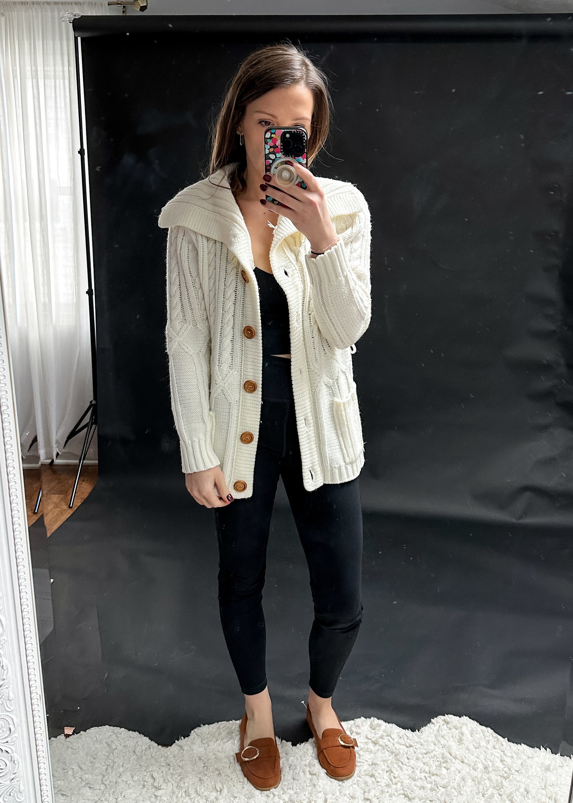 HOW TO STYLE/DETAILS: thick plush knit cardigan features wooden buttons down the front, pockets, a folded collar and belt loops so you can wear this belted! Or easily cut them out/ remove them if you wear the sweater without.