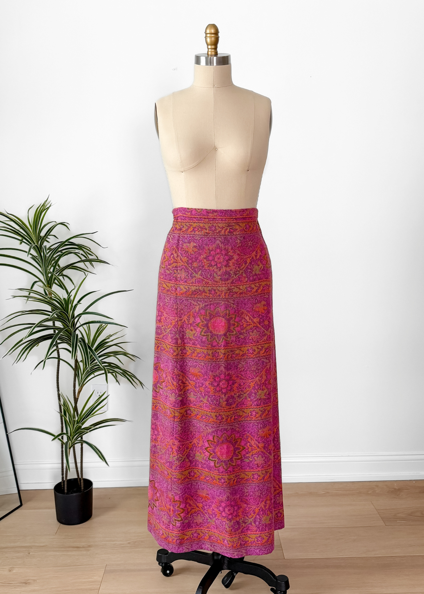 Vintage John Meyer maxi skirt crafted in a richly textured tapestry knit with vibrant pink, magenta, and warm orange tones. Features an allover floral and medallion pattern with a straight, column silhouette that drapes effortlessly.