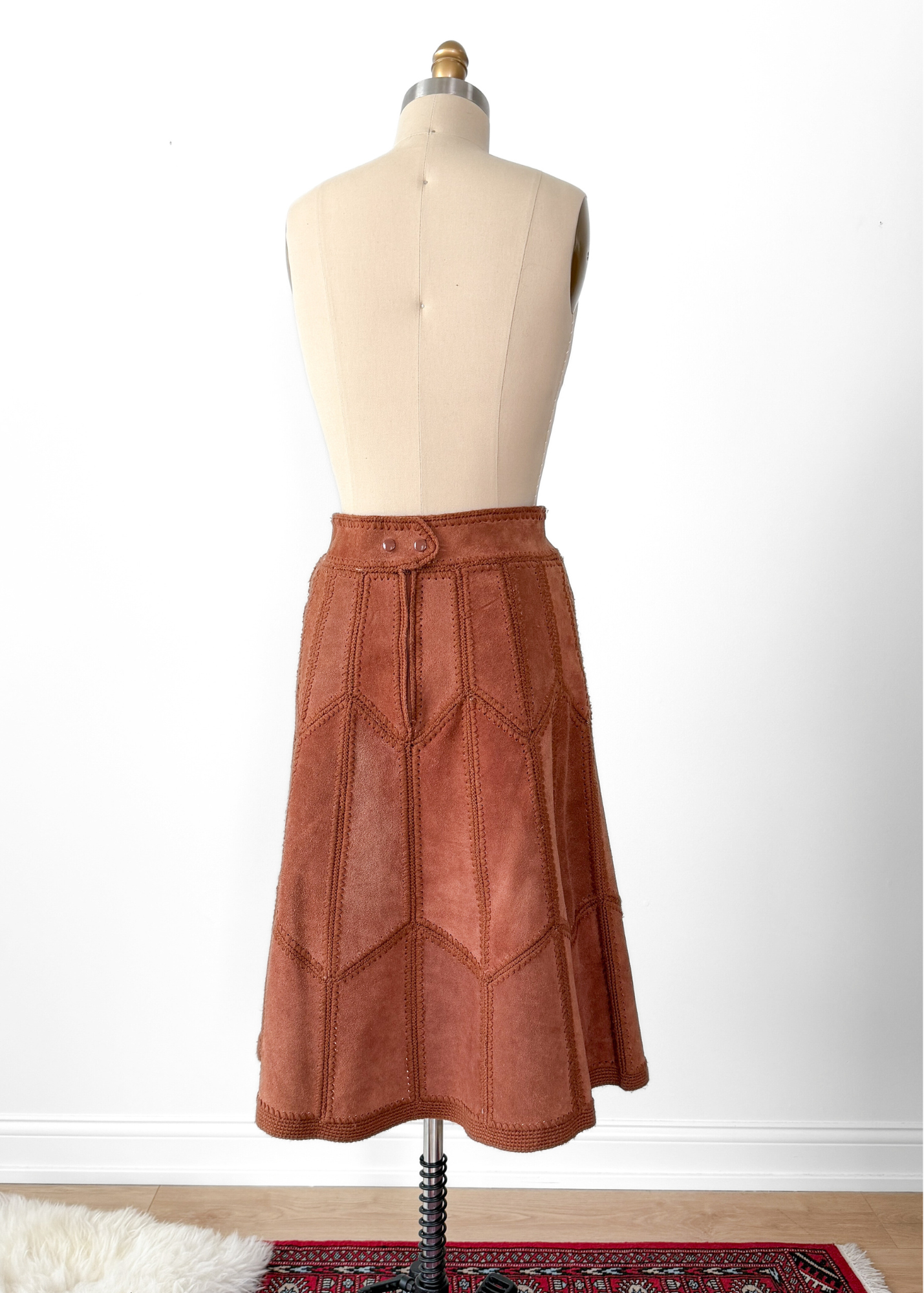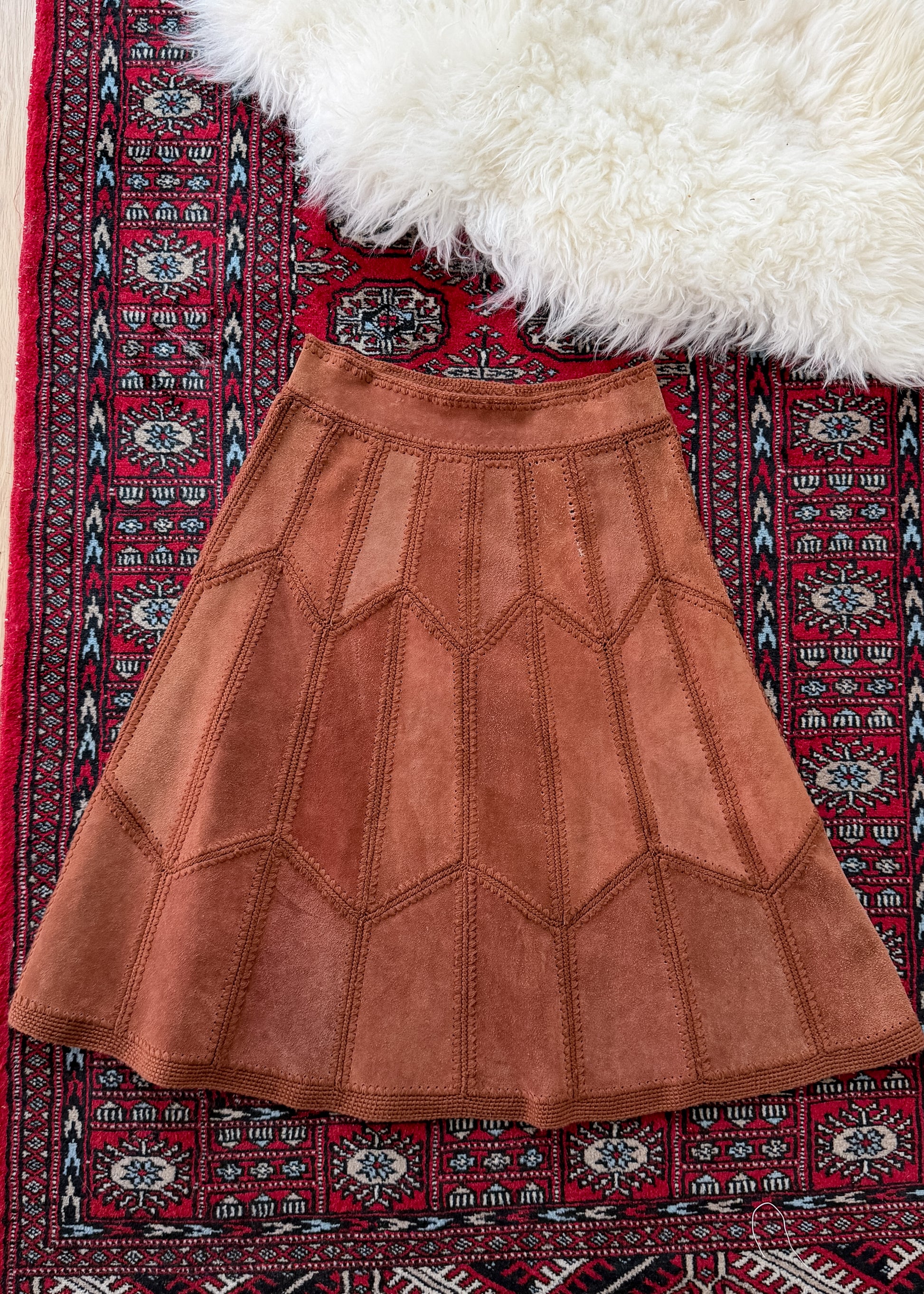 DETAILS: incredible warm brown suede patchwork skirt from the 1970s! Features a zipper and 2 snap buttons on the back and a flare a-line cut.