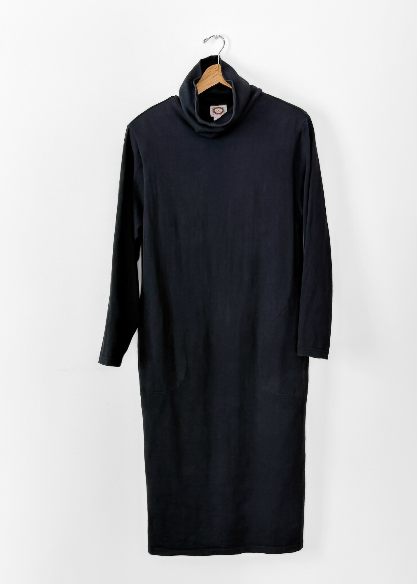 DETAILS: incredible dress from Banana Republic's 1987 catalog. Features an Italian cotton knit that gets better with time! Deep side seam pockets, relaxed turtleneck, vent slit on the back hem and built-in shoulder pads add structure to this relaxed style.