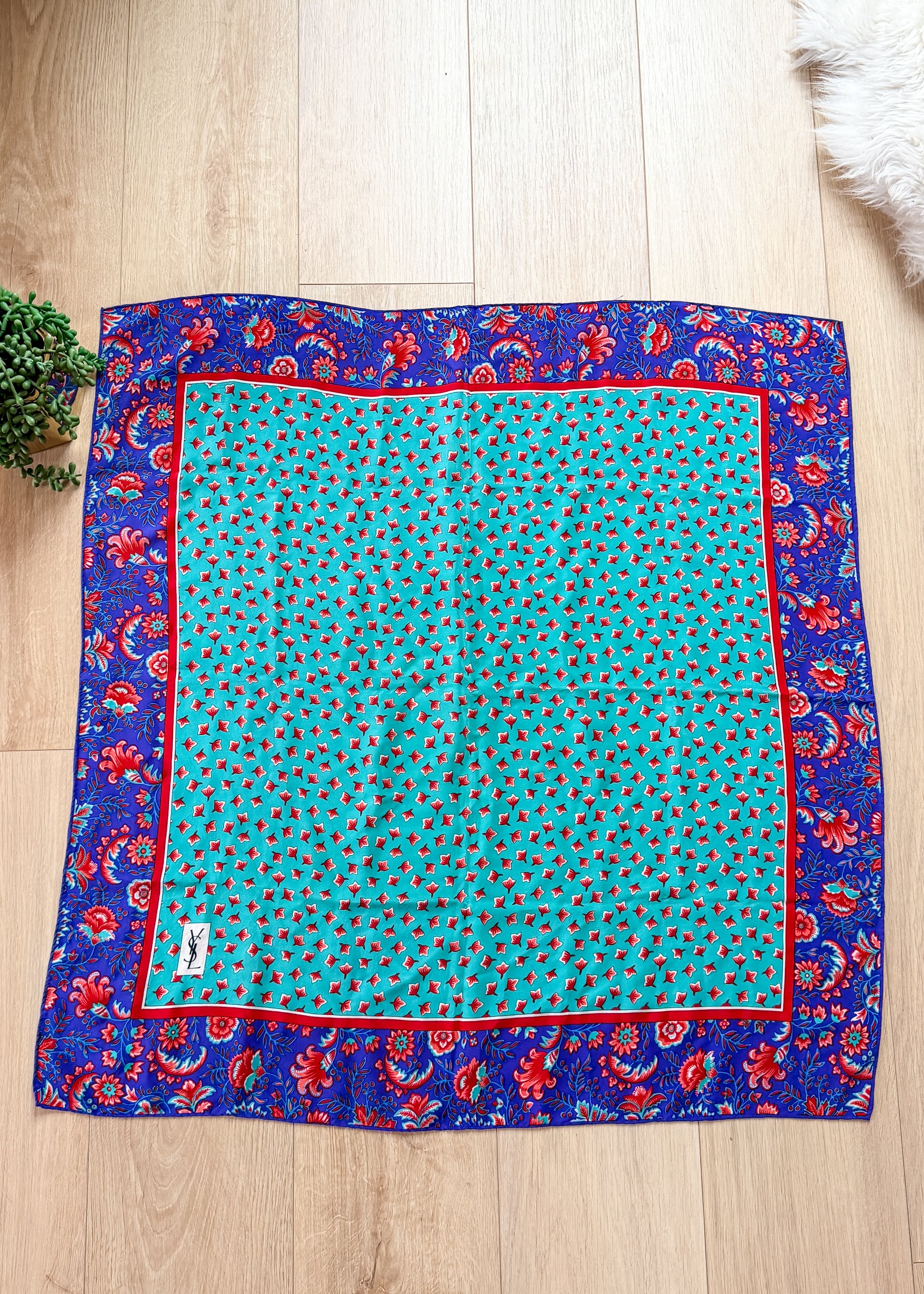 Stunning large silk scarf by YSL likely from the 1980s! 100% silk, hand rolled edges with a purple and pink floral border around a turquoise/teal design.