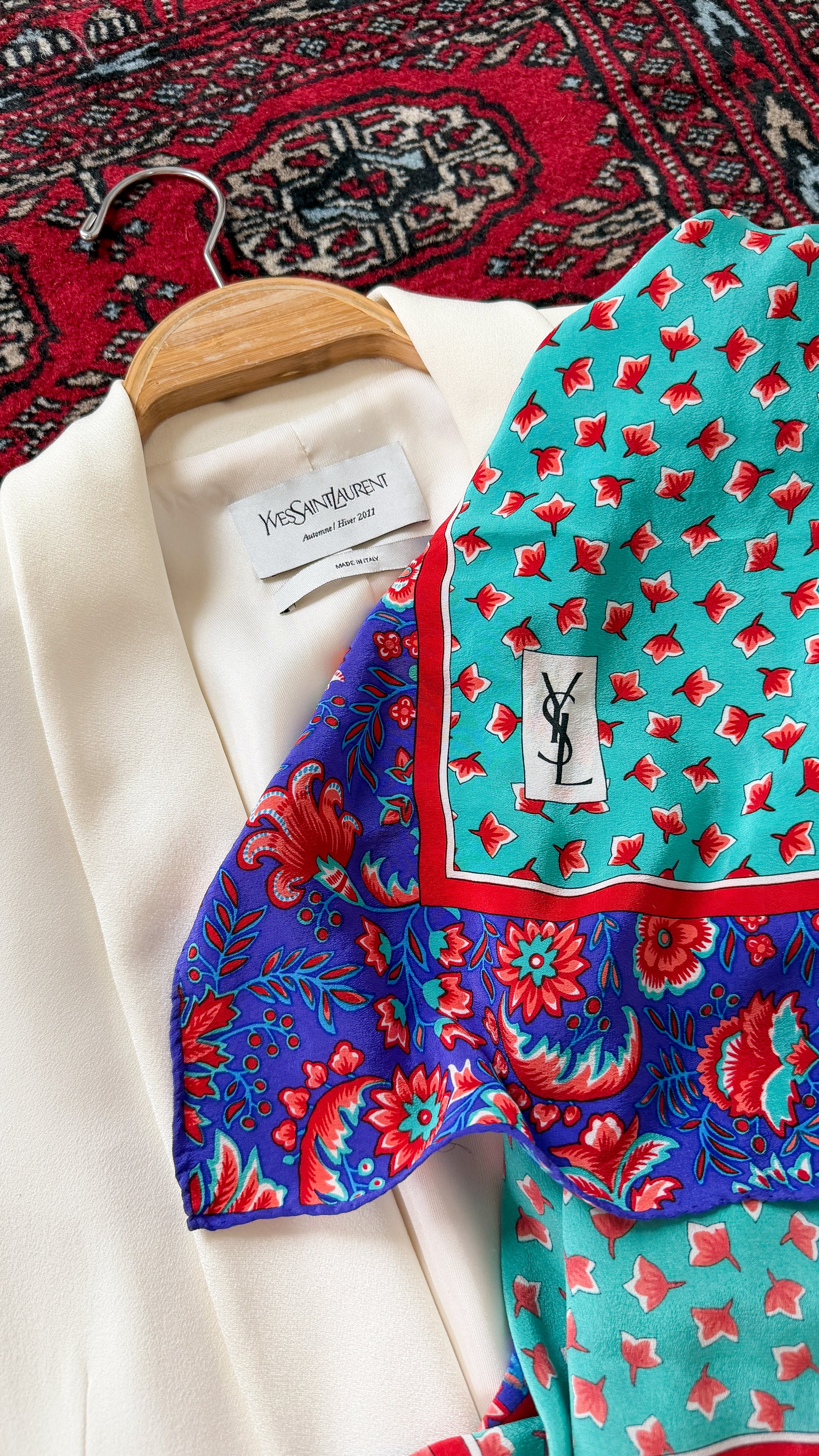 No holes or stains. Does not have original material tag attached which is common with these styles at this age, but it does have the YSL monogram on the front corner.