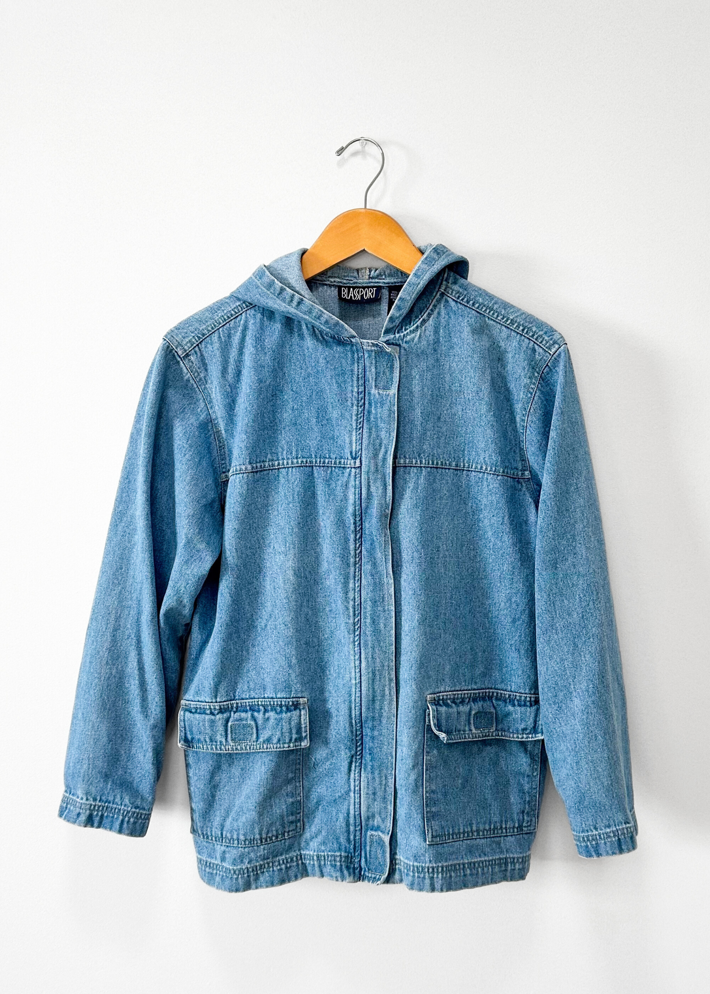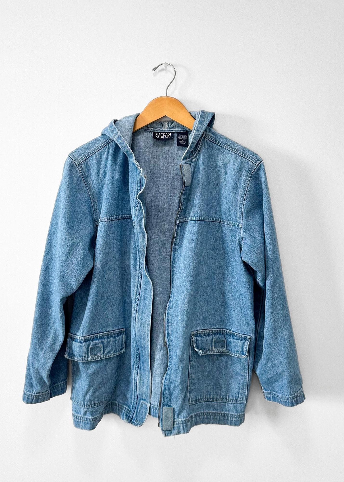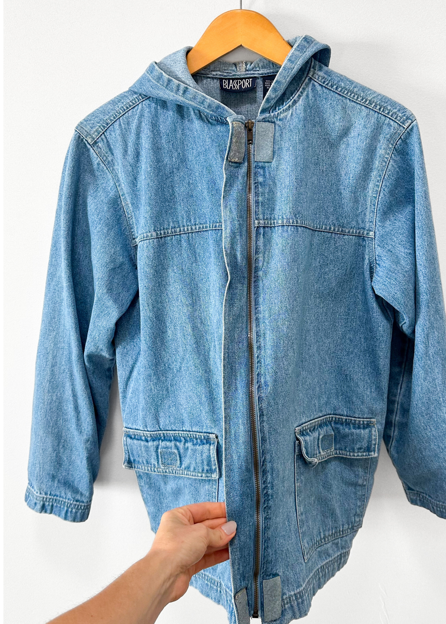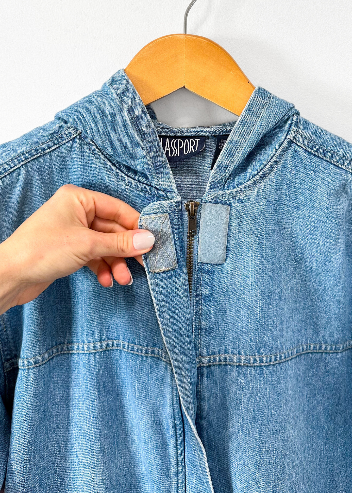 DETAILS: adorable medium wash denim jacket by Bill Blass features a front zipper and velcro closure, attached hood and velcro front pockets.