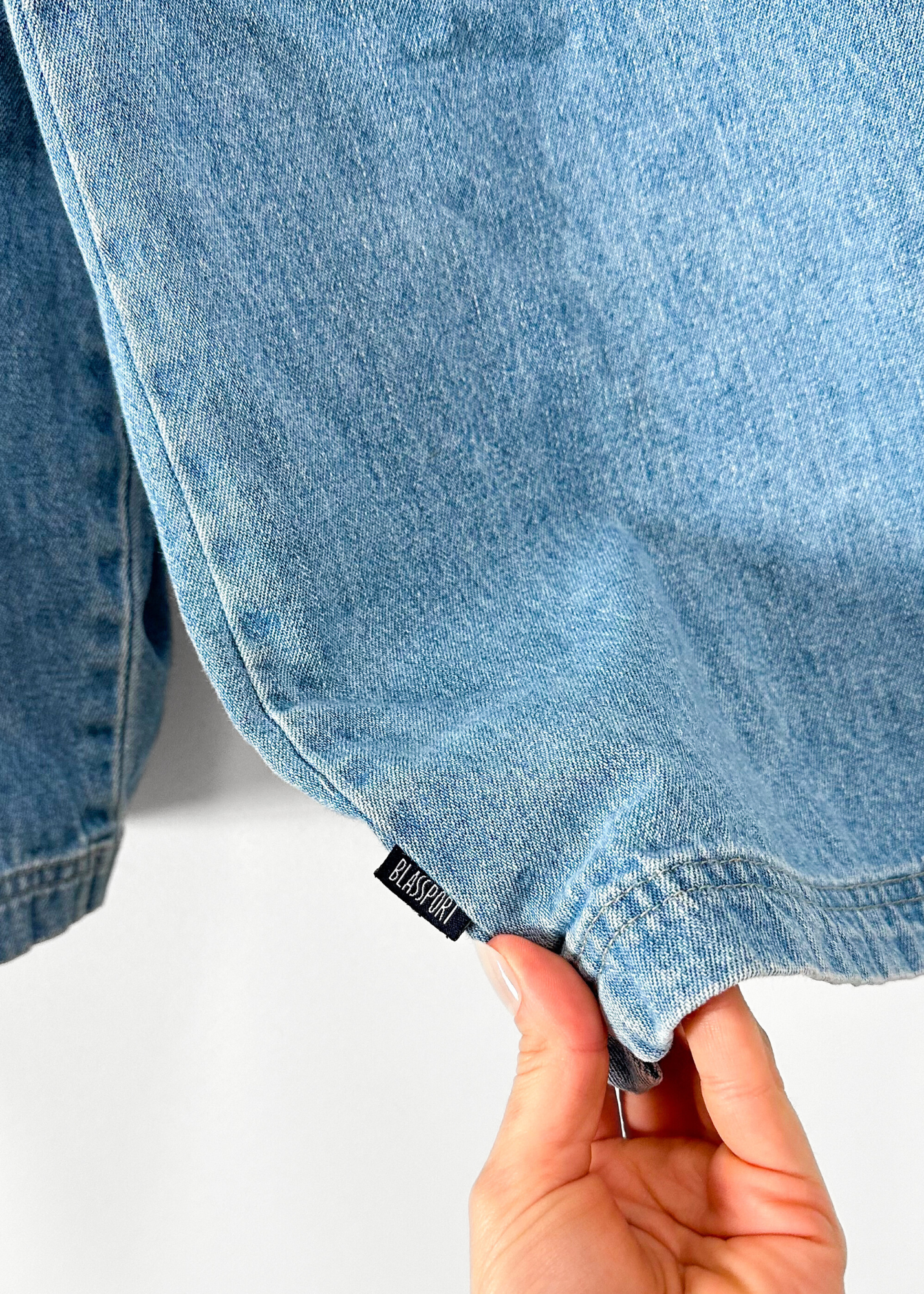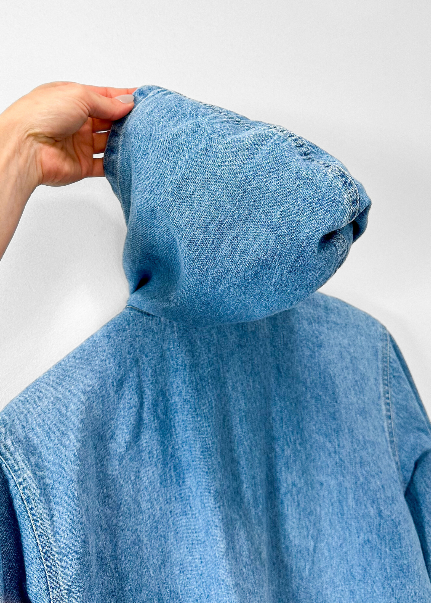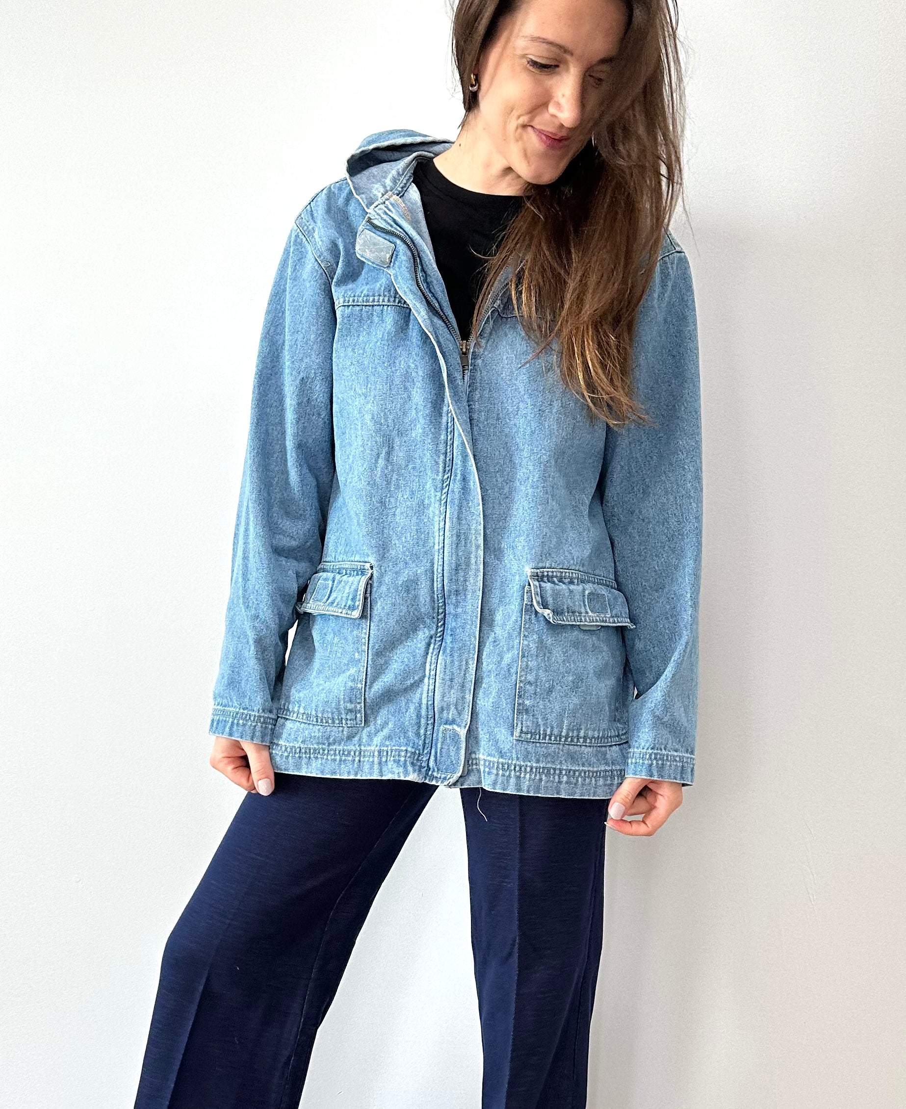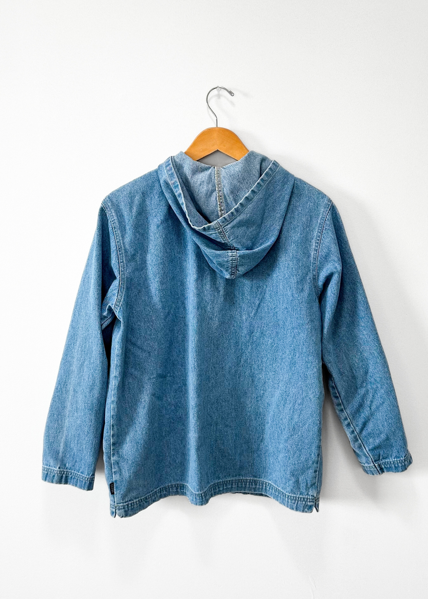 DETAILS: adorable medium wash denim jacket by Bill Blass features a front zipper and velcro closure, attached hood and velcro front pockets.