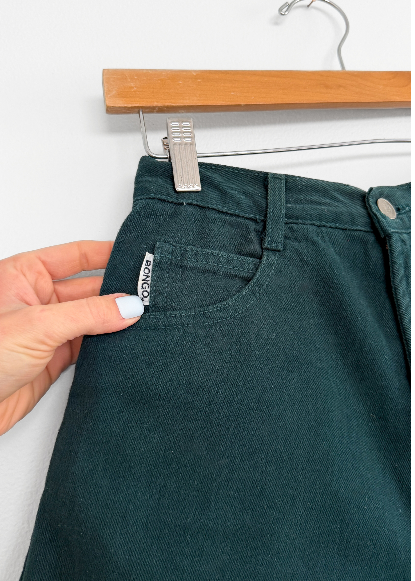 DETAILS: classic high waist shorts by Bongo from the 90s! Features a large patch on the back, a zipper fly with button and 5 pocket style. Color is a dark green.