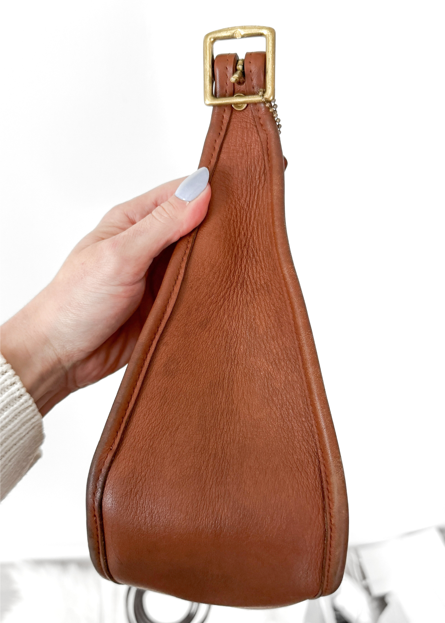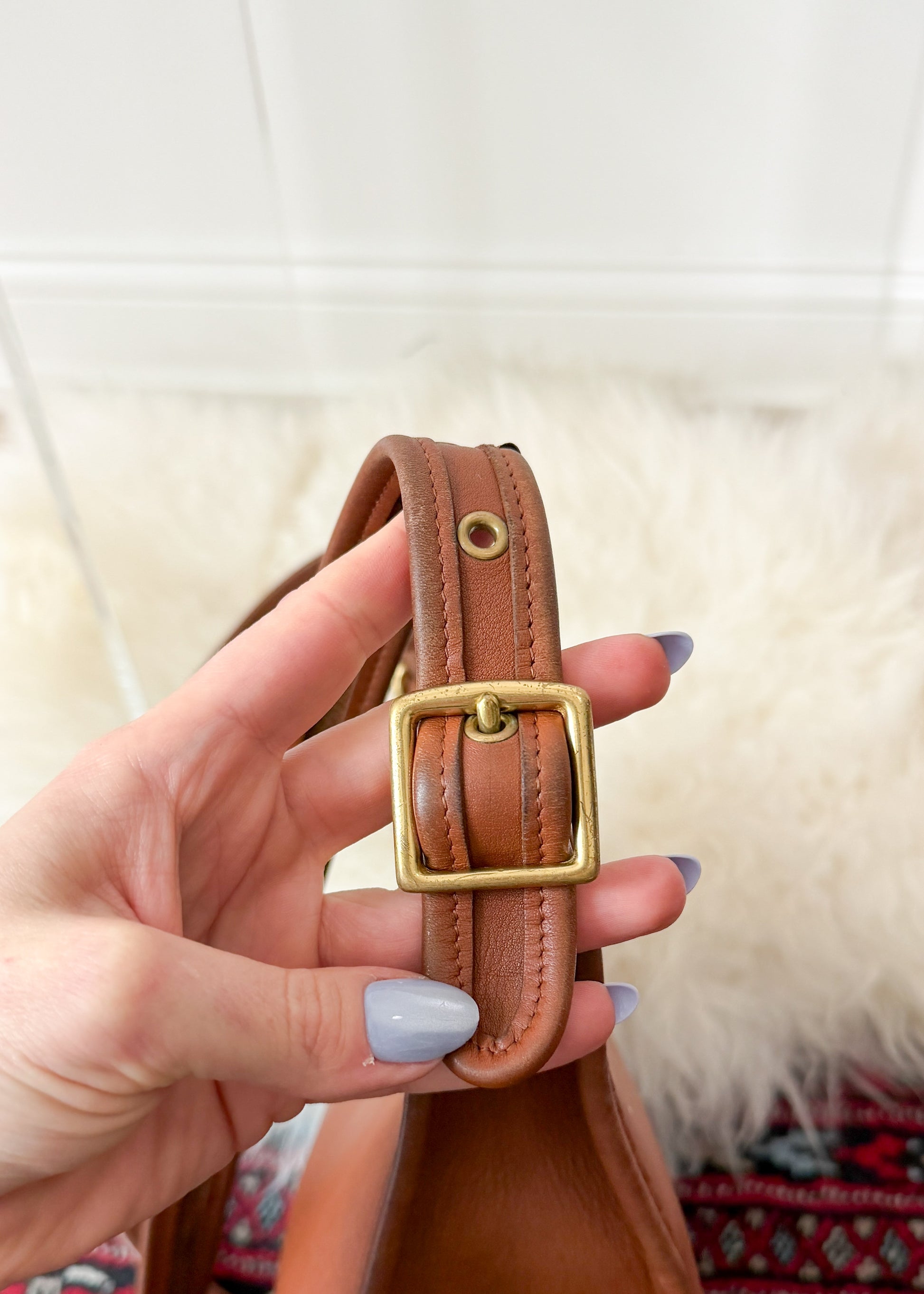 Beautiful British Tan glovetanned leather Janice purse features brass hardware, adjustable shoulder strap (comes with an unoriginal heavy gold chain, too!), zipped top and interior pocket.