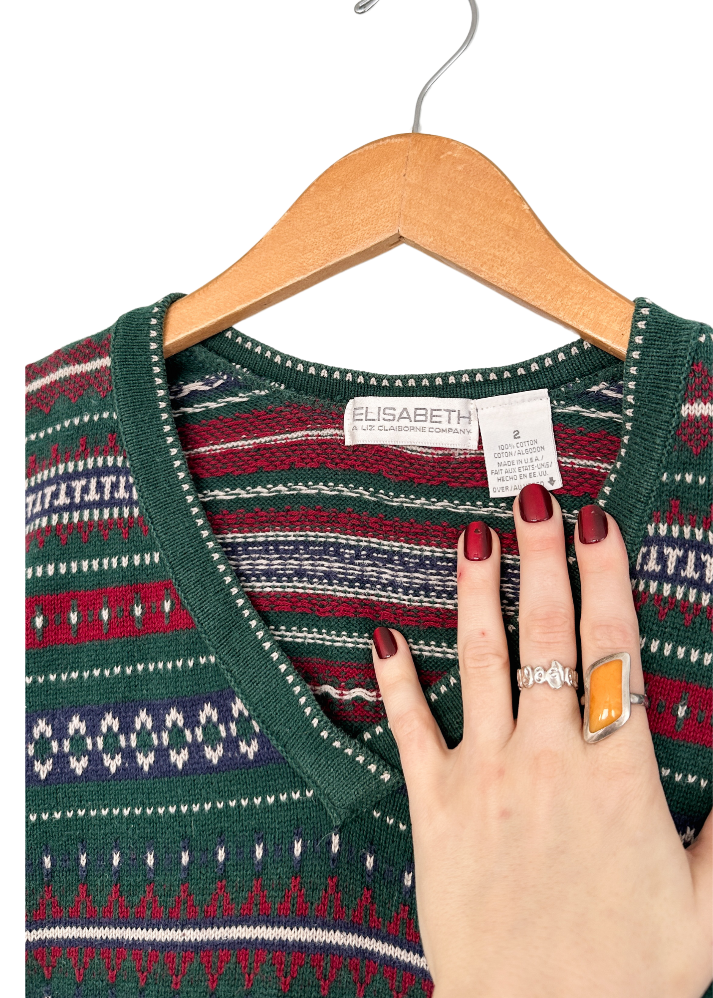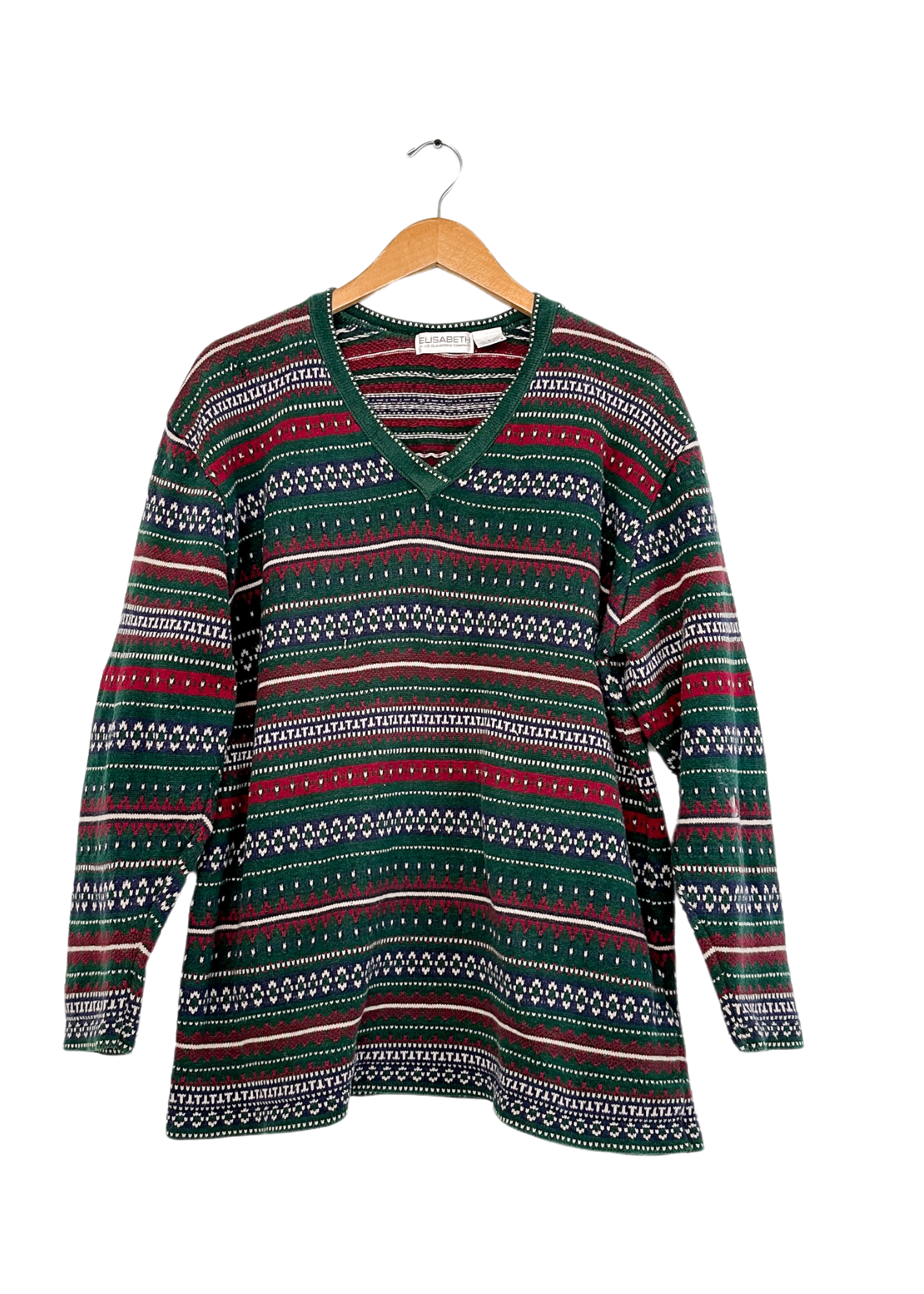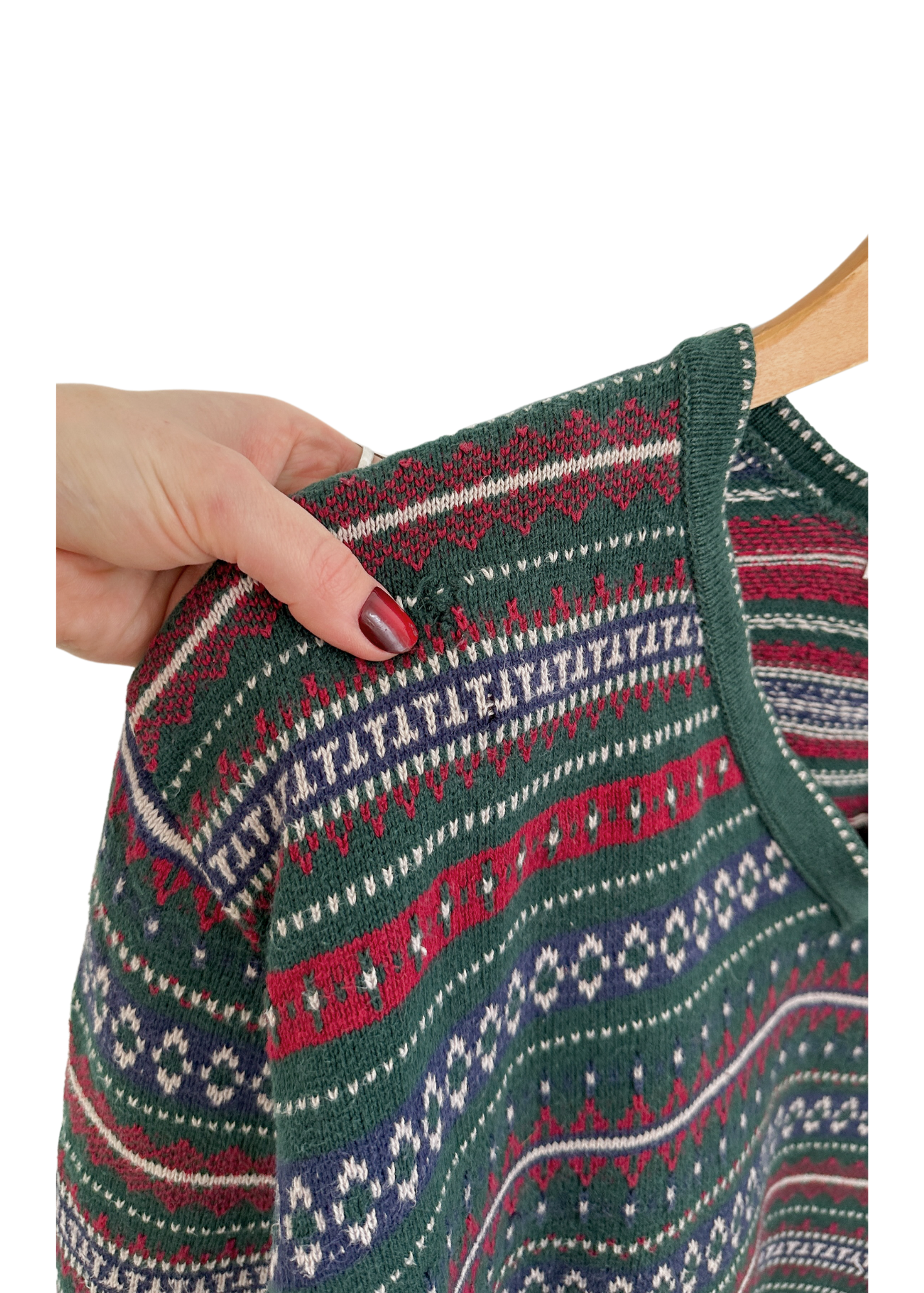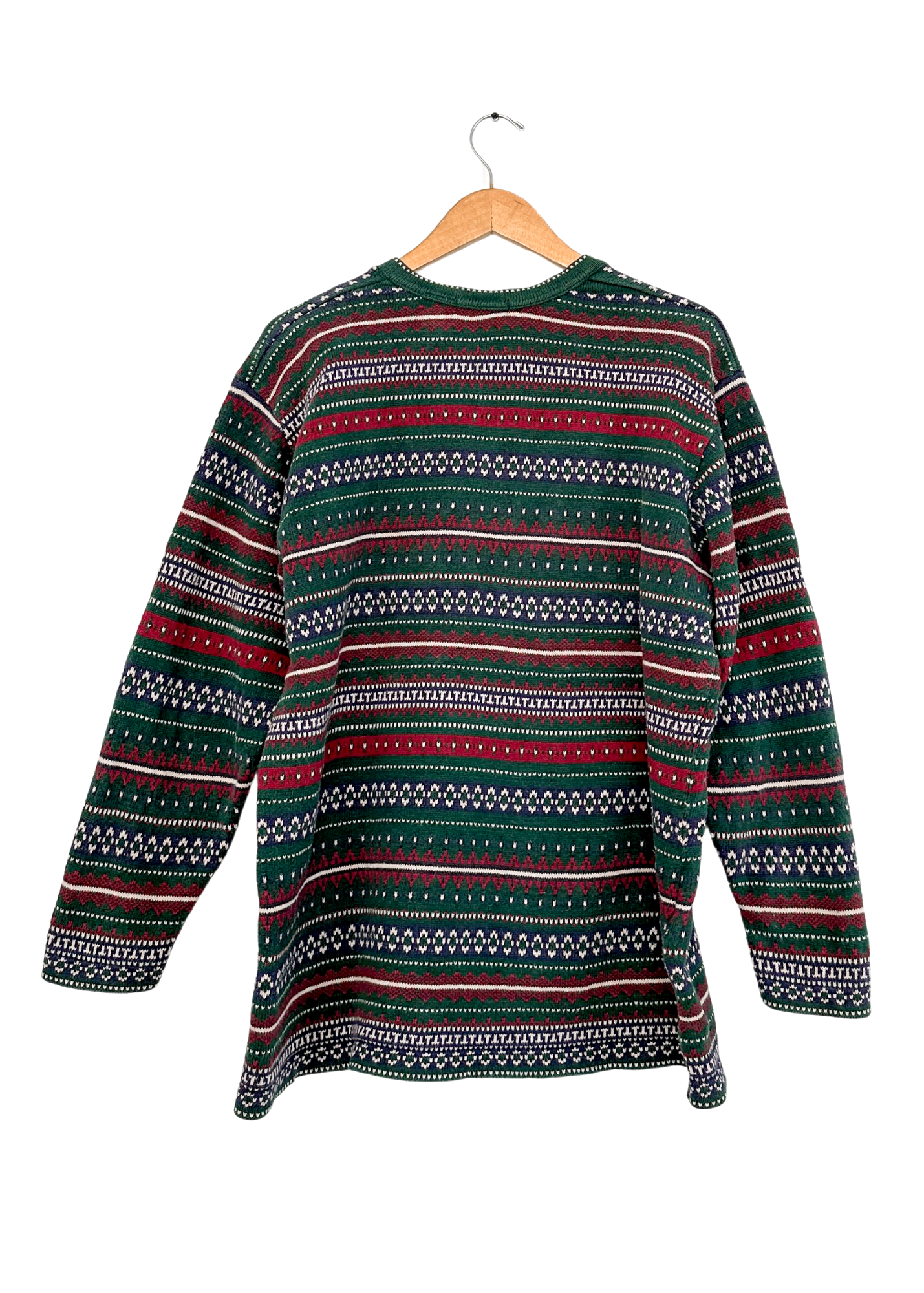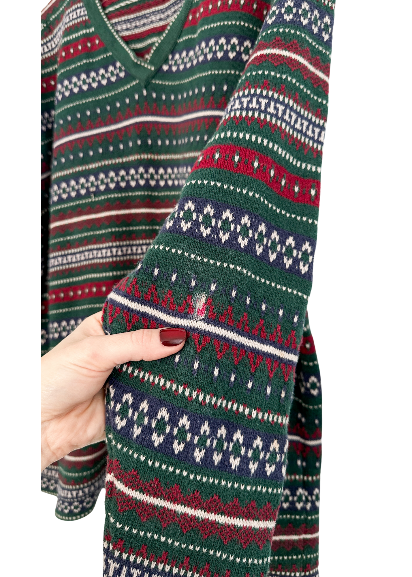 Green, red and dark blue stripe pattern knit from the 90s. Features dropped shoulders and a v-neck.