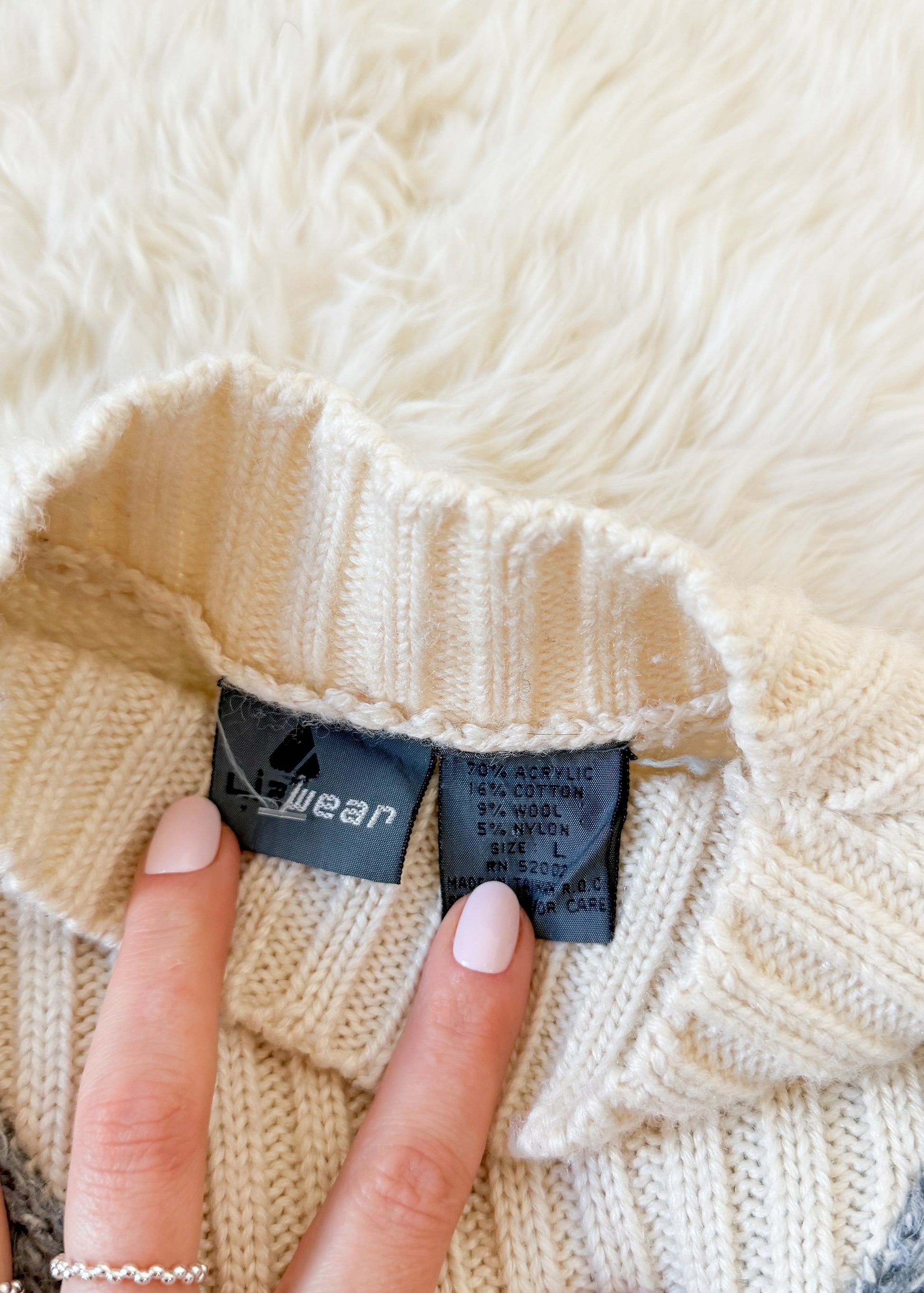 DETAILS: beautiful vintage knit by Liz Sport features an on-trend argyle pattern in cream, blue/gray and dark gray with speckles of red and gold, mock neck and dropped shoulders.