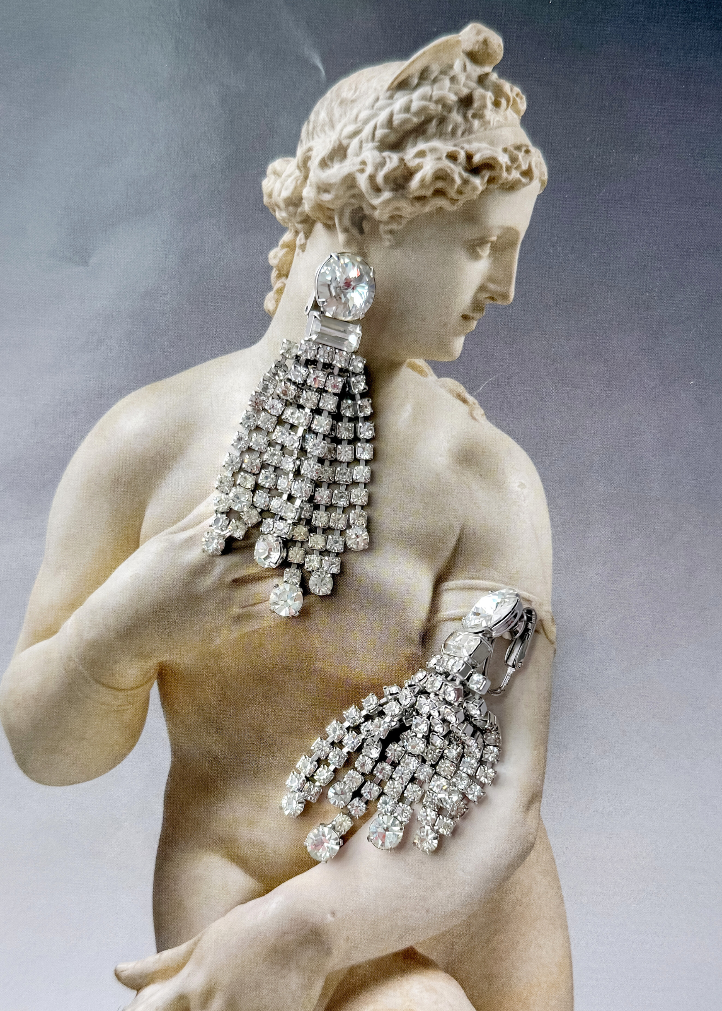 Pure vintage glamour ✨ These stunning vintage clip-on earrings feature a dramatic chandelier design composed of cascading clear rhinestones in a bright silver-tone setting. The design begins with a large round crystal at the top and flows into articulated strands of sparkling stones that shimmer and move beautifully with every step.