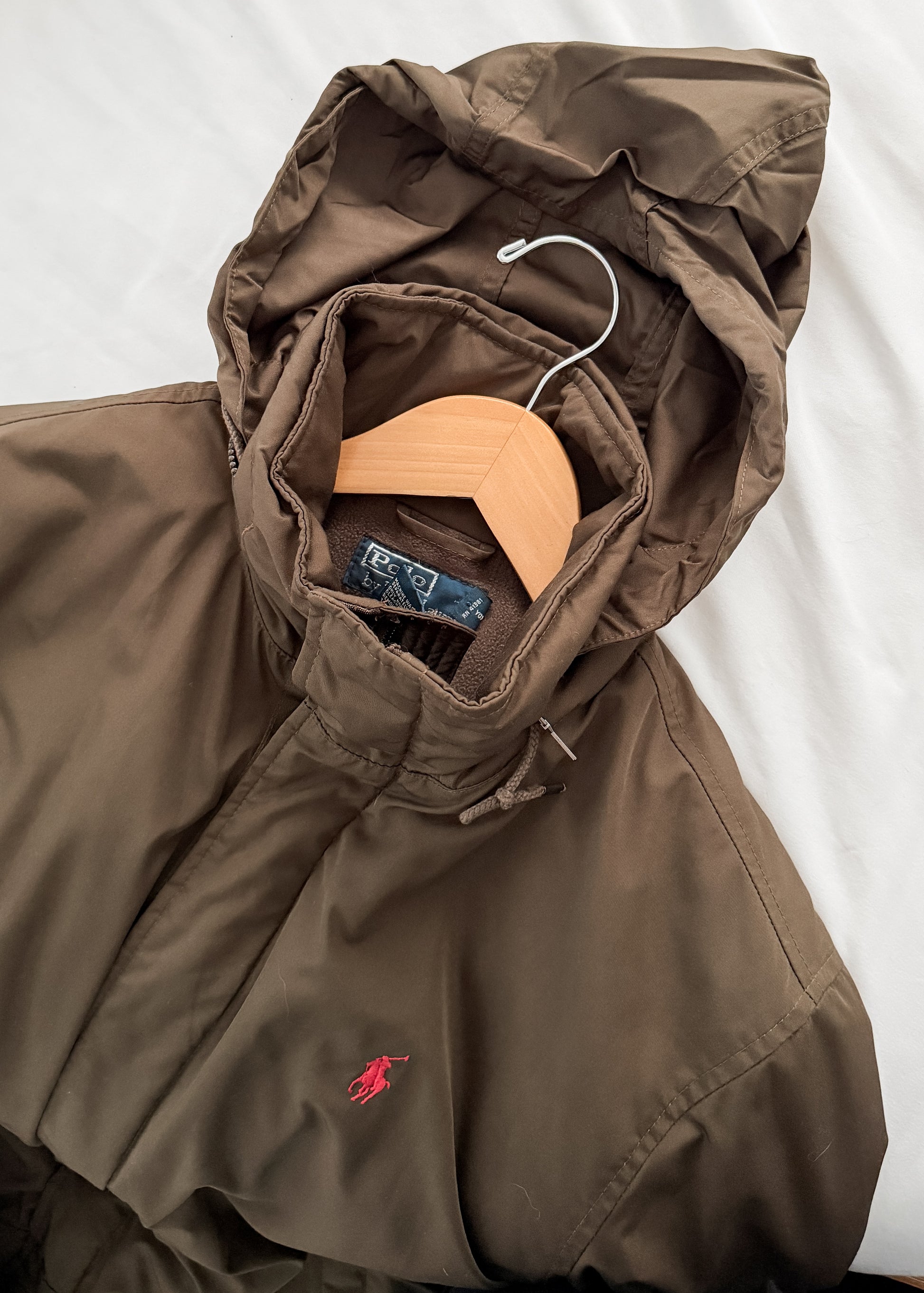 DETAILS: classic style jacket is perfect for chilly days! Features a neutral olive green/brown color, red polo logo on the front, zipped pockets, snap buttons on the cuffs, down the front over the zipper and at the waist to tailor the fit. Also has a zipped hood that can be tucked in the collar!