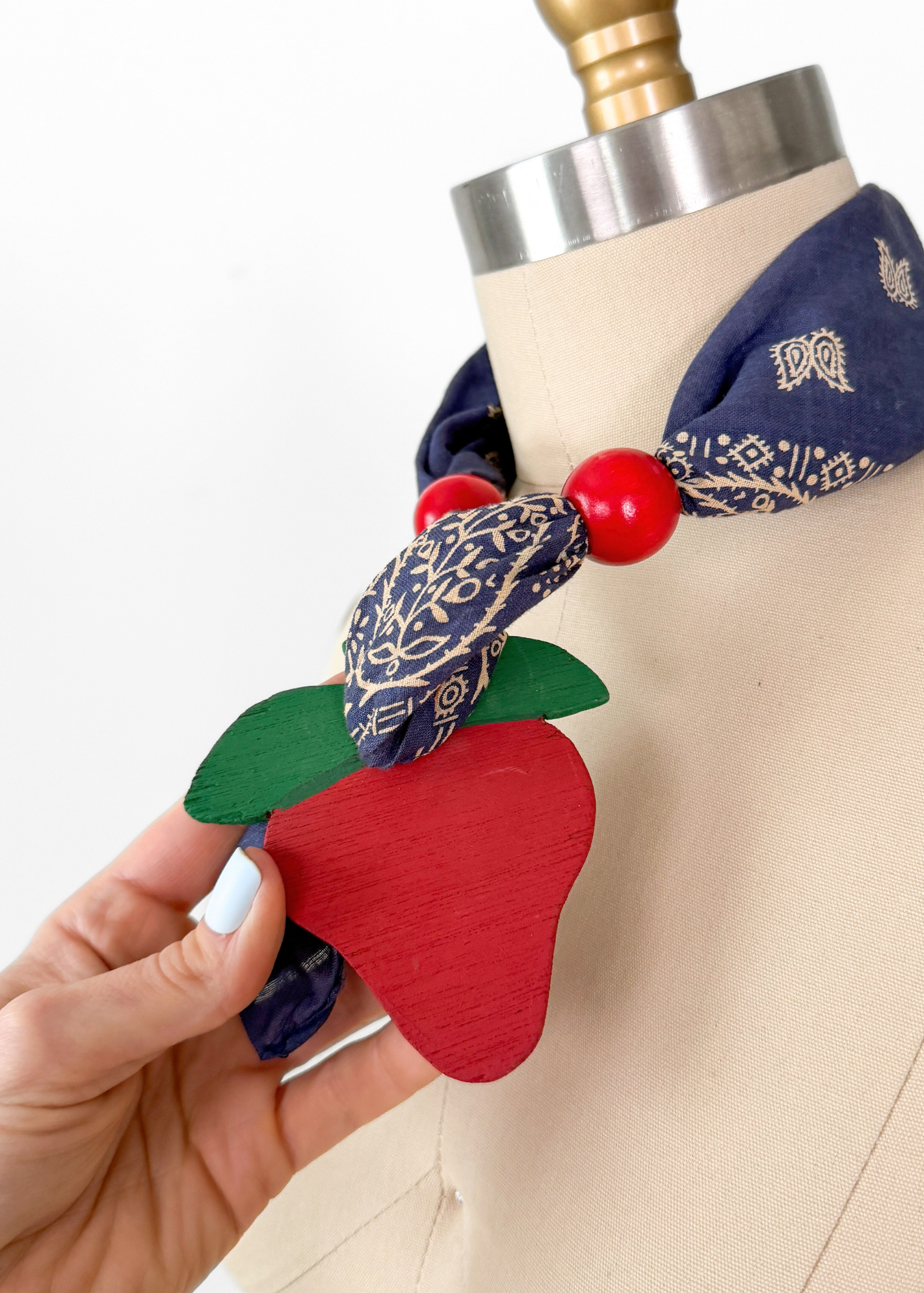Unique bandana necklace features a wooden strawberry pendant and red wooden beads.
