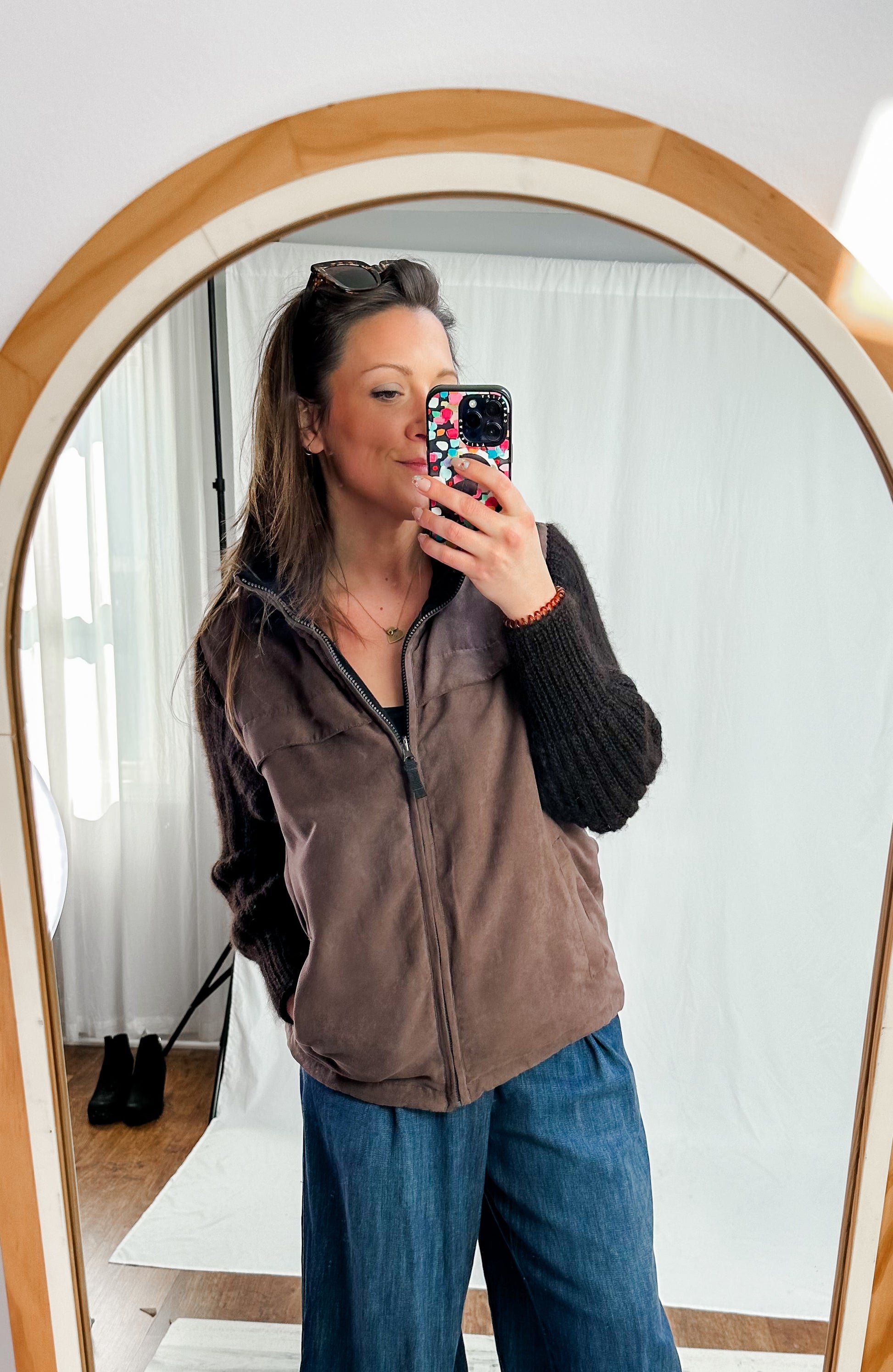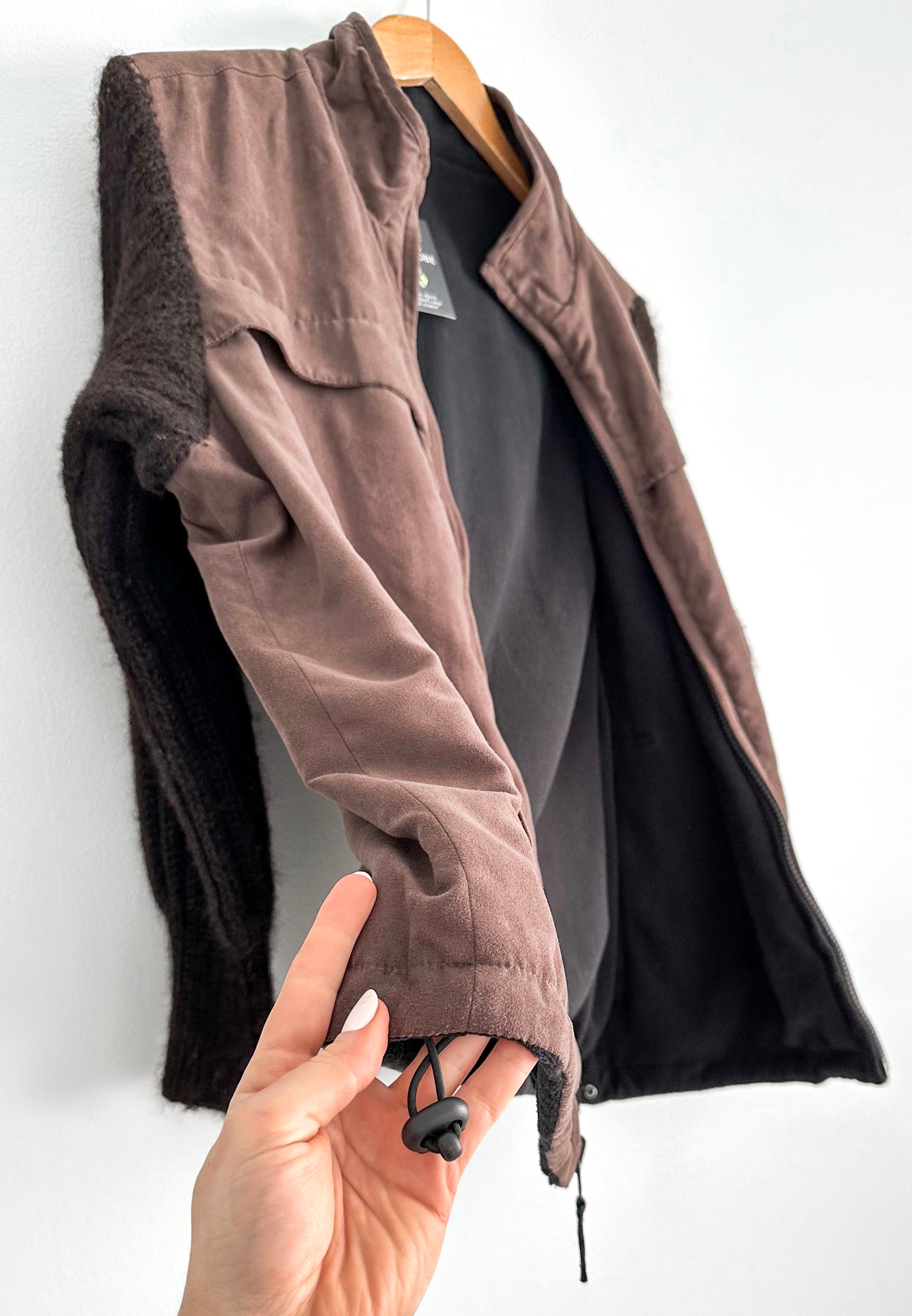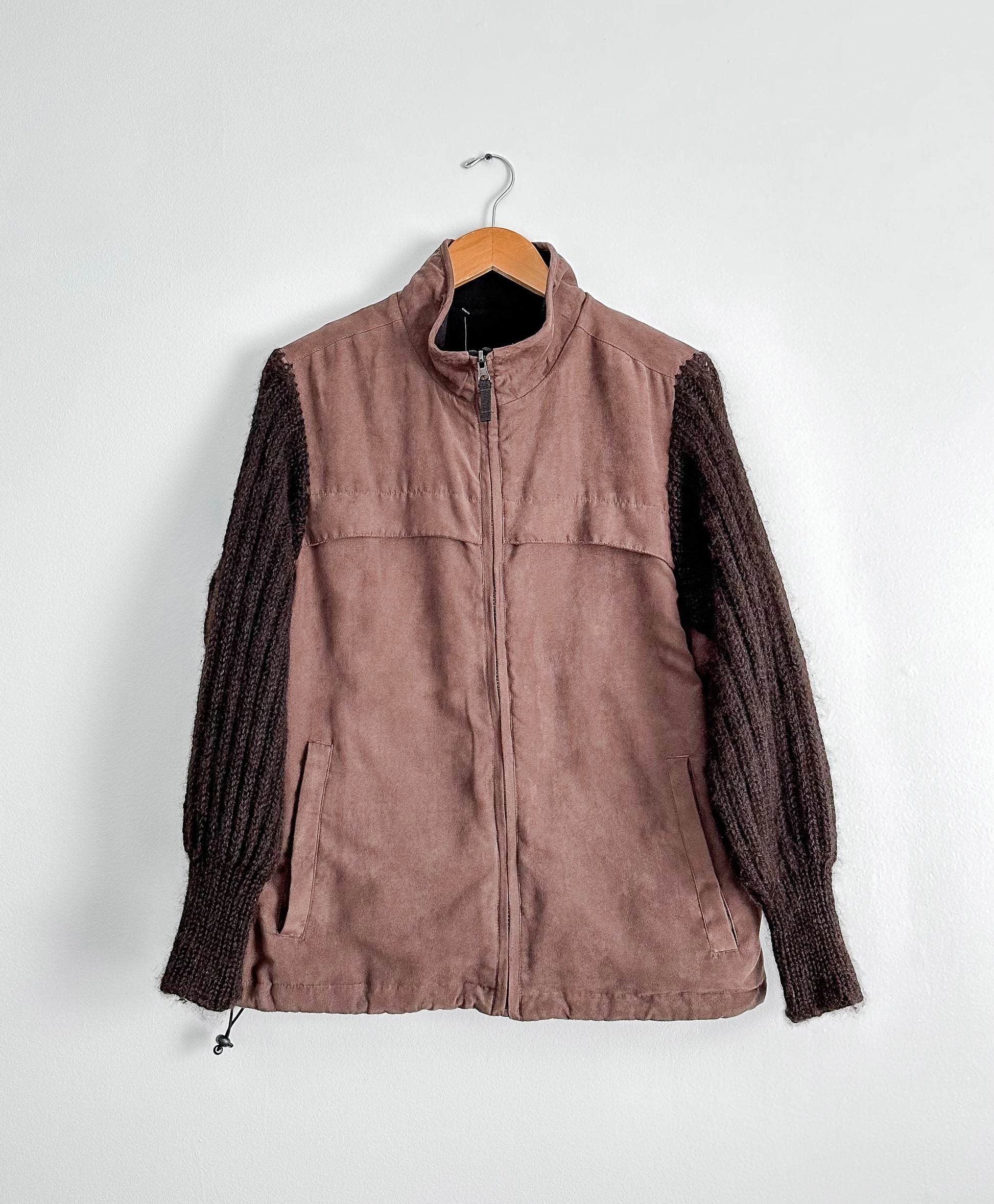 HOW TO STYLE/DETAILS: adorable zipped jacket featuring a suede like body, dark brown knit sleeves and velcro pockets at the sides as well as an elastic/clasp hem to keep the cold air out!